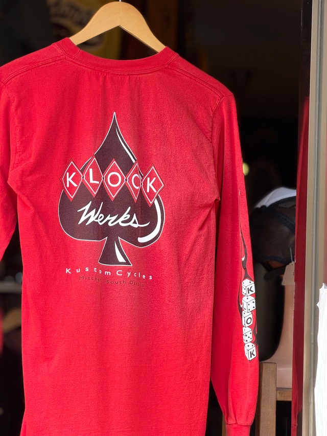 00's KLOCK WERKS Kustom Cycles 長袖Tシャツ Sサイズ レッド 袖プリント スリーブプリント 袖フレイムス ファイヤーパターン スペード ダイス サイコロ バイカーファッション アメカジ 古着 フェード ロンT