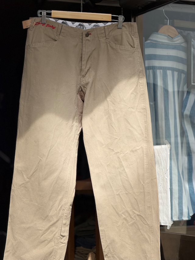 【詳細】 残念ながらBEN DAVISではありませんが、フリスコパンツタイプのチノパンです。 1992年にプロスケーター"Johnny Schillereff"よって設立されたスケートボードブランド"ELEMENT" そのELEMENTの中でも、90~00年代にハイスピードかつ力強いスケーティングを見せて活躍したイーストコーストを代表するレジェンド"Donny Barley"氏とのコラボラインである"BURLEYS"のチノパンになります。 ハードなスケーティングに耐えうるようコットン100%のしっかりした生地を使用し、動き易さを確保するために股下にはストレッチ素材を採用。 右裾に何故かマジックテープ付きの隠しポケット、裾にスリットが設けられています。 意味わからなくも無いという、なんとも絶妙な嬉しいポイント。 フロントポケットはL字型のフリスコパンツタイプのモノが採用されています。 トップボタンはスナップではありませんが。 タグやベルト裏はBEN DAVISのパロディを感じさせる、なんとも遊び心の効いたデザインです。 BEN DAVISやビンテージではないので、お手頃価格のフリスコタイプだと思います。 実寸サイズはW32×L30になります。 全体的にやや使用感を感じますが、目立ったダメージや汚れも見受けられず状態良好となります。 【商品形状】 スケートパンツ 【商品カラー】 カーキ(ベージュ) 【商品素材】 コットン100% 【ブランド】 BURLEYS ELEMENT SKATEBOARD 【製作国】 中国 【商品状態】 A (SS)デッドストック、ワンウォッシュの商品 (S)汚れ、使用感がほぼなく美品の商品 (A)多少の使用感、僅かな汚れやダメージがあるが気にならない程度の状態良好の商品 (B)使用感、汚れやダメージがあるが着用に支障はない商品 (C)大きなダメージや使用感がある商品 【商品サイズ】(実寸、インチ表記) W32×L30 ※平置寸法 ※多少の誤差はご了承ください