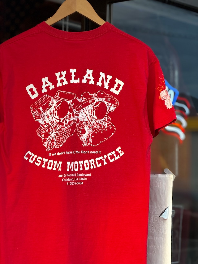 90~00's "OAKLAND CUSTOM MOTORCYCLE" 半袖Tシャツ Lサイズ 赤 レッド fruit of the loom フレイムス ファイヤーパターン バイカーTシャツ ナックルヘッド パンヘッド ショベルヘッド エボリューション エンジン ハーレーダビッドソン harley davidson hells angels sonny barger