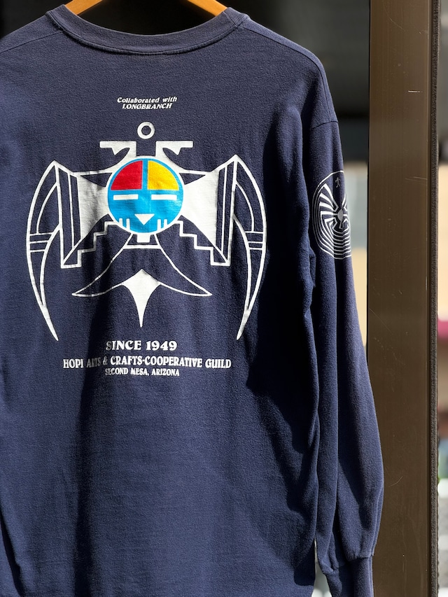 90~00's "HOPi arts & crafts co-op GUILD" 長袖Tシャツ Mサイズ ネイビー ホピ族 インディアンジュエリー ロンT ロングスリーブ 袖プリント サンフェード 褪色 古着 アメカジ ネイティブ