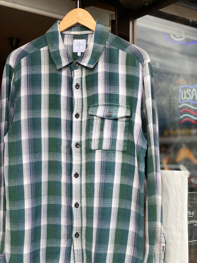 【詳細】 そういえば載せてなかったんですが、コレも中々アツいです。 70~80年代頃と思われる、Macy's men's storeのウールシャツになります。 ただの配色の良いチェックシャツというだけでなく、縮みか丈直しにより着丈が短めでボックスシルエットになった、個人的にはかなりアツイ1枚です。 170cm 64kgでジャストサイズです。 ウール/ナイロンの混紡の為、ウール特有のチクチク感は少しだけマシになってます。 襟は少し長めで大きめ。 この辺りの年代でたまに見かける韓国製というのもなんか嬉しいポイント。 ディティールや生産国から年代を感じます。 シルエット、年代、柄と各種条件は揃った1枚です。 オープンカラーだったらもう数千円高かったと思います。 そろそろ長袖シャツシーズン近付いてますので、是非どうぞ。 サイズ表記はMサイズで、ほぼ表記通り通りです。 全体的にやや使用感があり、右袖口に破れがありますが気にならない程度です。 特筆すべきダメージや汚れやそれくらいで、基本的には状態良好と言えると思います。 【商品形状】 長袖シャツ 【商品カラー】 マルチカラー(チェック柄) 【商品サイズ】 M 【商品素材】 ウール85% ナイロン15% 【ブランド】 Macy's men's store 【製造国】 韓国 【商品状態】 B (SS)デッドストック、ワンウォッシュの商品 (S)汚れ、使用感がほぼなく美品の商品 (A)多少の使用感、僅かな汚れやダメージがあるが気にならない程度の状態良好の商品 (B)使用感、汚れやダメージがあるが着用に支障はない商品 (C)大きなダメージや使用感がある商品 【実寸 cm単位】 着丈:67cm 身幅(脇下):55cm 肩幅:43.5cm 袖丈 : 58cm ※平置寸法 ※多少の誤差はご了承ください
