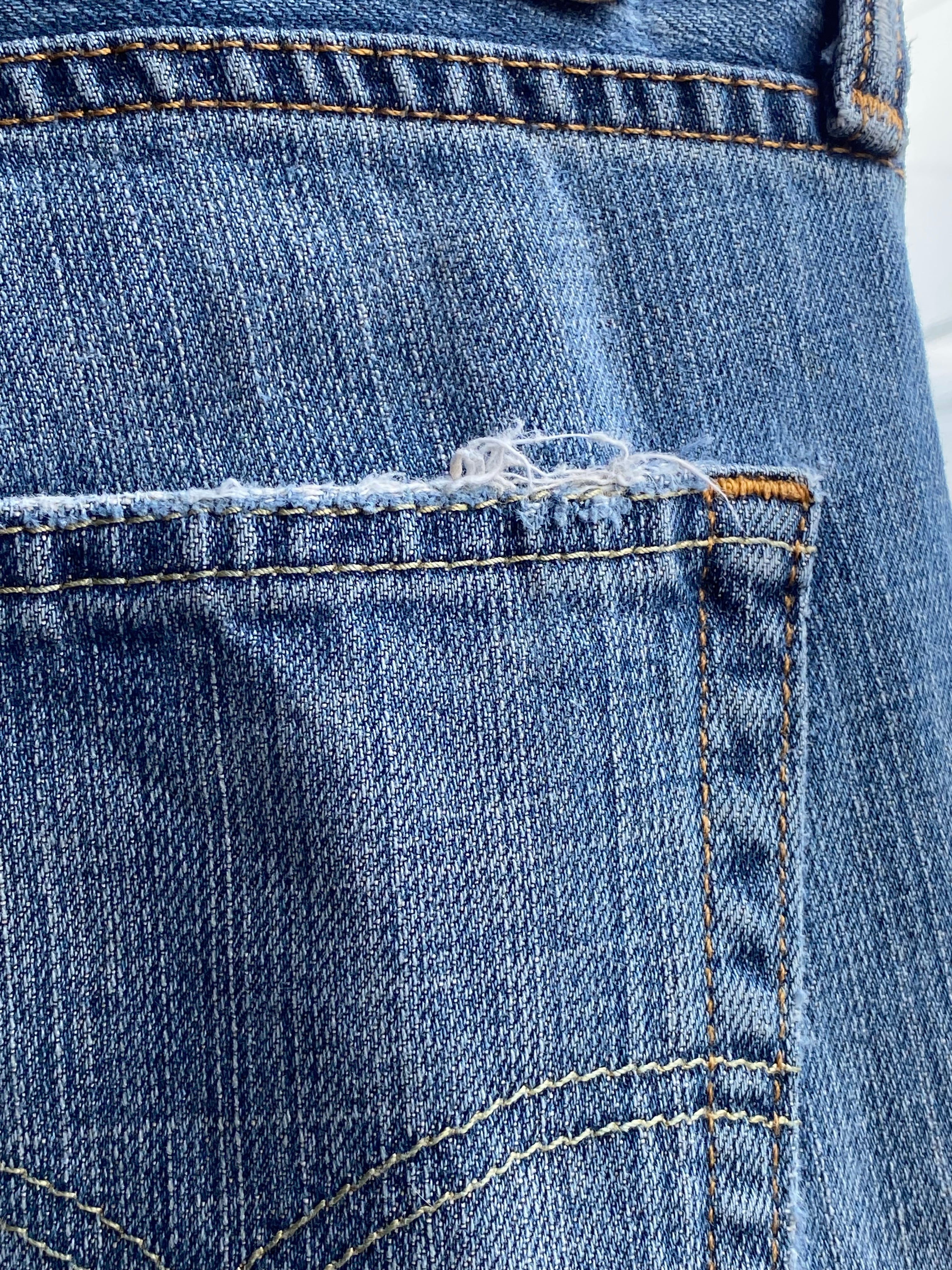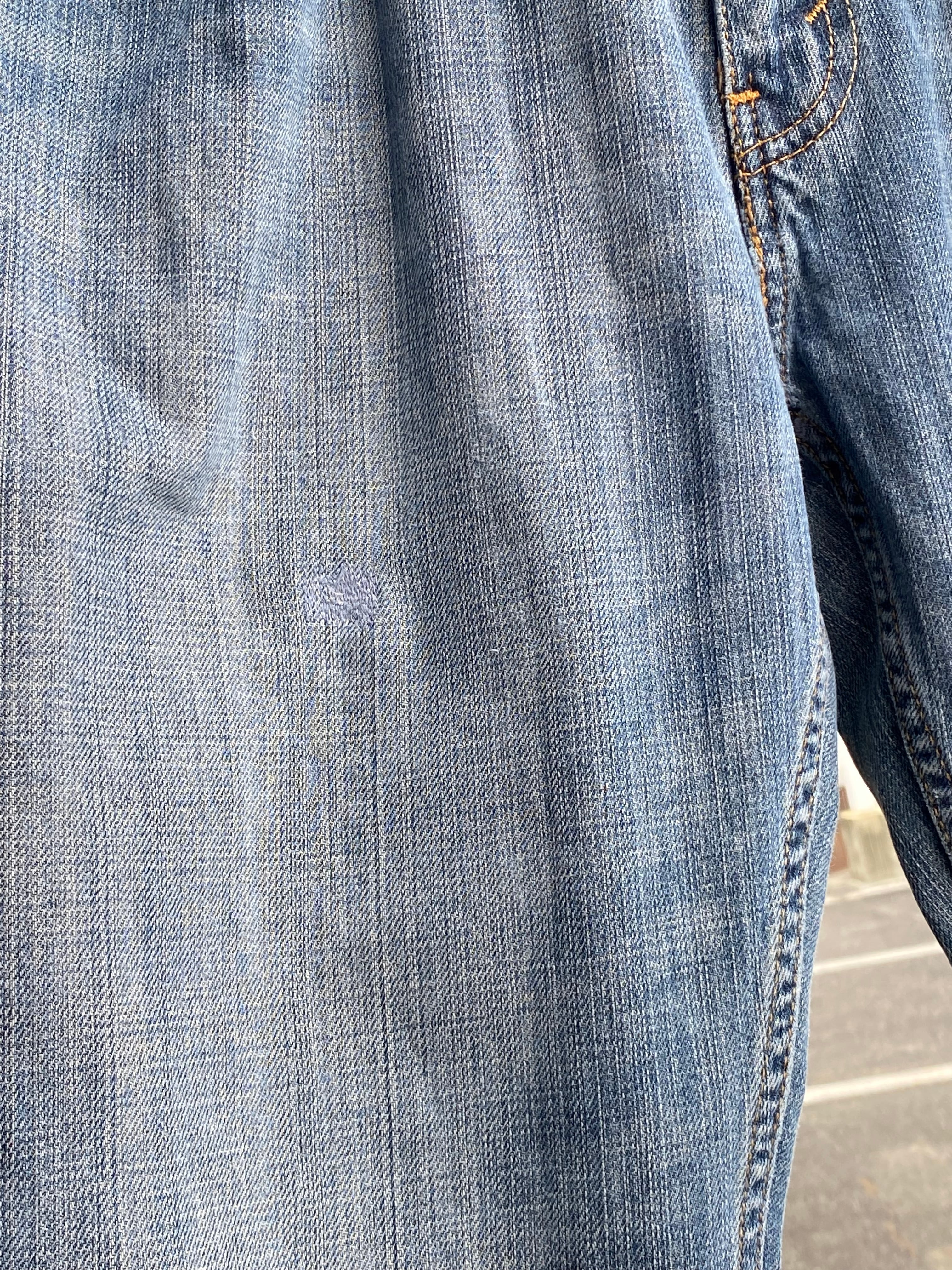 全体的に使用感を感じ、各ポケット口にスレ、細かなダメージ、右足付け根辺りに2.5cmほどのリペアがありますが着用には支障の無いレベルかと思います。