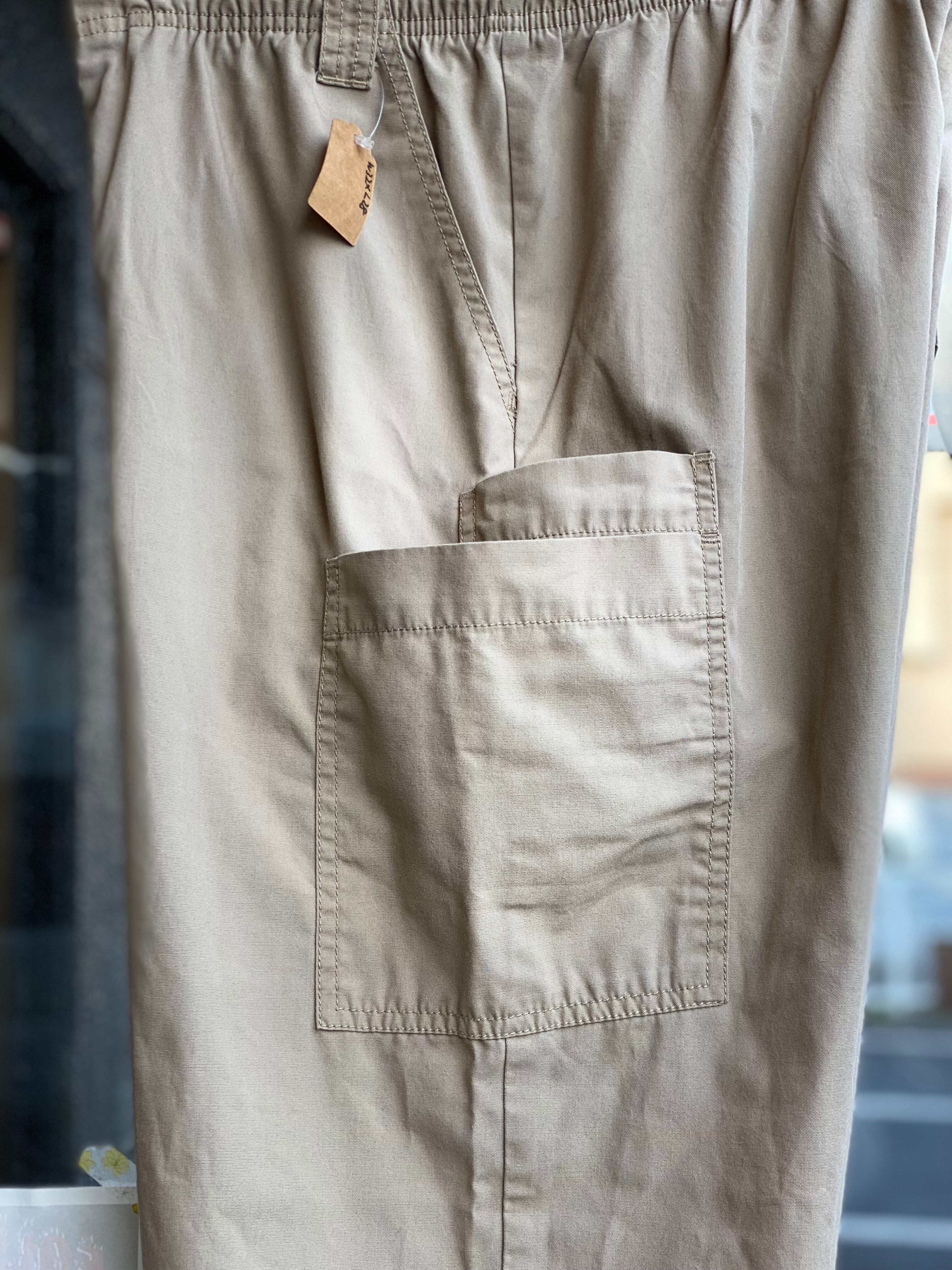 カーゴパンツですが各ポケットにフラップの無いタイプで、作業中にポケット内のモノを取り出しやすく、またポケットにモノをしまいやすくというワークパンツならではのディティールかと思います。