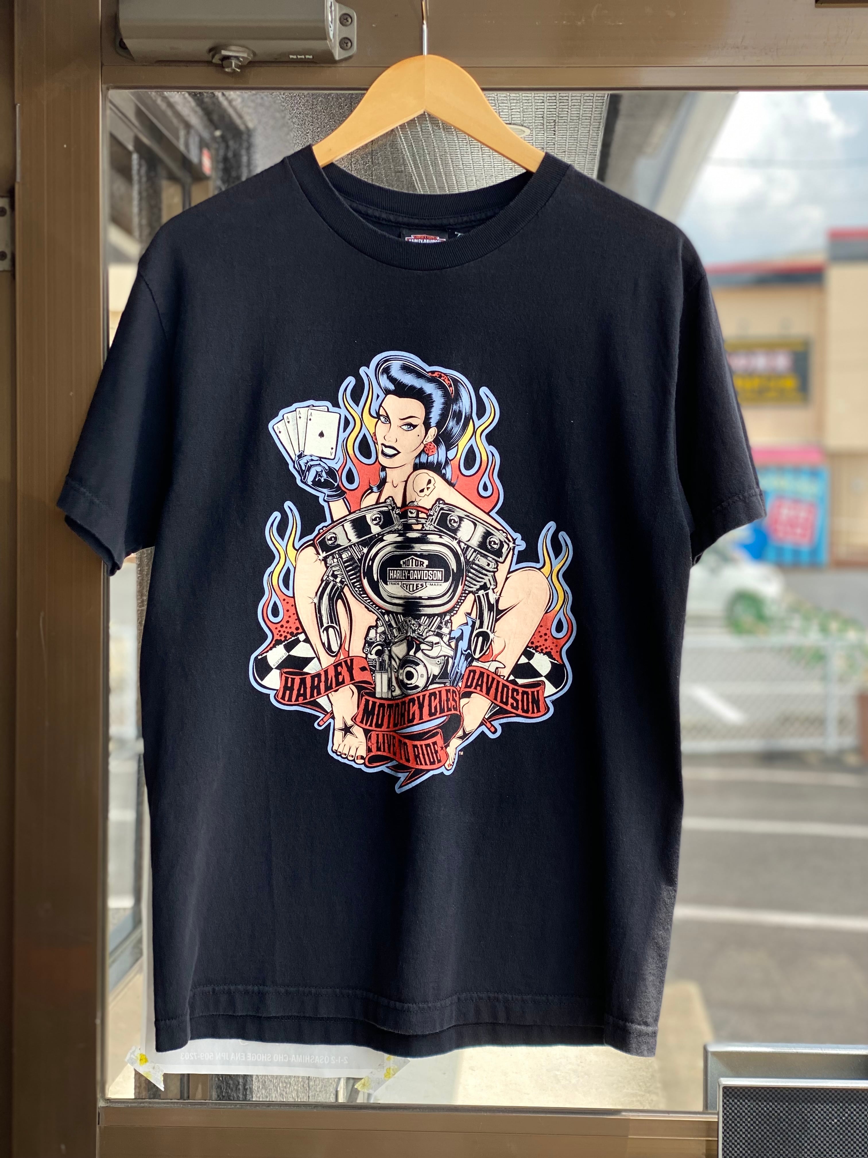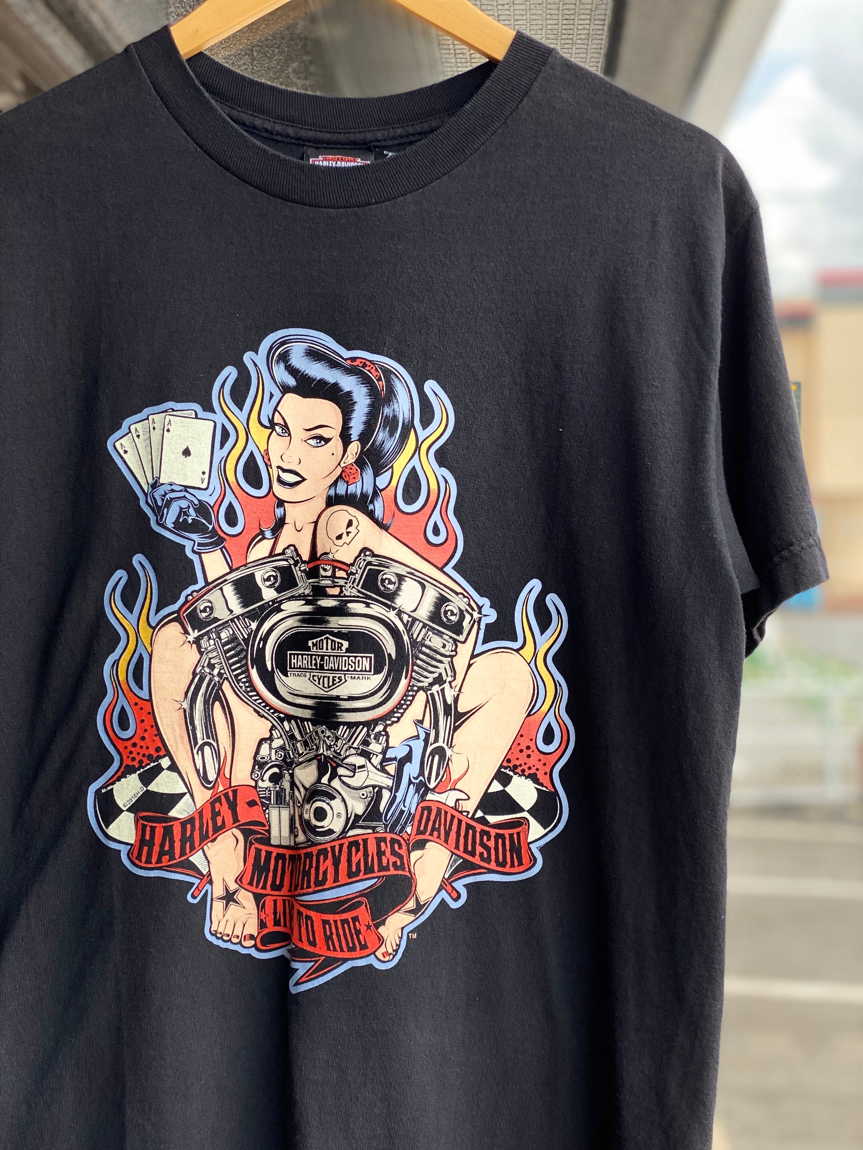 HARLEY-DAVIDSON "HIGH COUNTRY" 半袖Tシャツ ピンナップガール ショベルヘッド pin up girl shovel head イーグル ハーレー・ダビッドソン ハーレーダビッドソン エンジン フレイムス ファイヤーパターン スカル タトゥー pin-up girl アメカジ 古着 バイカー バイク ハーレーTシャツ トランプ