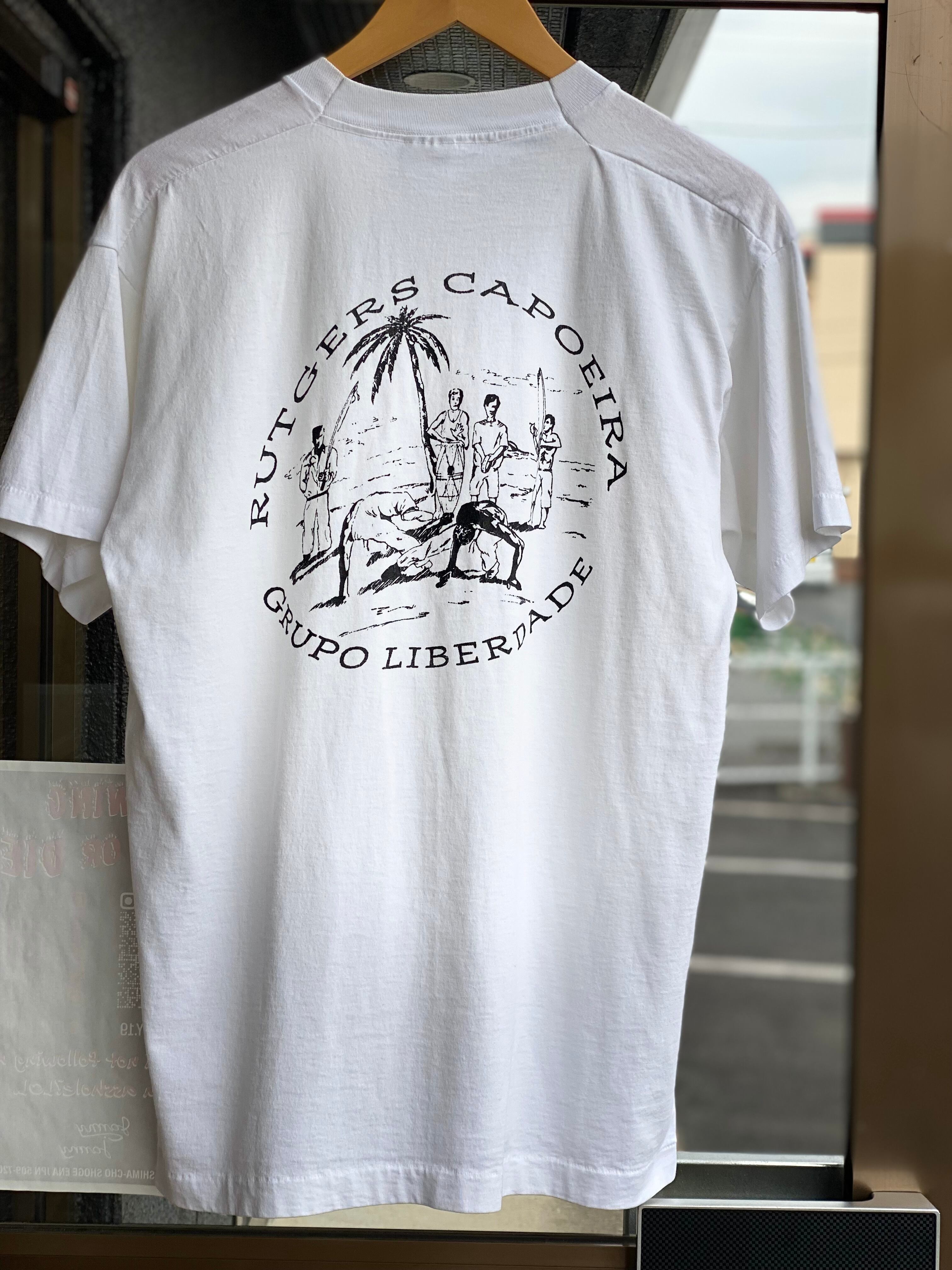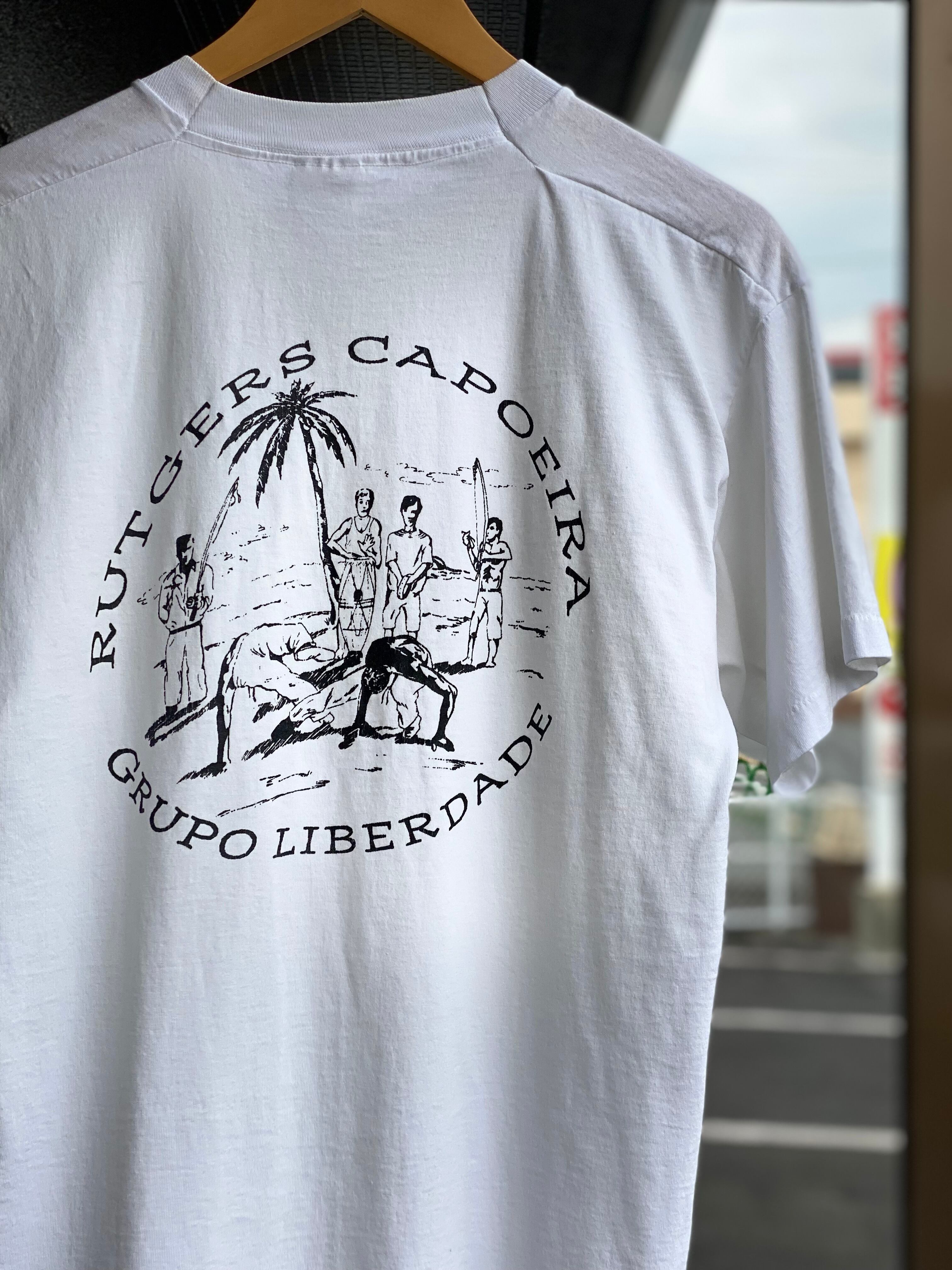 90's "RUTGERS CAPOEIRA" "GRUPO LIBERDADE" 半袖Tシャツ Lサイズ 白Tシャツ メキシコ製 Mestre Cigano カレッジ ユニバーシティ 大学 カポエラ カポエイラ 格闘技 ブラジル ダンス ダンサー カポエイラクラブ カポエラクラブ シングルステッチ 古着 プリントTシャツ ポルトガル語