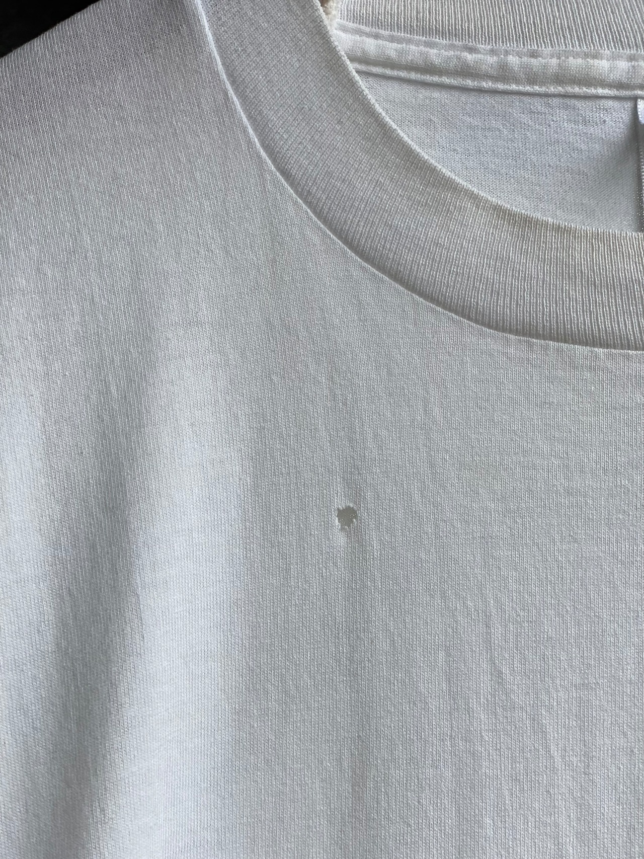 左袖口に僅かに汚れ、右胸の辺りに5mm程の穴が空いています。