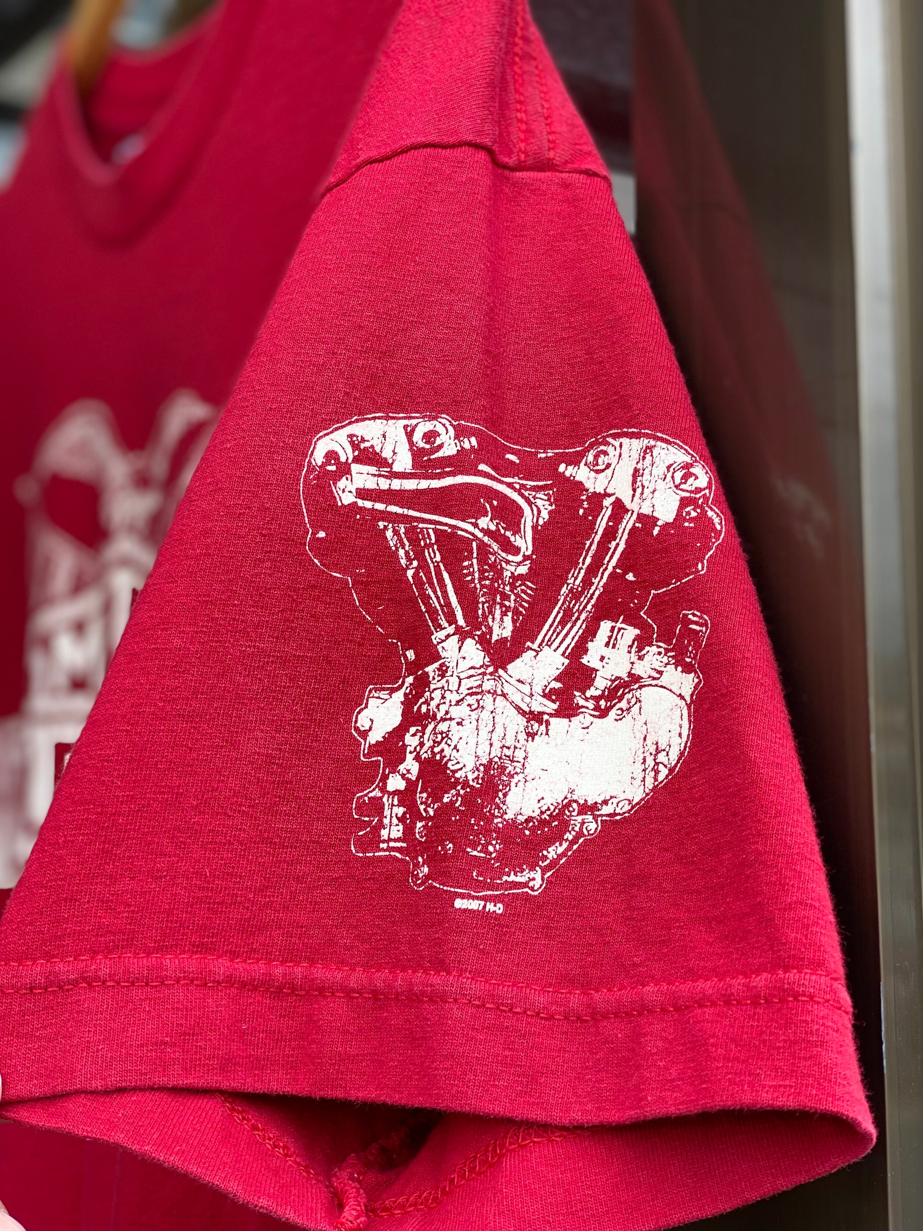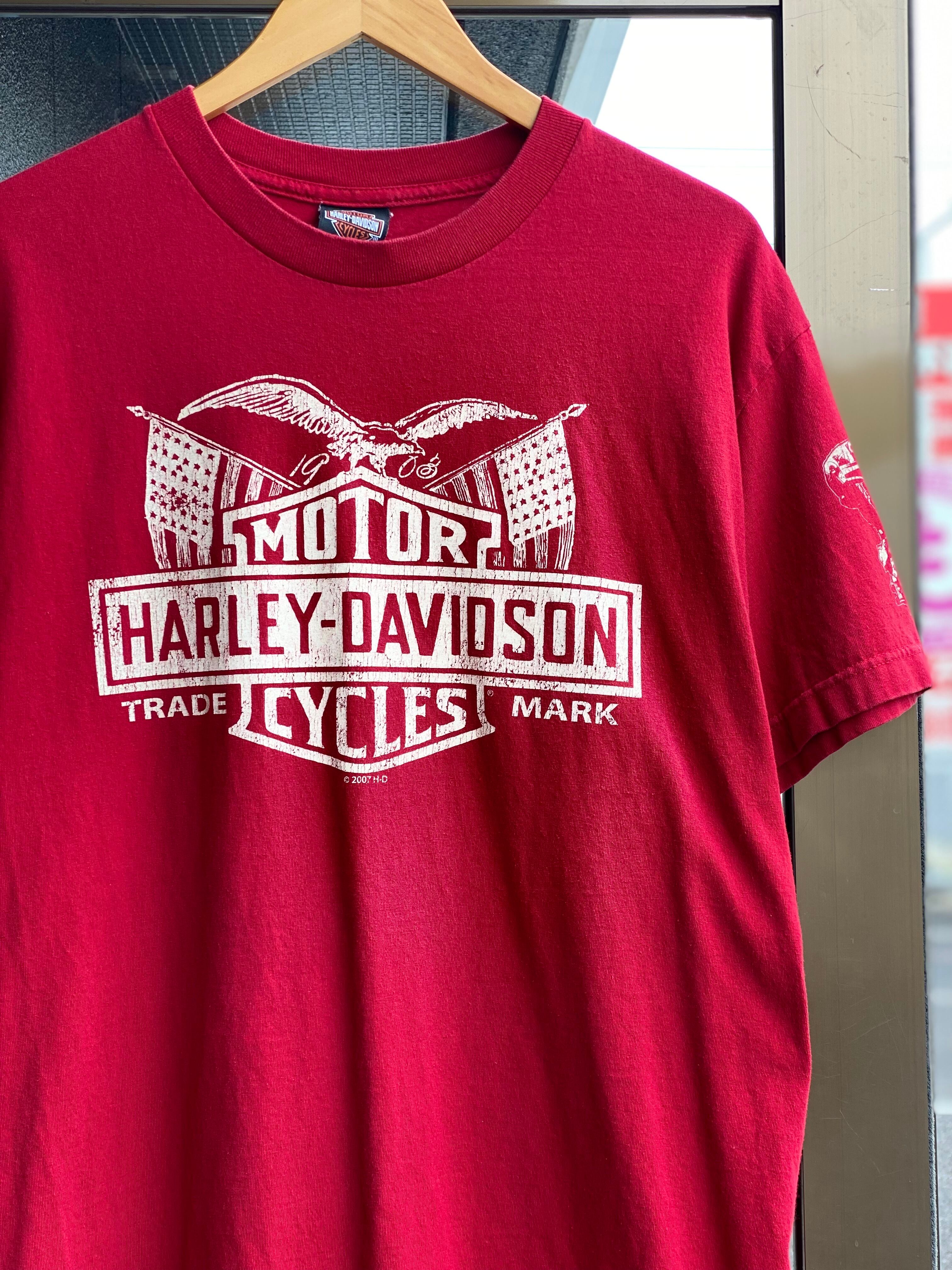 00's 2007年 St.PAUL HARLEY-DAVIDSON 半袖Tシャツ Lサイズ レッド ディープレッド 真紅 ハーレーダビッドソン ハーレー・ダビッドソン ハーレーT ナックルヘッド ディーラー イーグル バー&シールド ヒビ割れ クラックプリント 擦れ ヴィンテージ ビンテージ バイク アメカジ バイカーファッション バイカー MOTOR CYCLES