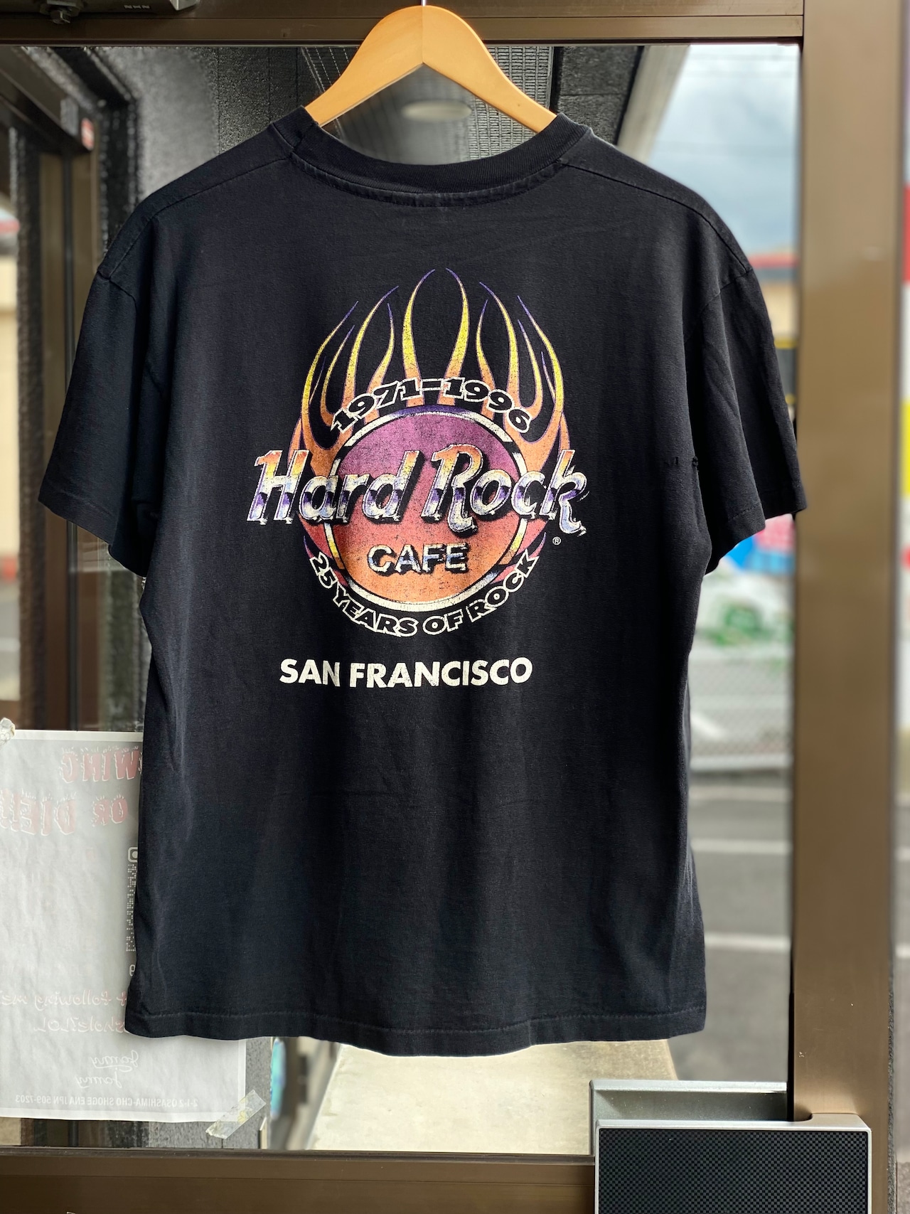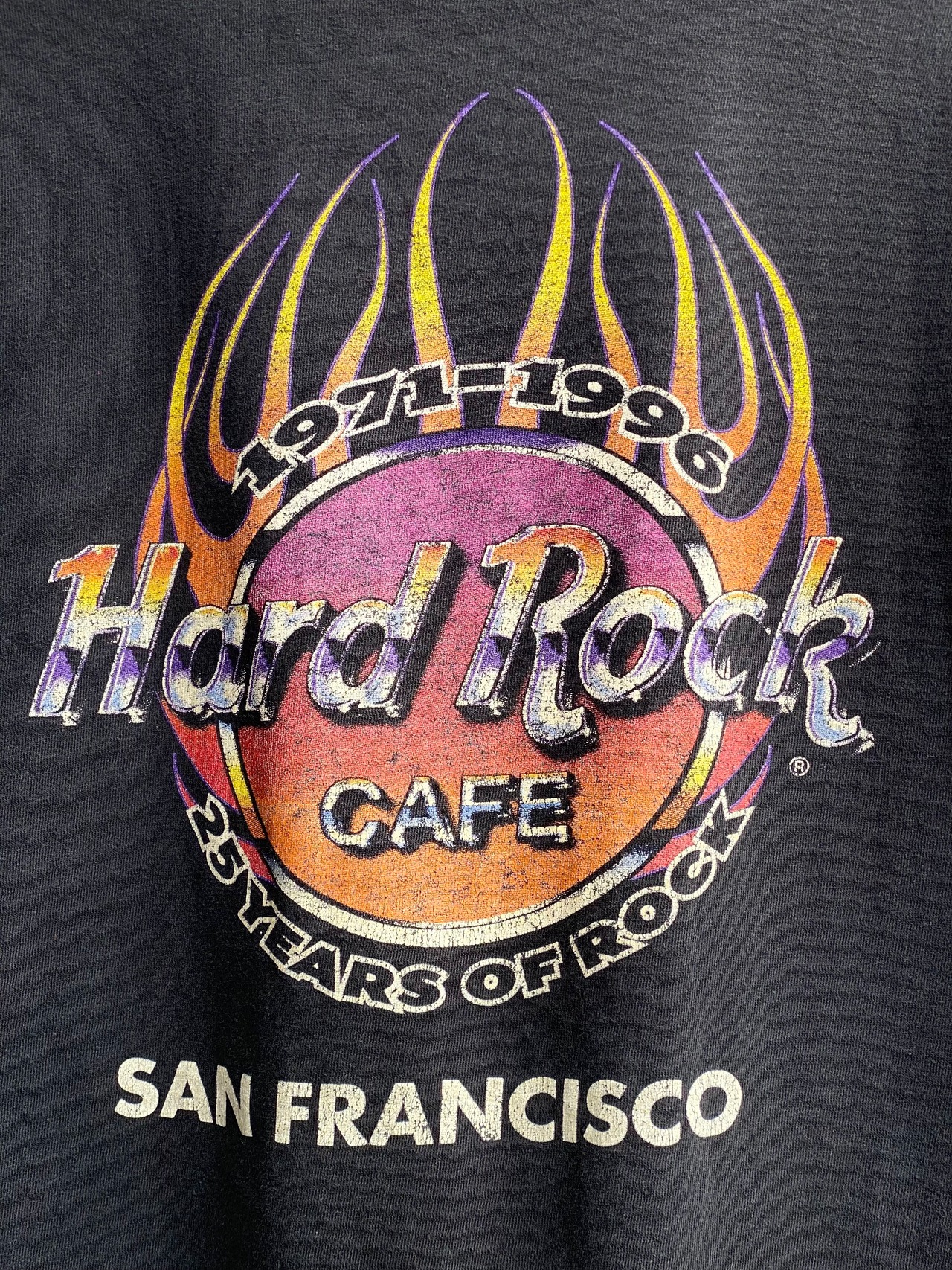 90's Hard Rock Cafe SAN FRANCISCO "1971-1996 25 YEARS OF ROCK" 半袖Tシャツ Lサイズ アメリカ製 MADE IN U.S.A. シングルステッチ ハードロックカフェ サンフランシスコ 25周年記念 フレイムス メタリック フェードブラック スミクロ ダメージ ボロ BORO 短丈