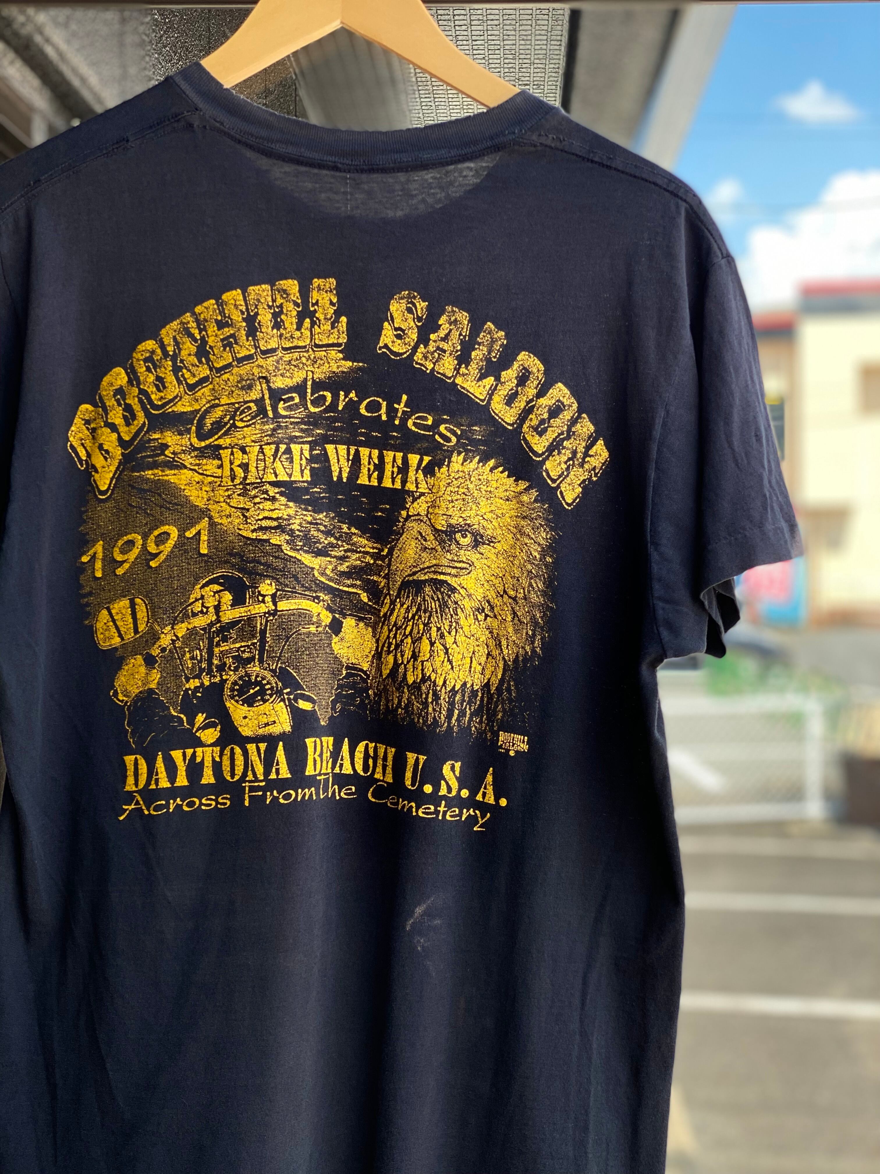 90's BOOTHILL SALOON "1991 BIKE WEEK" ポケット付き半袖Tシャツ タグ欠損 実寸Mサイズ程 ブートヒル・サルーン DAYTONA BEACH DAYTONA BIKE WEEK バイク バイカー ポケT ポケットTシャツ ボロ BORO イーグル フェード スミクロ 褪色 アメカジ ダメージ