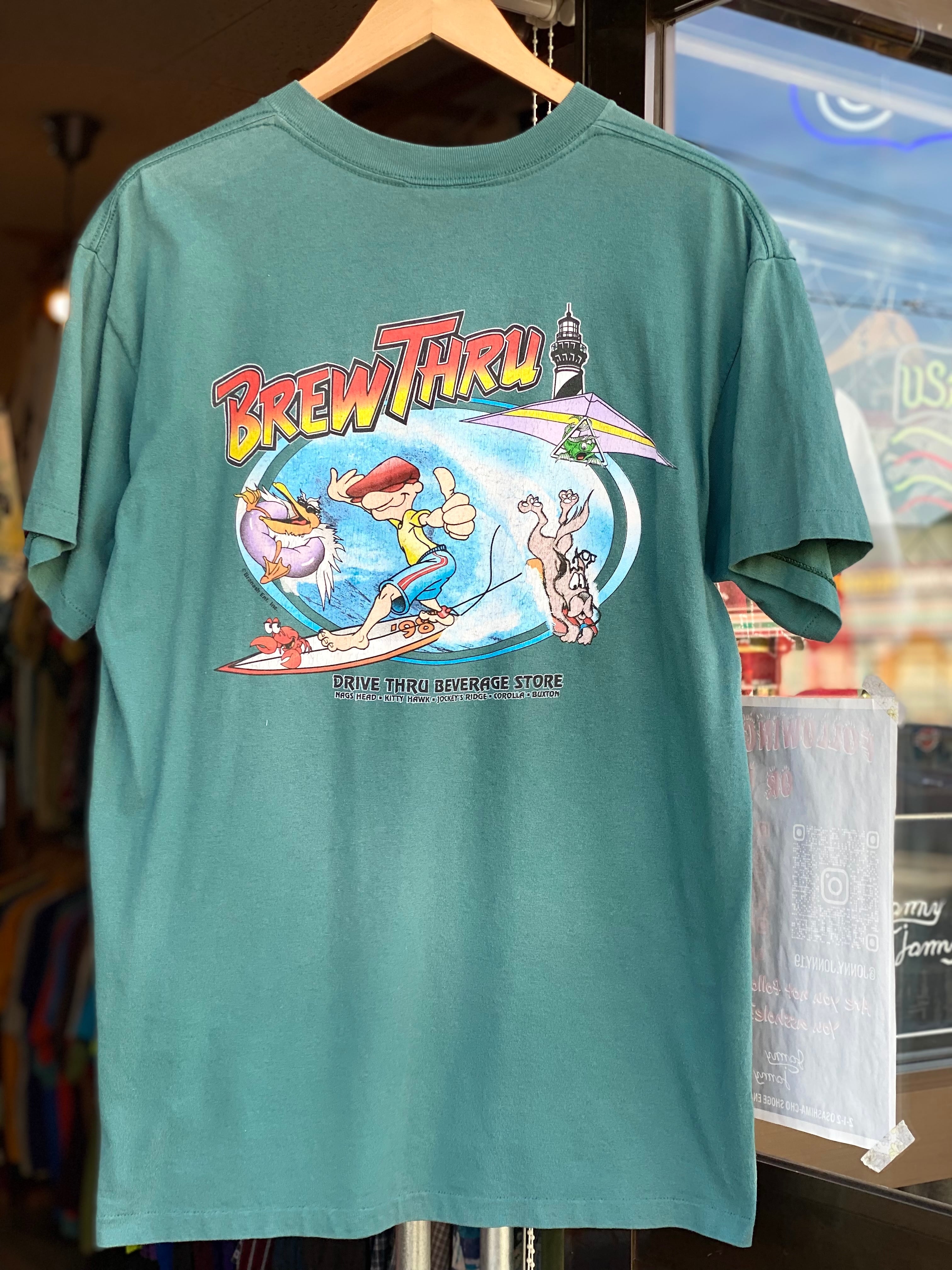 アメリカ・ノースカロライナ州「Outer Banks」にあるドライブスルー型コンビニ「Brew Thru」のオリジナルTシャツです。1977年の創業以来、地元の人々に親しまれてきたBrew Thru。そのレトロなデザインは、ヴィンテージファンの間でも高い人気を誇ります。