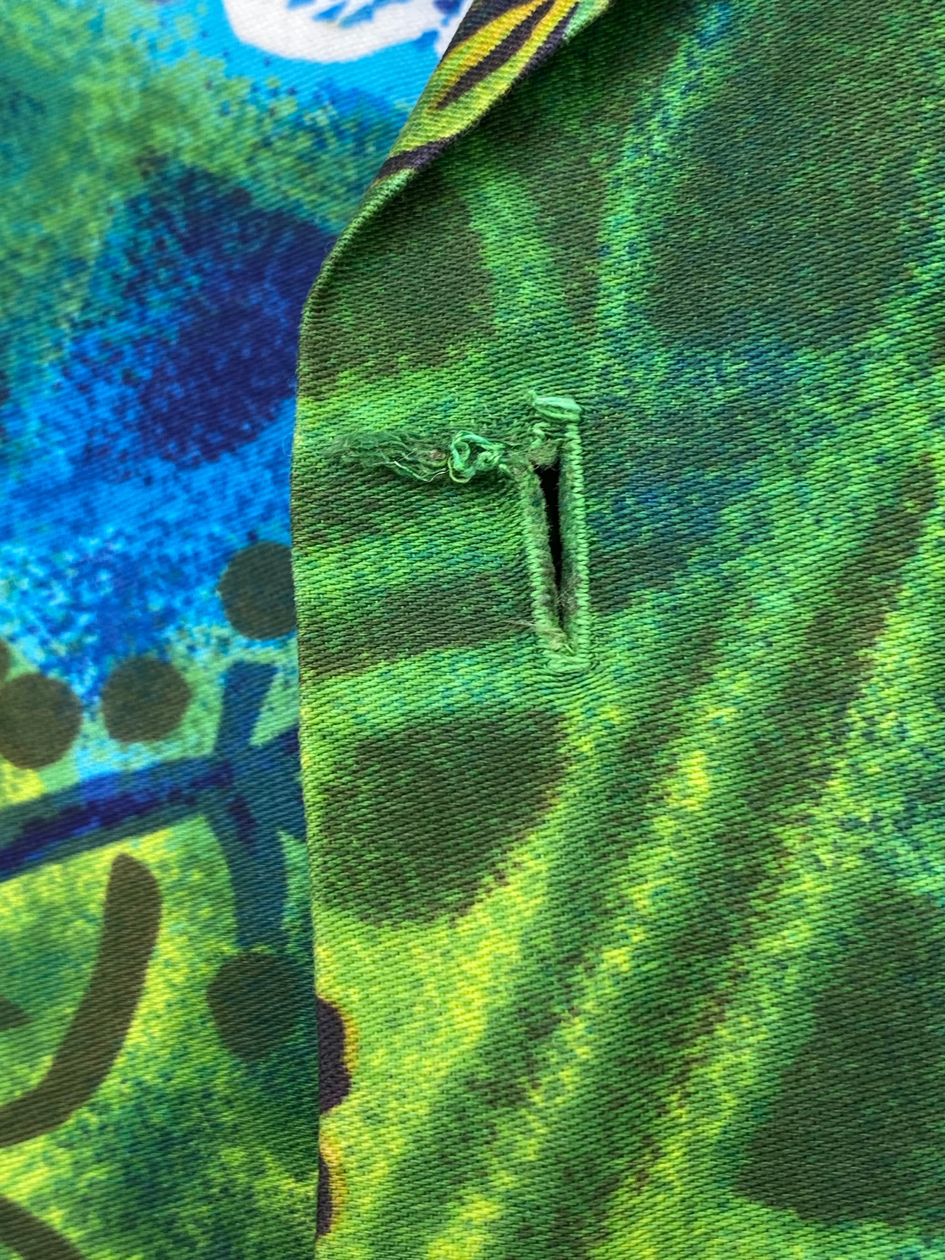 こちらも例に漏れず白いハイビスカスがメインモチーフに置かれ、グリーン×ブルーの少々ドギツめなカラーリングですが、派手な柄シャツではあるあるな「着てみると意外と馴染む」1枚です。