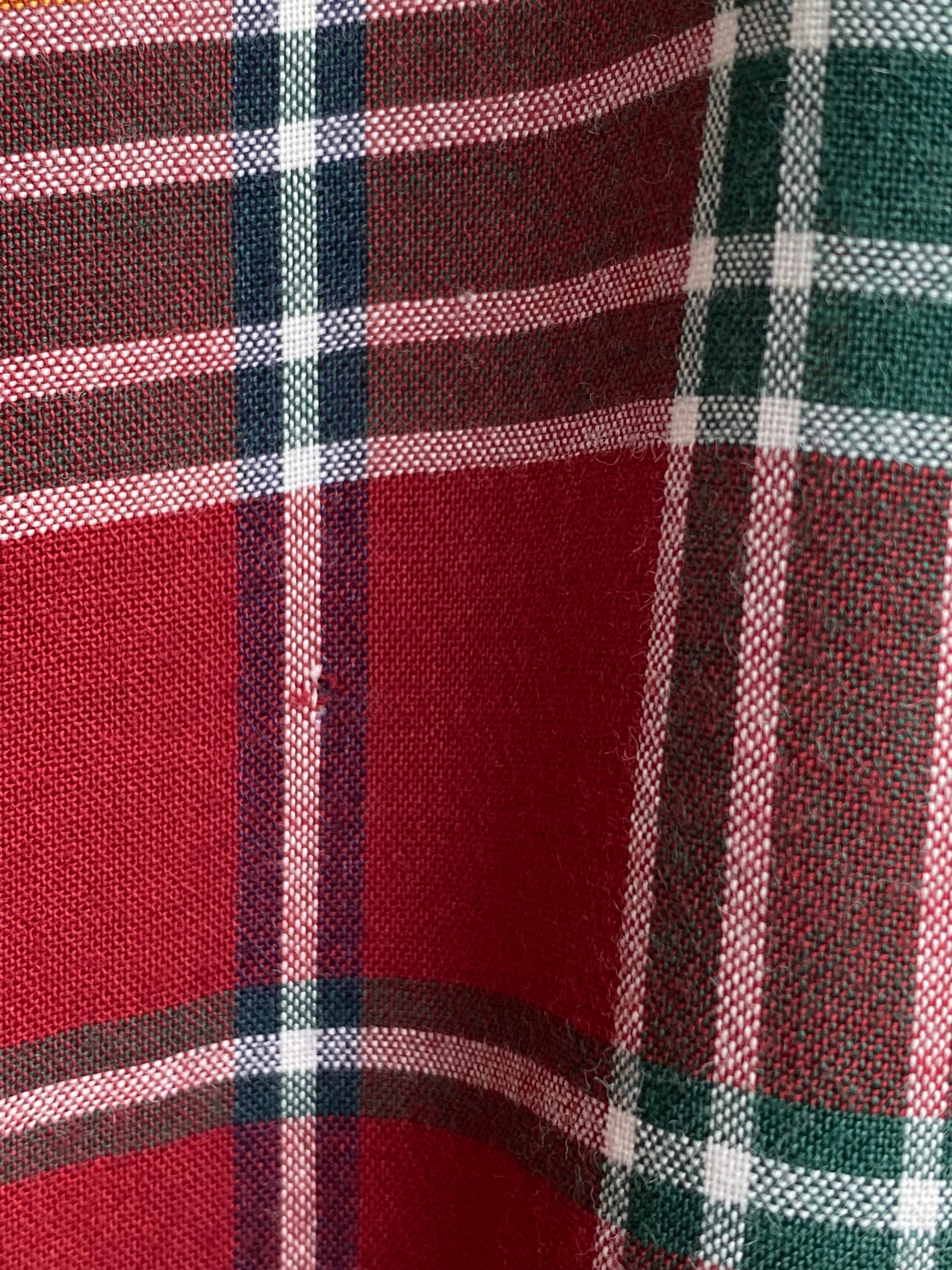 エンジ寄りのレッドがベースにマスタードとダークグリーン、オフホワイトでタータンチェック調な柄で、どことなく高貴で上品な印象を受けます。僕みたいで(以下略