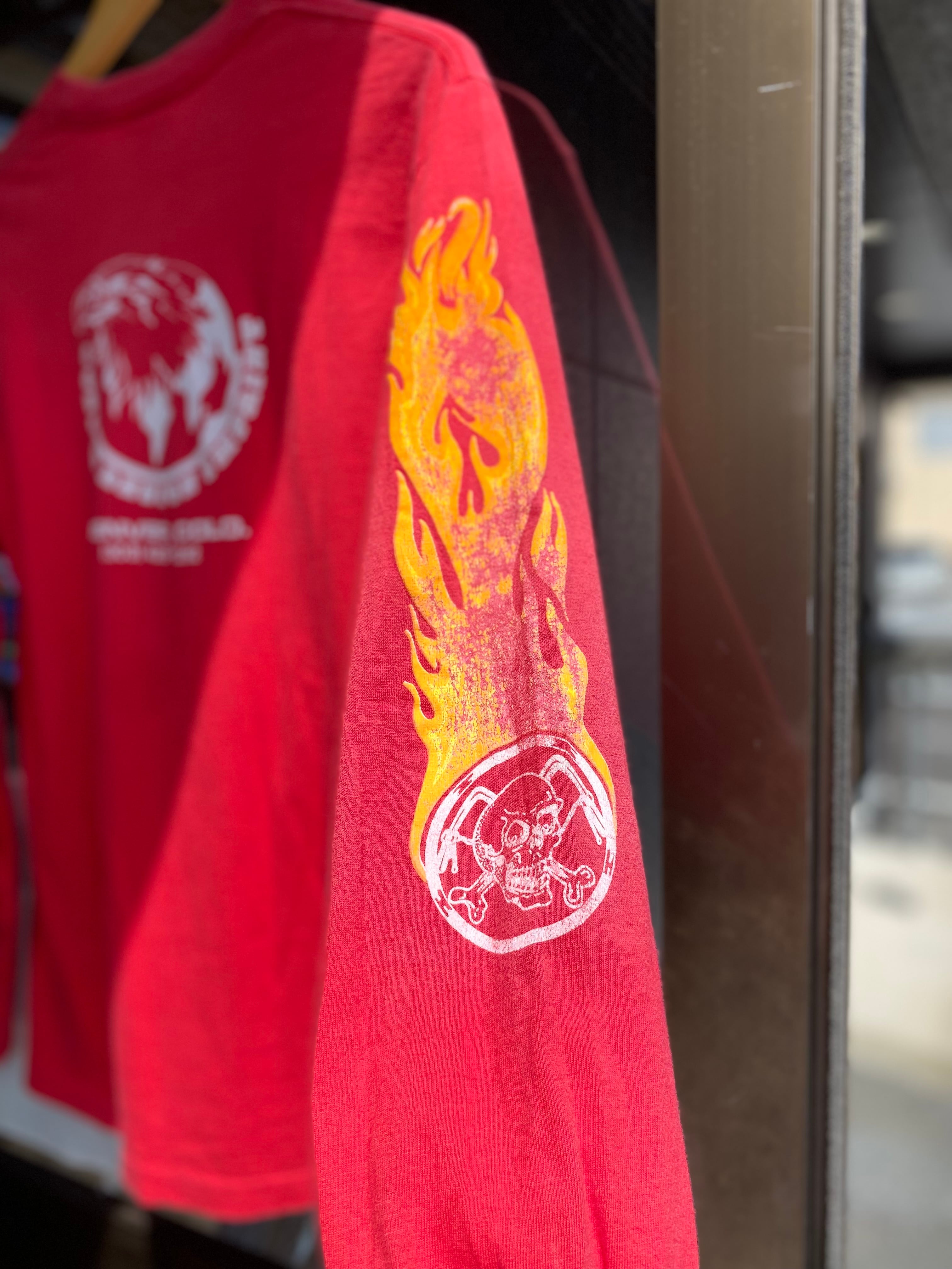 90's CUSTOM DESIGN IMPRINT "SS" 長袖Tシャツ MADE IN U.S.A. Mサイズ 赤 レッド フェード anvil 袖プリント 袖フレイムス ファイヤーパターン スカル バイカーファッション シングルステッチ スリーブプリント ロンT アメカジ 古着 バイカーTシャツ バイク