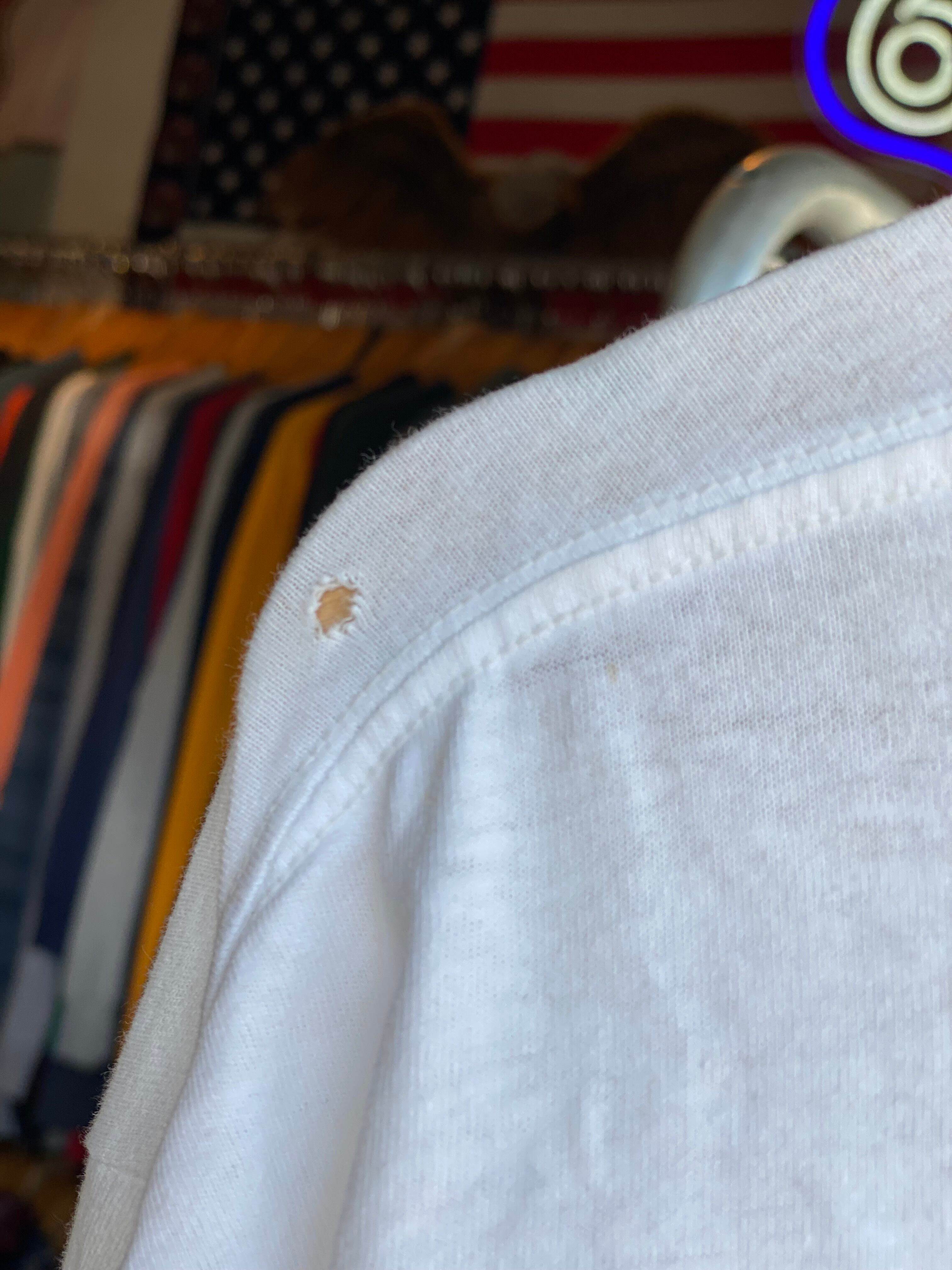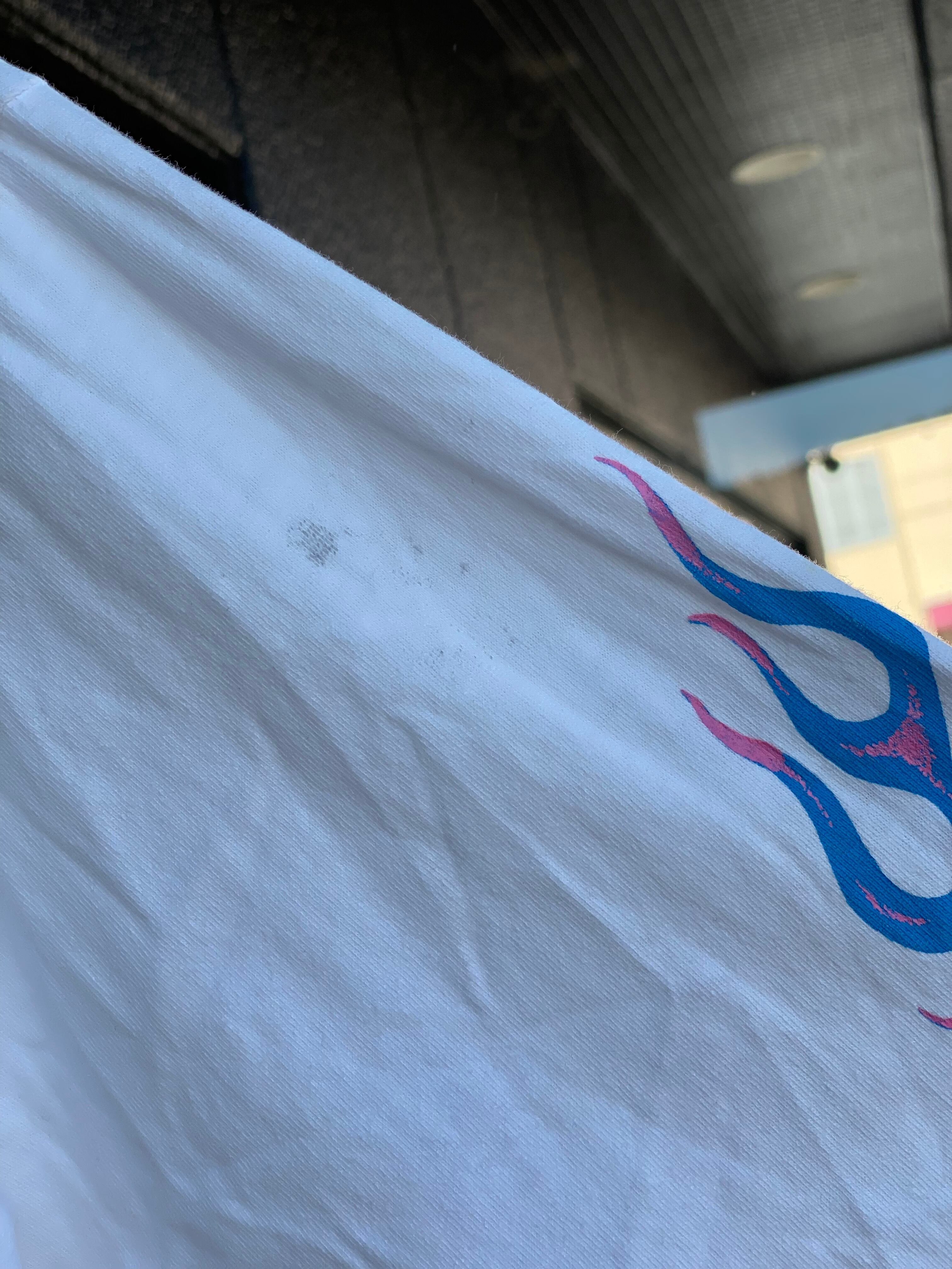 全体的に使用感があり、左肩にピンボールが2箇所、右袖やフロント部に細かな汚れ、首元のヨレがあります。