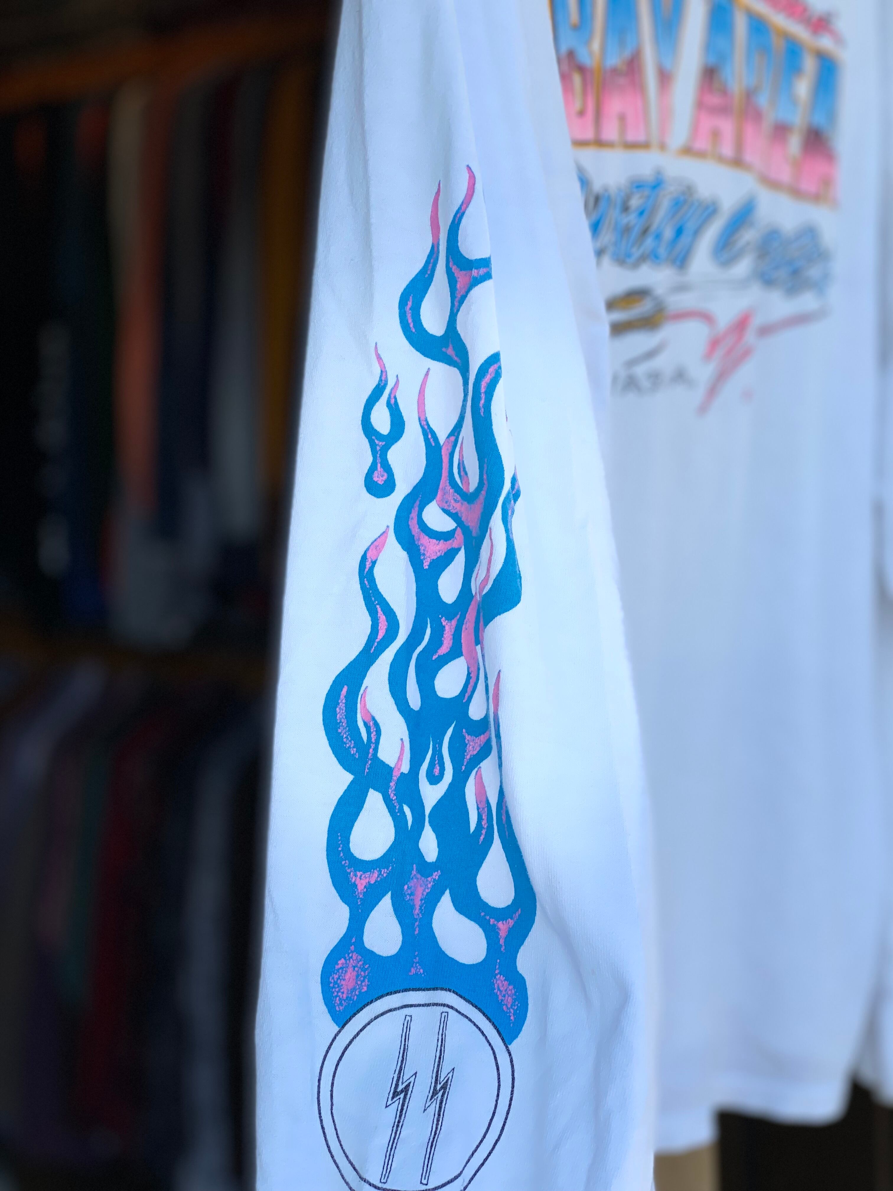90's Ron Simms' BAY AREA Custom Cycles 長袖Tシャツ MADE IN U.S.A. Lサイズ シングルステッチ ONEITA ロン・シムズ ベイエリアカスタムサイクルズ SS ロンT 袖プリント 袖フレイムス ファイヤーパターン ライトブルー×ピンク バイク ハーレーダビッドソン カスタムショップ WCC west coast choppers jesse james ウエストコーストチョッパーズ ジェシー・ジェームズ