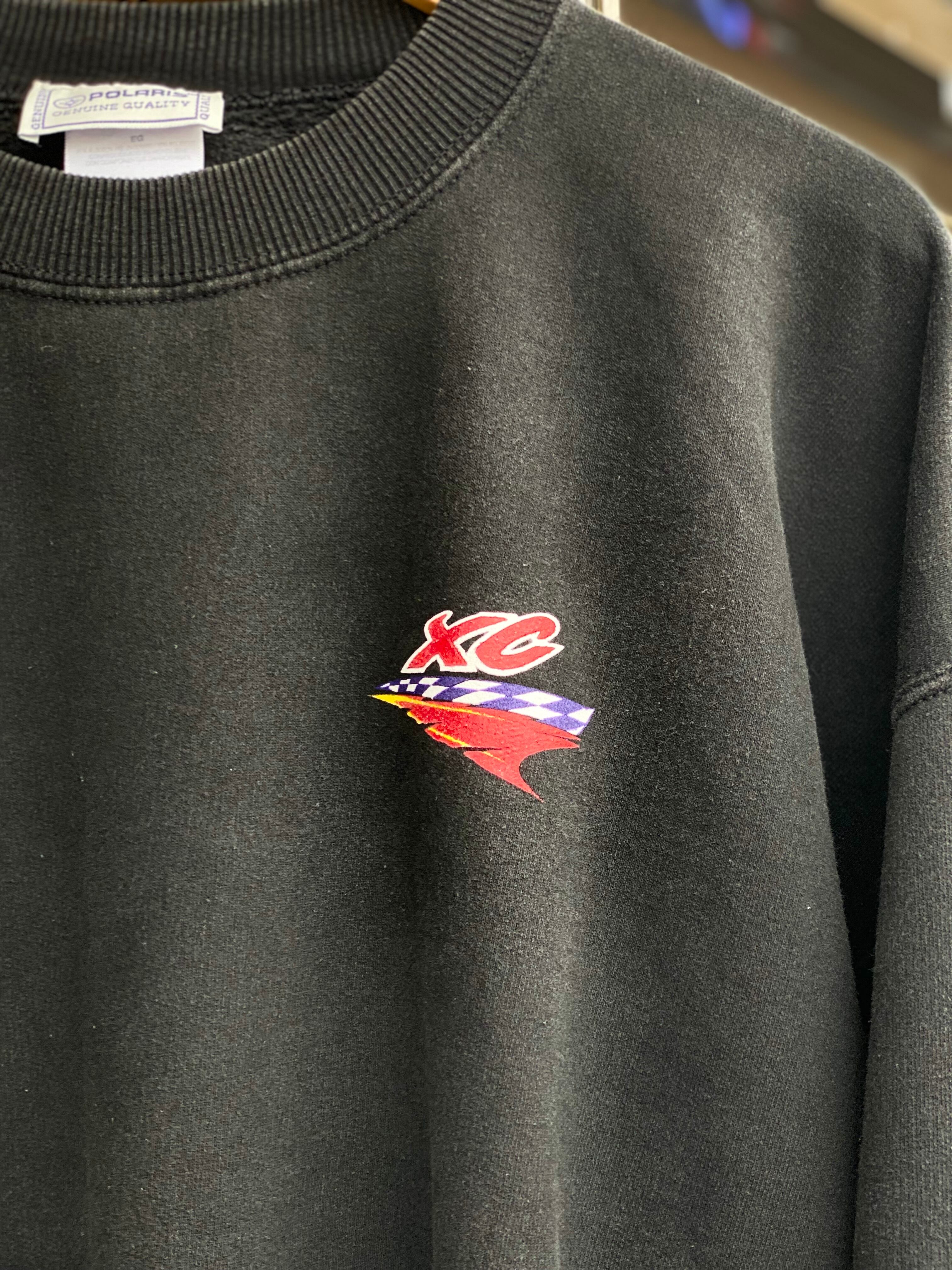 00's POLARIS Racing "XC" 袖プリントスウェットシャツ XLサイズ ブラック 黒 フェード スノーモービル ポラリス 北極星 雪 冬 スノボ スキー スノーボード 横ノリ レース レーシング クロスカントリー オートスポーツ トレーナー スリーブプリント