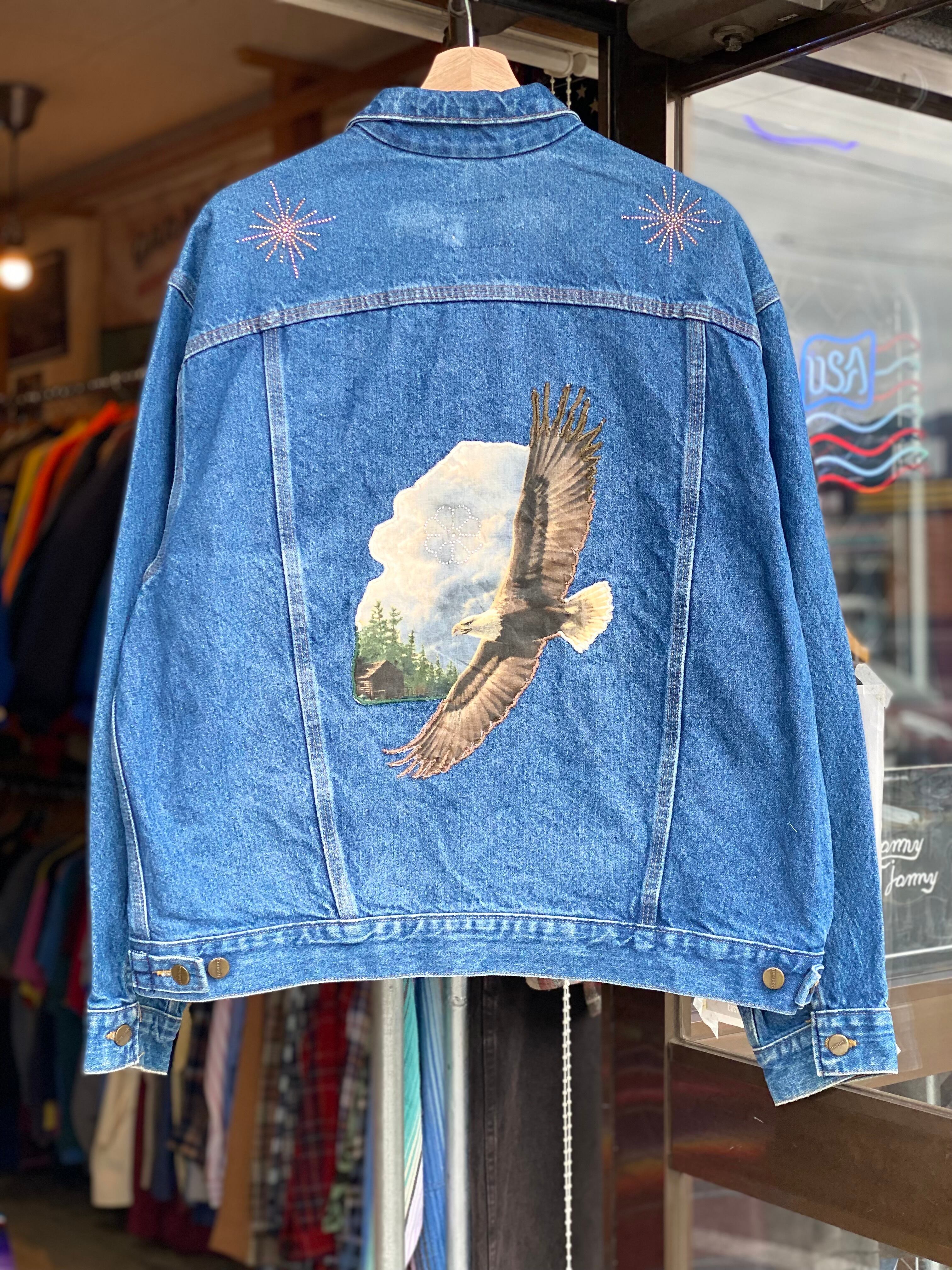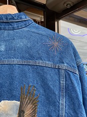 デニム地の青を空に見立て白い大きな雲を背に、デニムの青空を悠々と飛んでいるワシのワッペンが縫い付けられています。