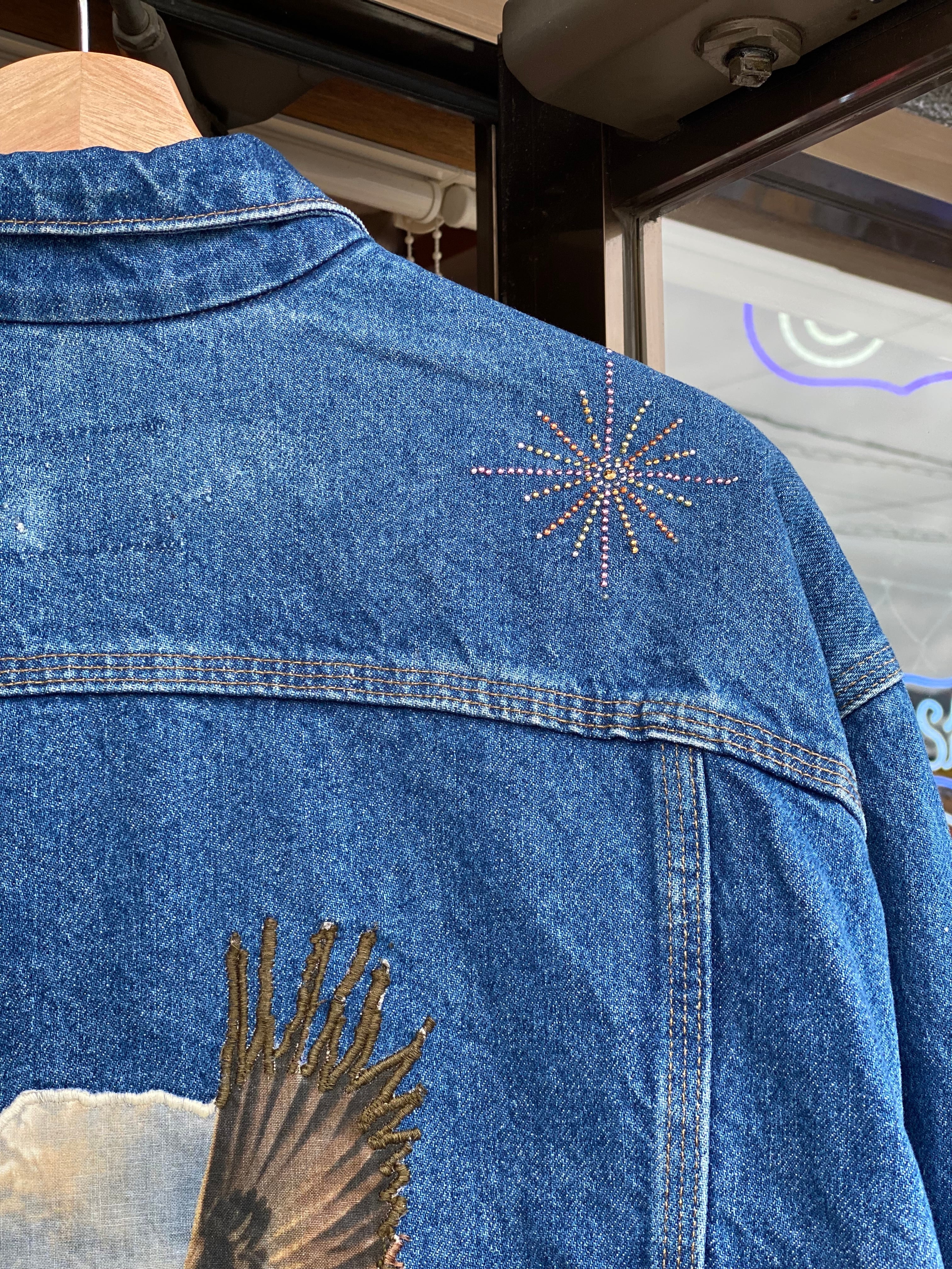 Carhartt カスタマイズドデニムジャケット タグ欠損 実寸XLサイズ程 インディゴブルー ネイティブ インディアン イーグル ワッペン ラインストーン キラキラ 刺繍 ジージャン Gジャン トラッカージャケット アメカジ 古着 短丈 5th ネイティブアメリカン ホピ族