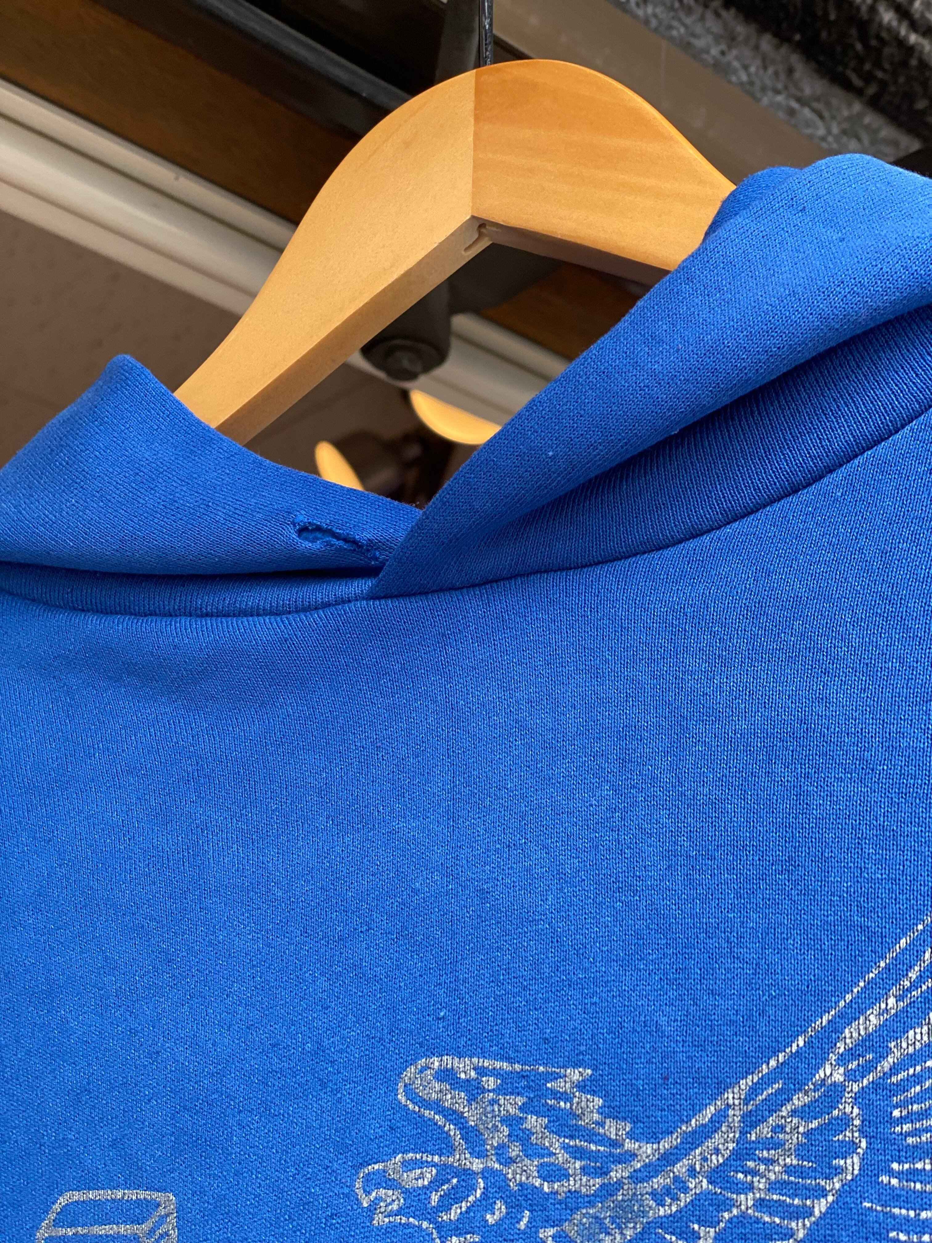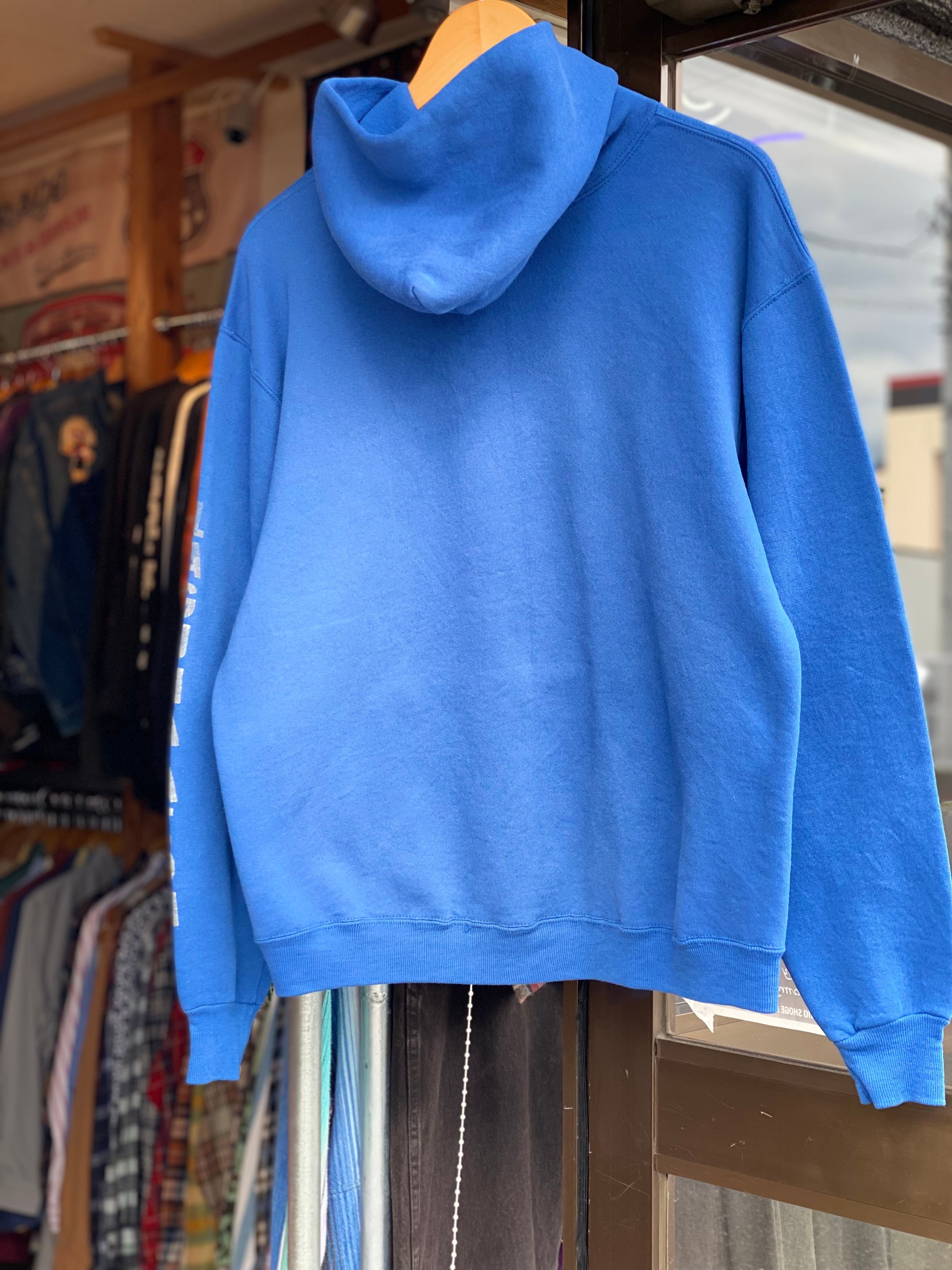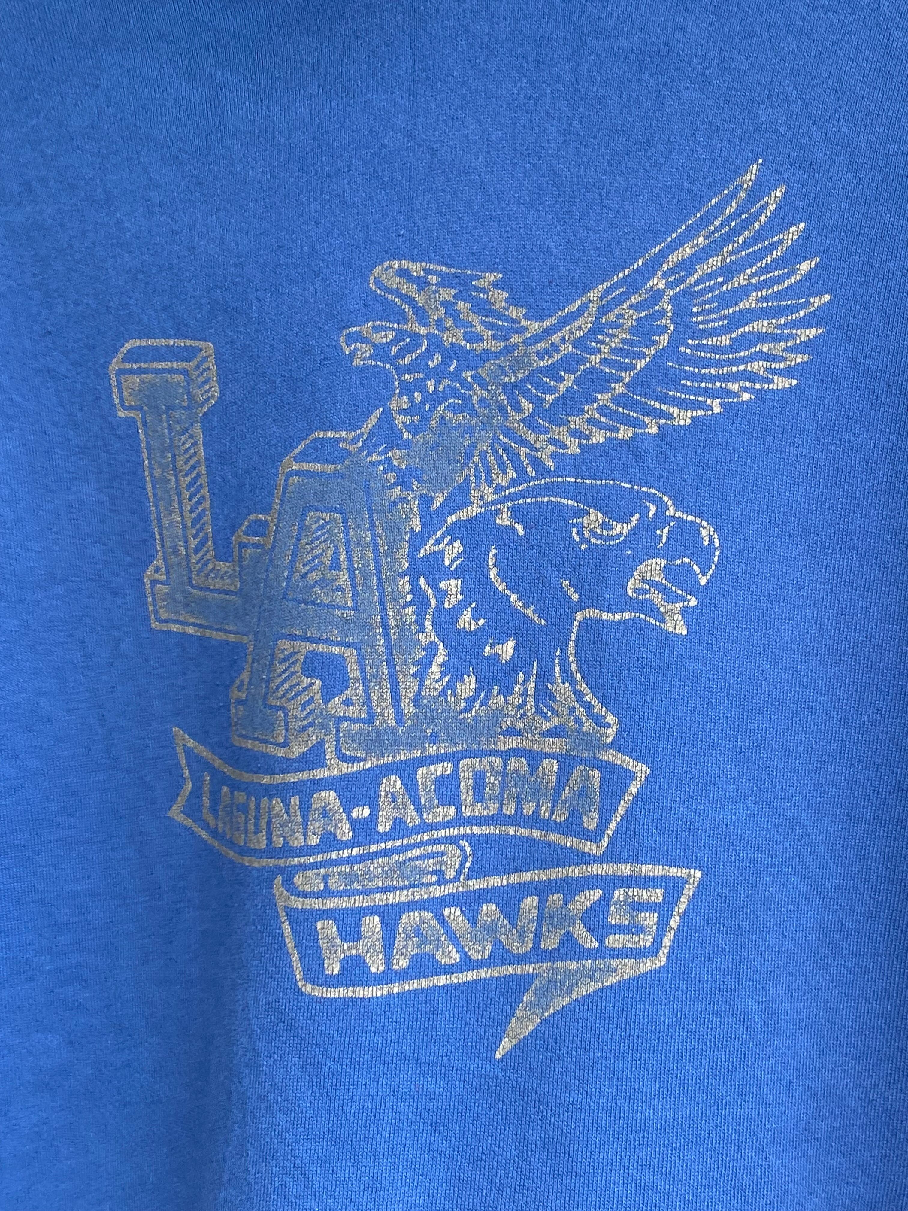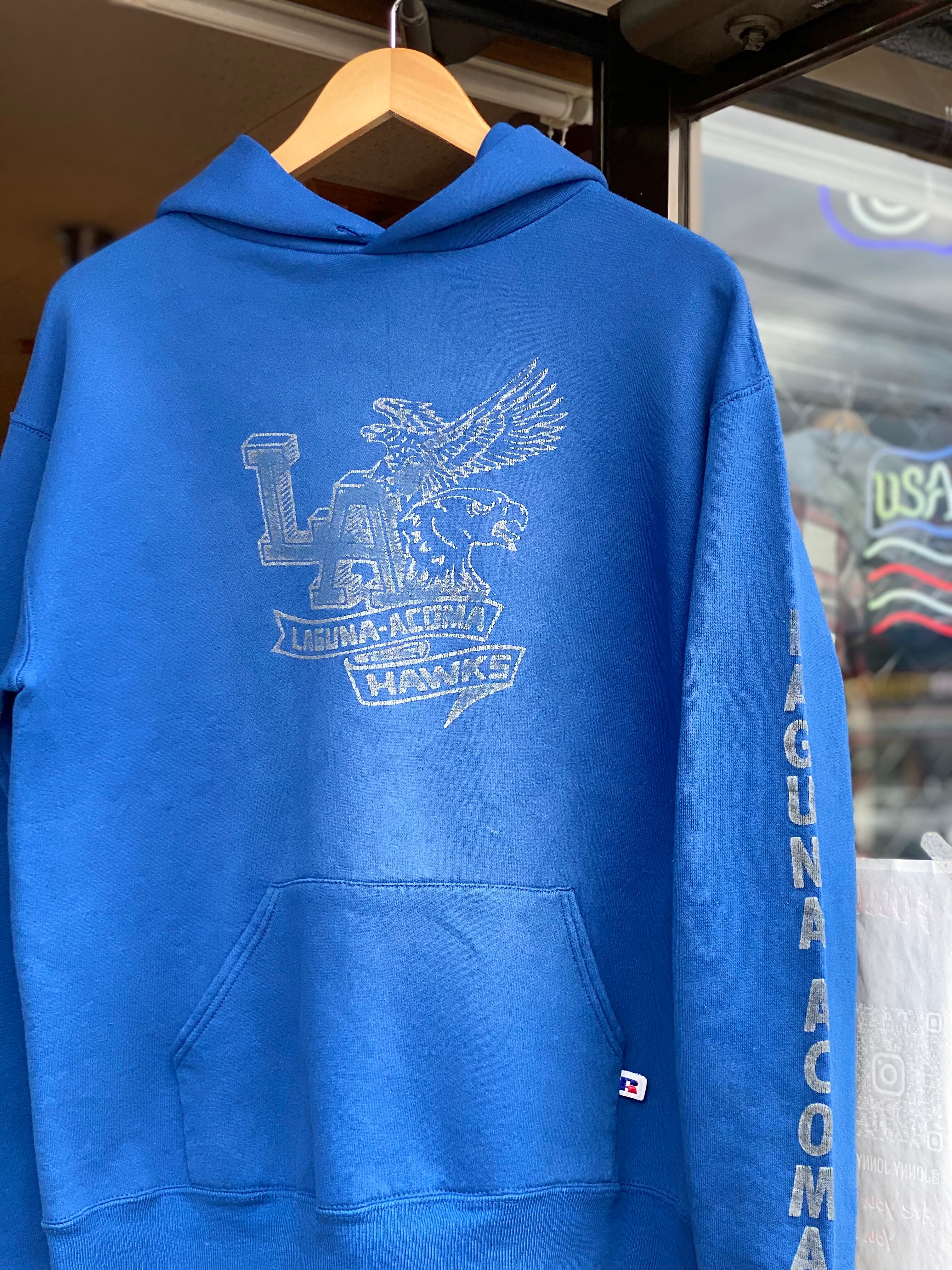 80~90's RUSSELL ATHLETIC "LAGUNA-ACOMA HAWKS" カレッジロゴプルオーバーパーカー MADE IN U.S.A. Lサイズ ブルー 鷹 ホーク 袖プリント スリーブプリント フーディー スウェット ラッセルアスレチック アメリカ製 アメ製ラッセル アメカジ 古着 スポーツ 青