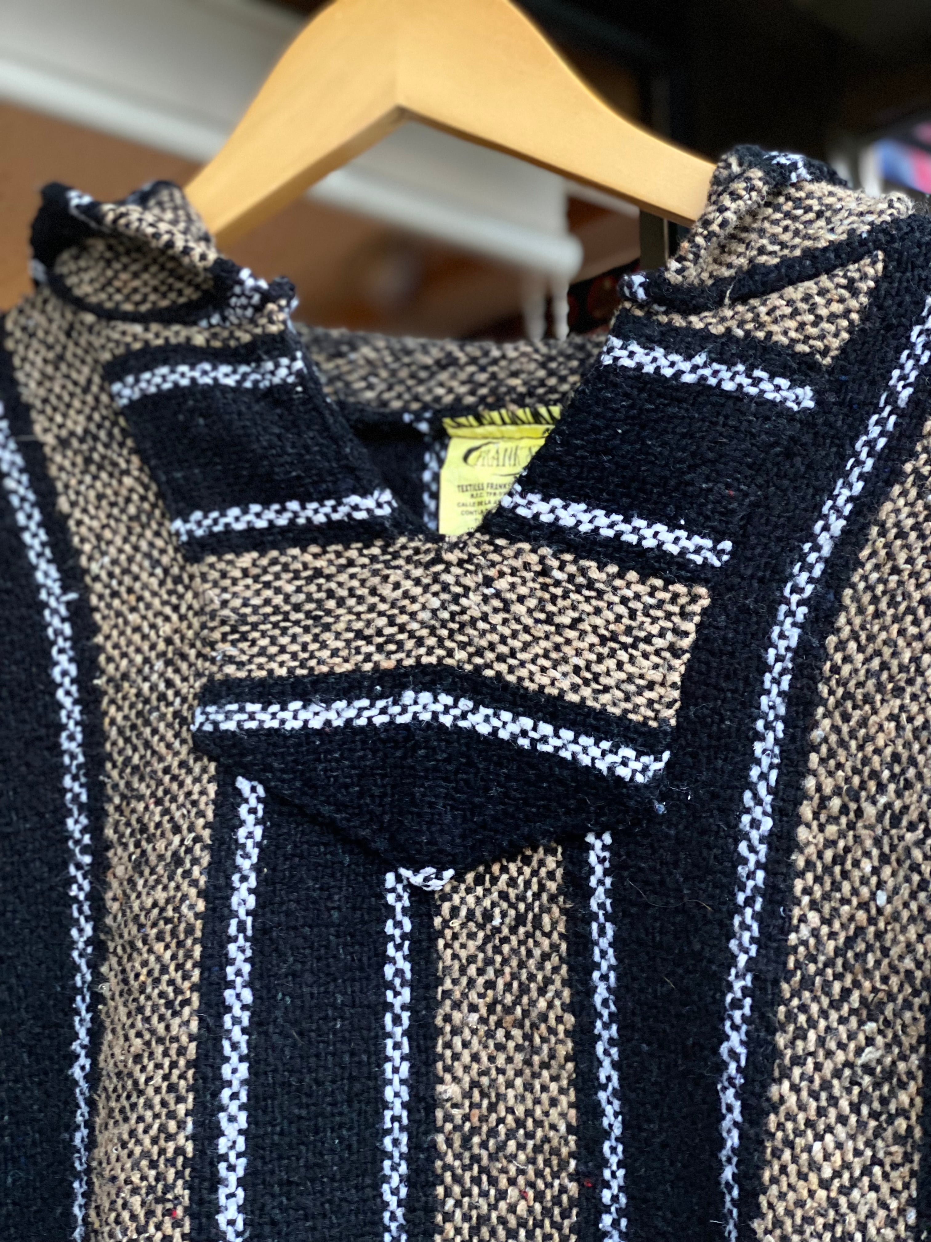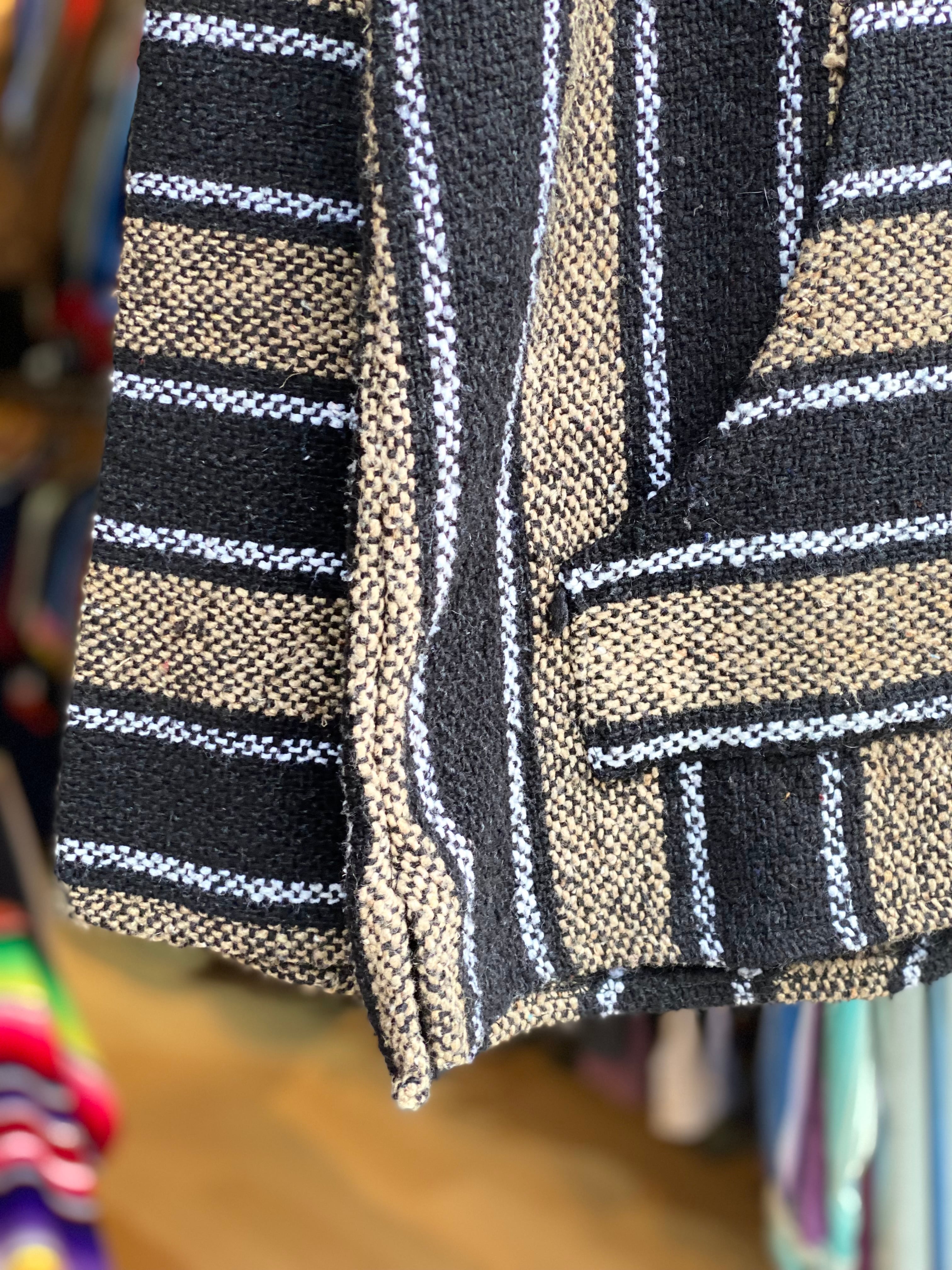 コチラはブラックベースに太いピッチのライトブラウンと細いピッチのホワイトのストライプが入る、メキシカンパーカーの中では落ち着いた着やすい配色となっております。