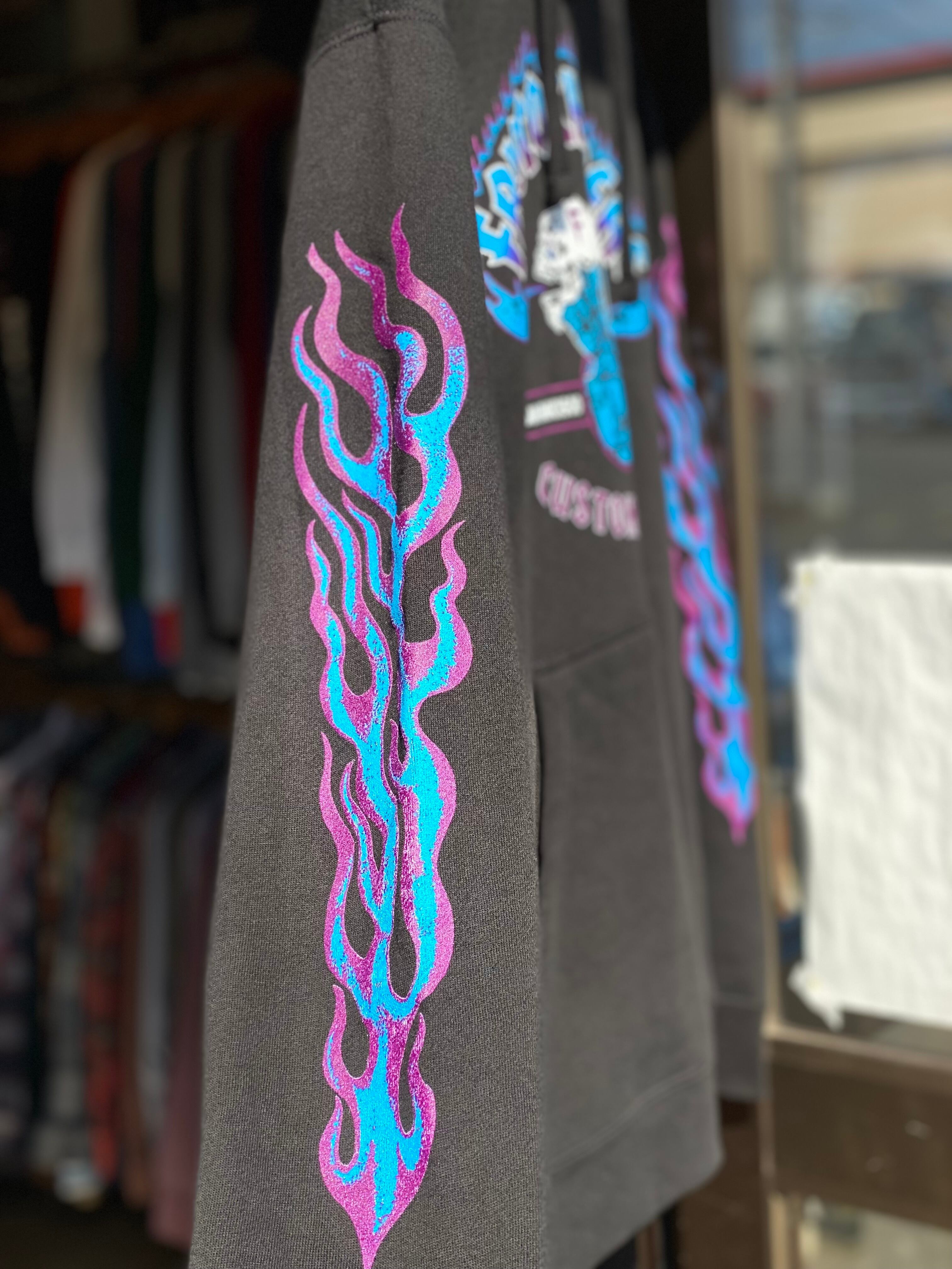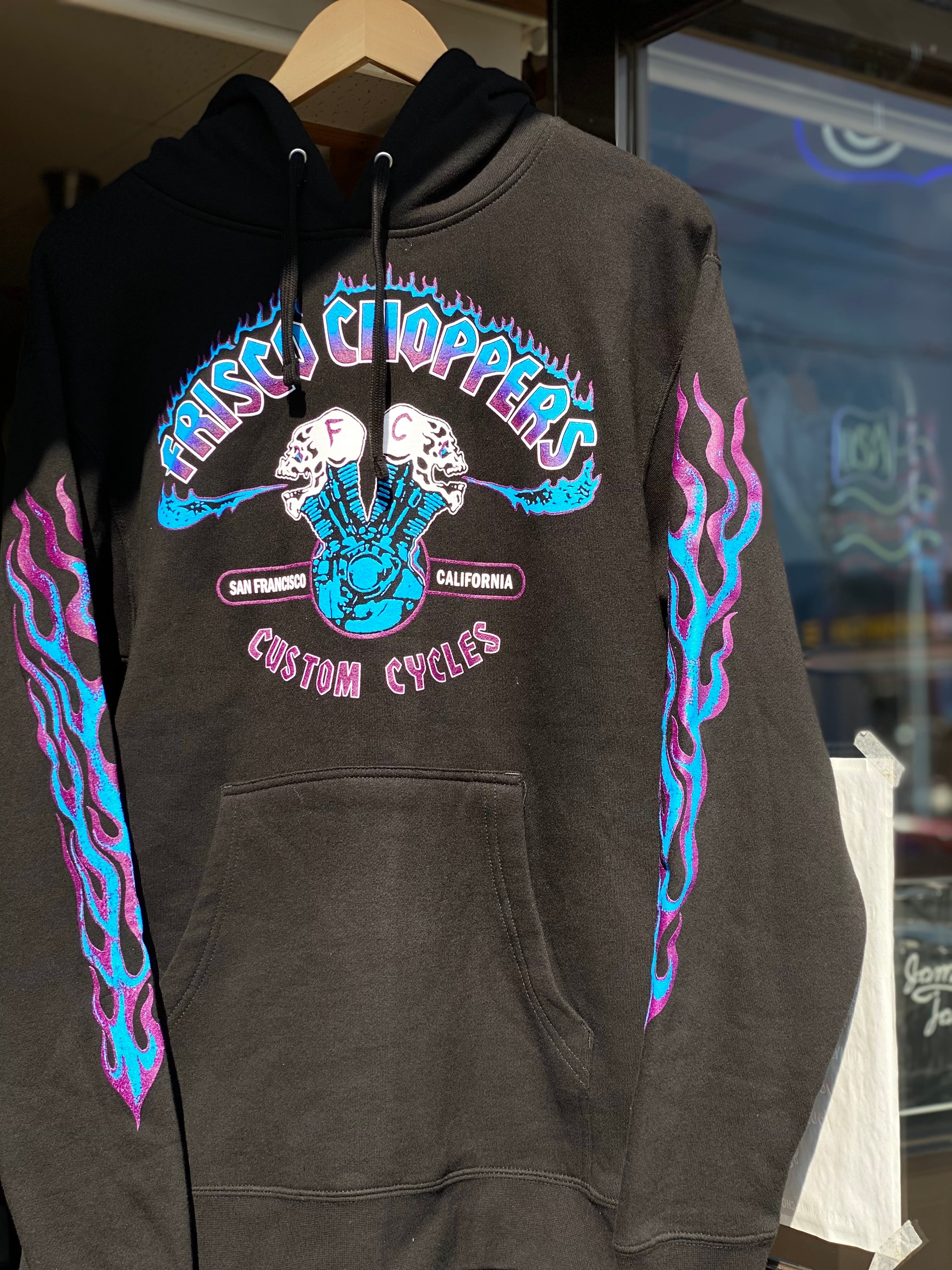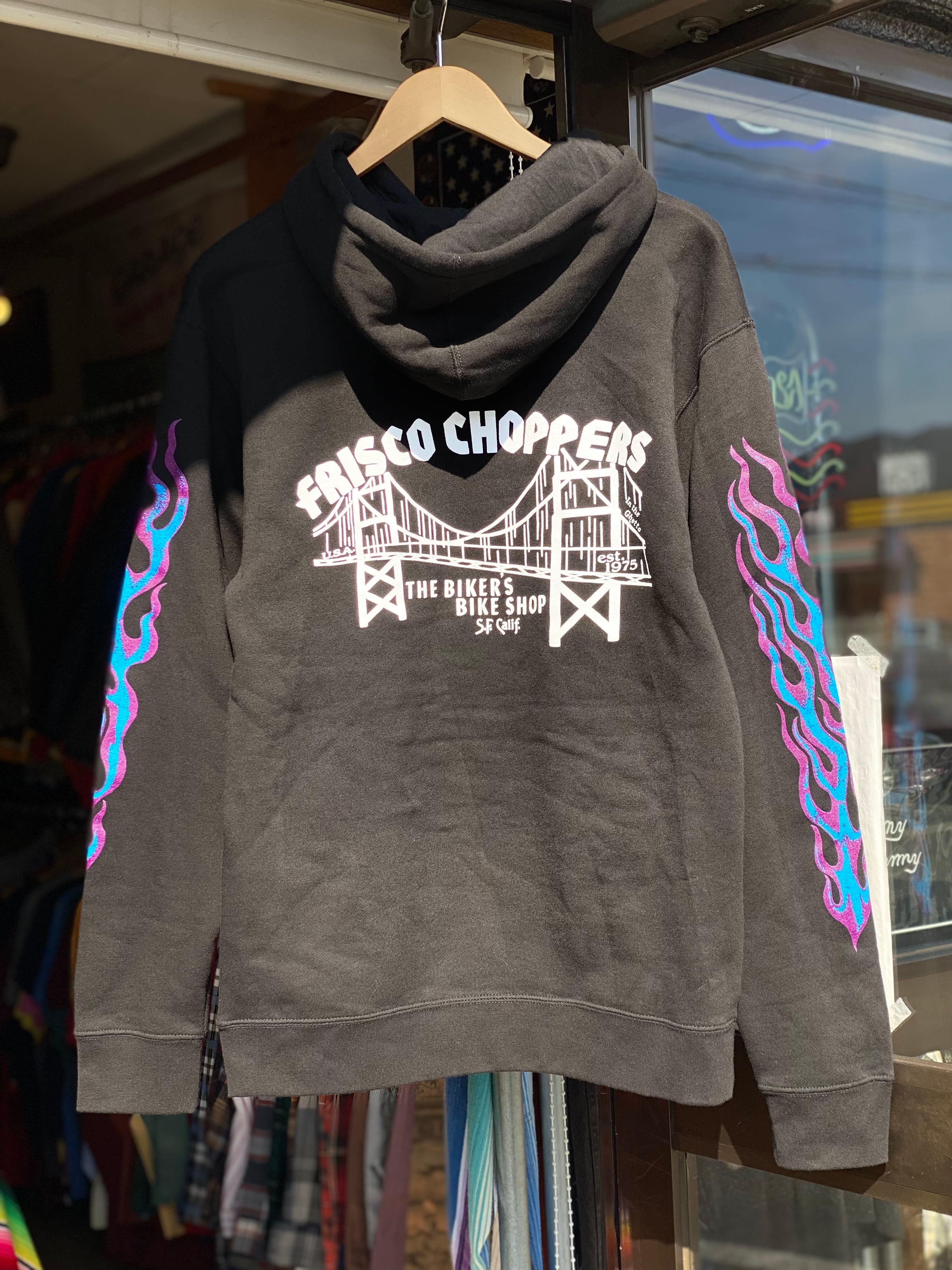 これぞFRISCO CHOPPERSであるトレードマークのFLAMING SKULLデザイン、そして袖にフレイムスのプリントが入るプルオーバーパーカーになります!