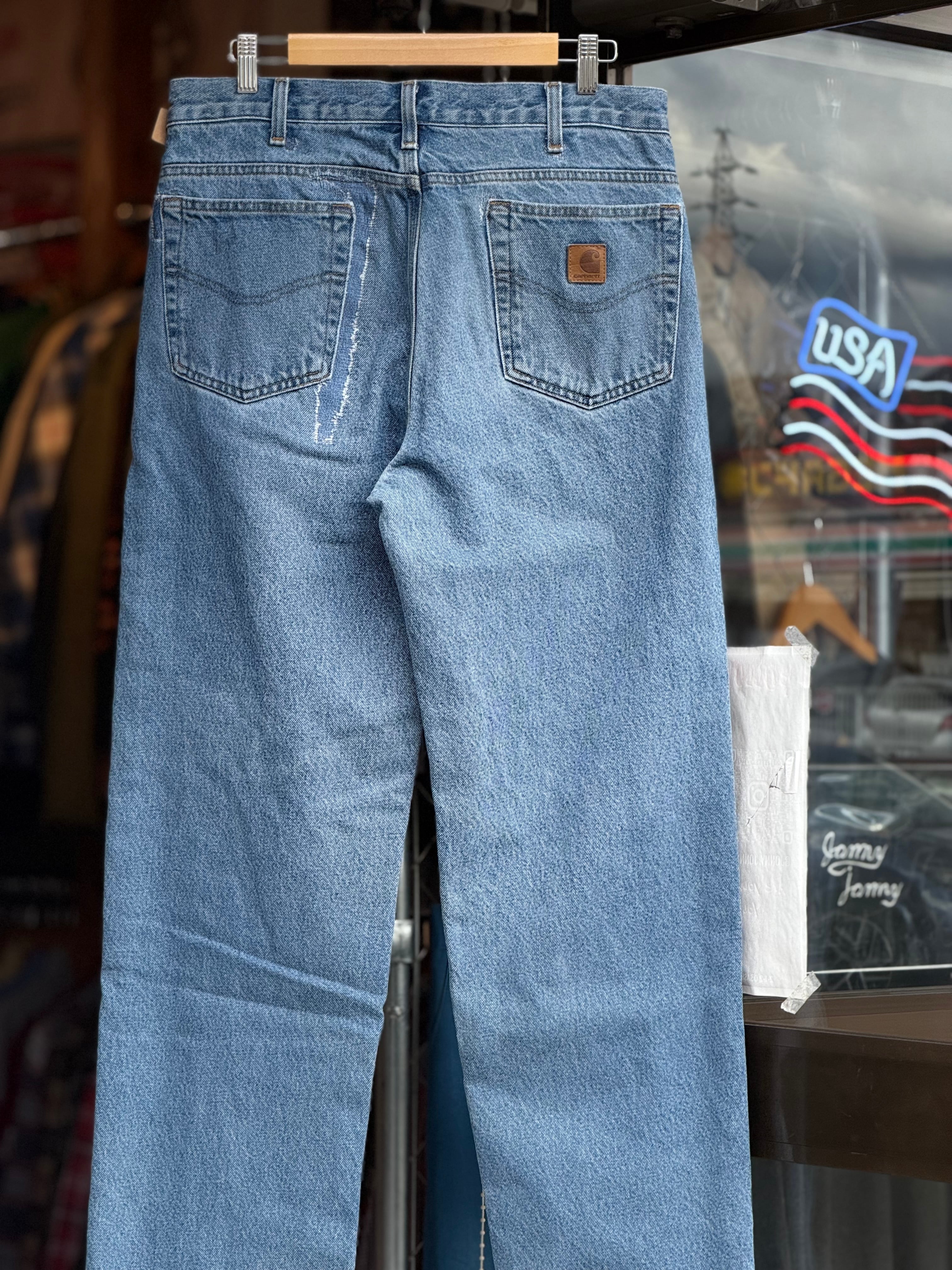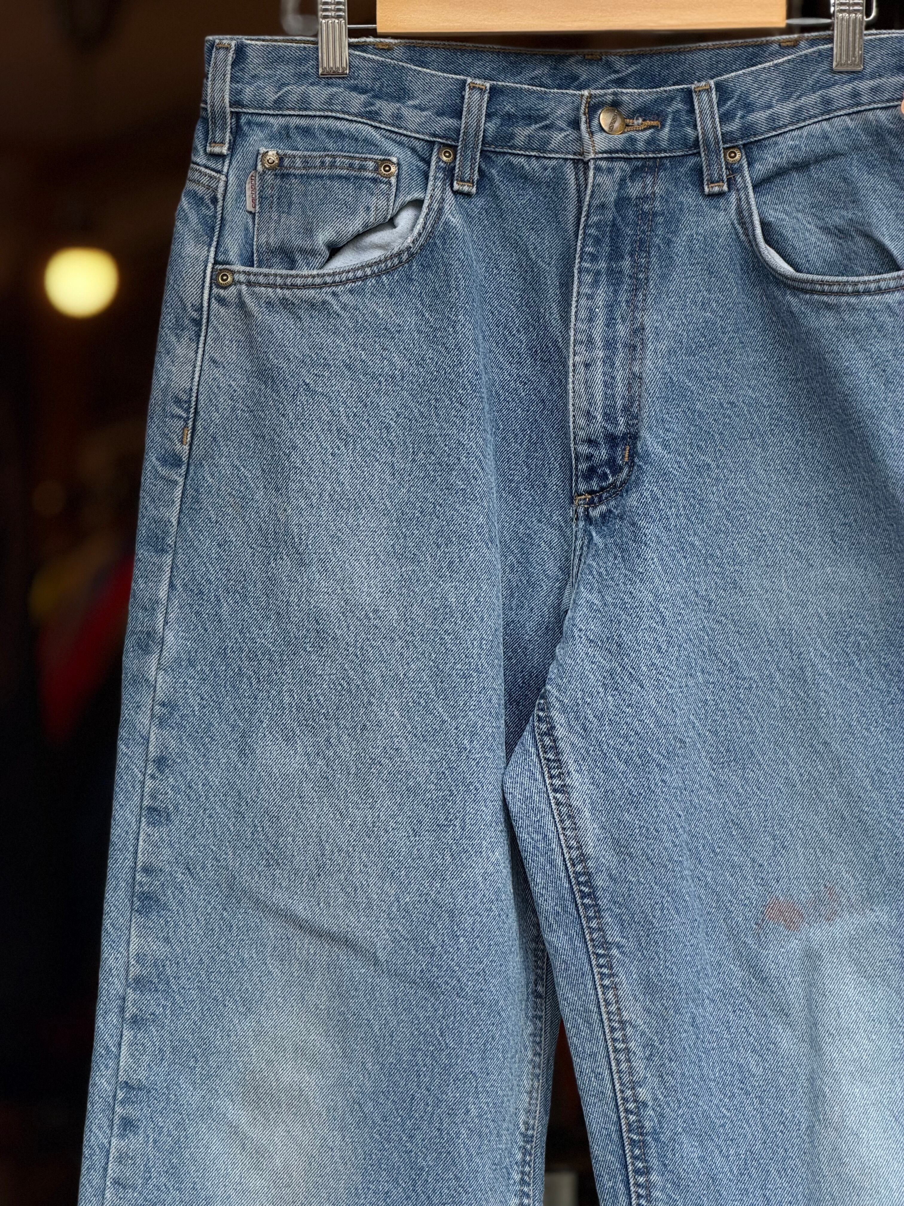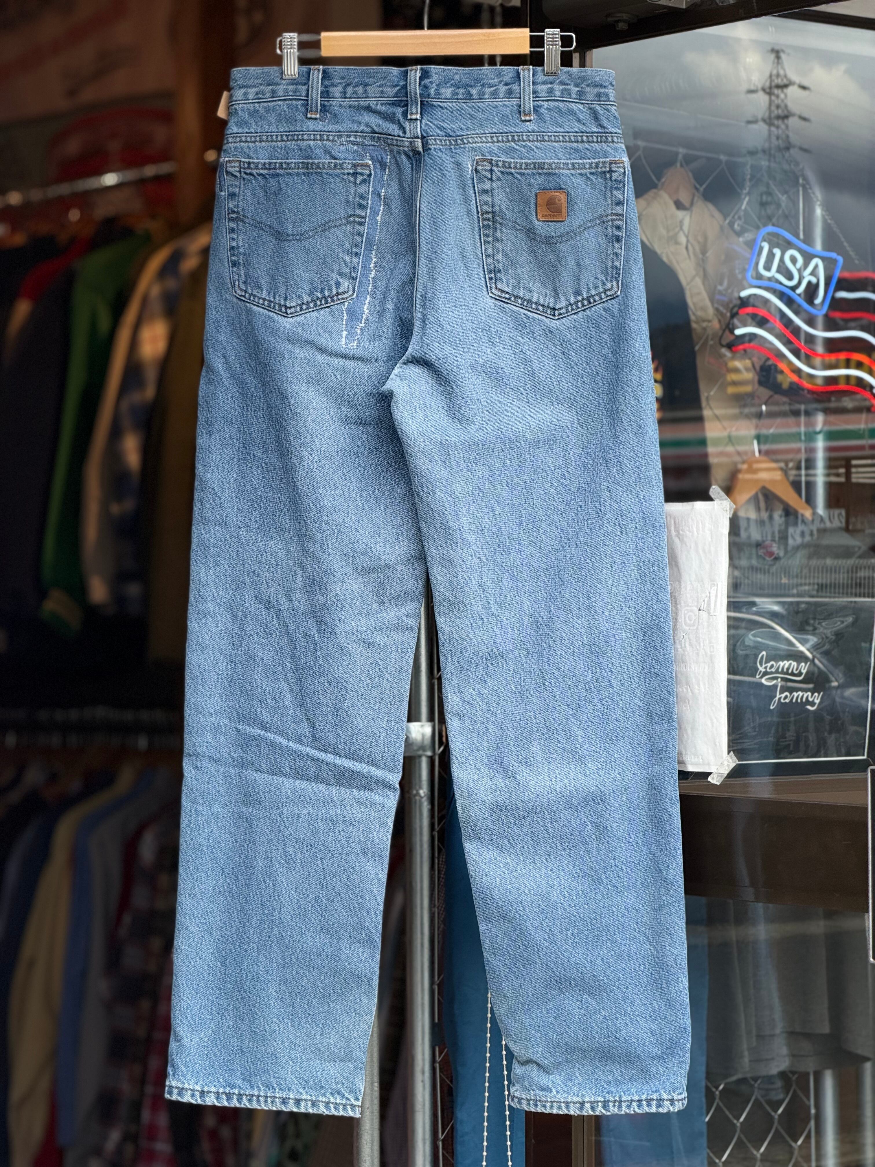 Carhartt 裏地付きデニムパンツ W34×L33 カーハート ジーンズ アイスブルー フランネルライナー relaxed fit カーハート テーパード リペア有 ジッパーフライ 古着 アメカジ ストリート