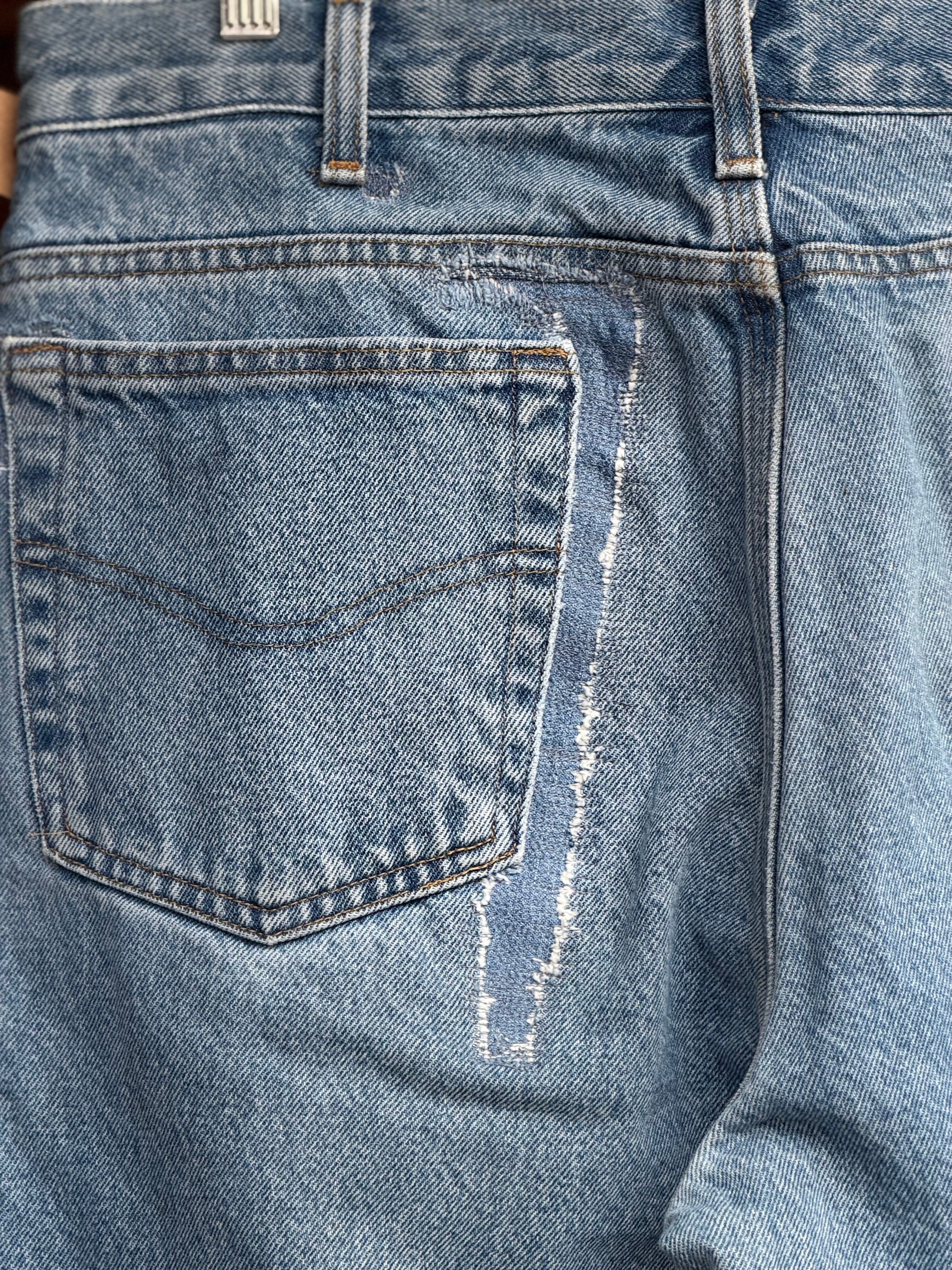 全体的に使用感があり、各後ろポケット周りにガッツリリペアが入ります。