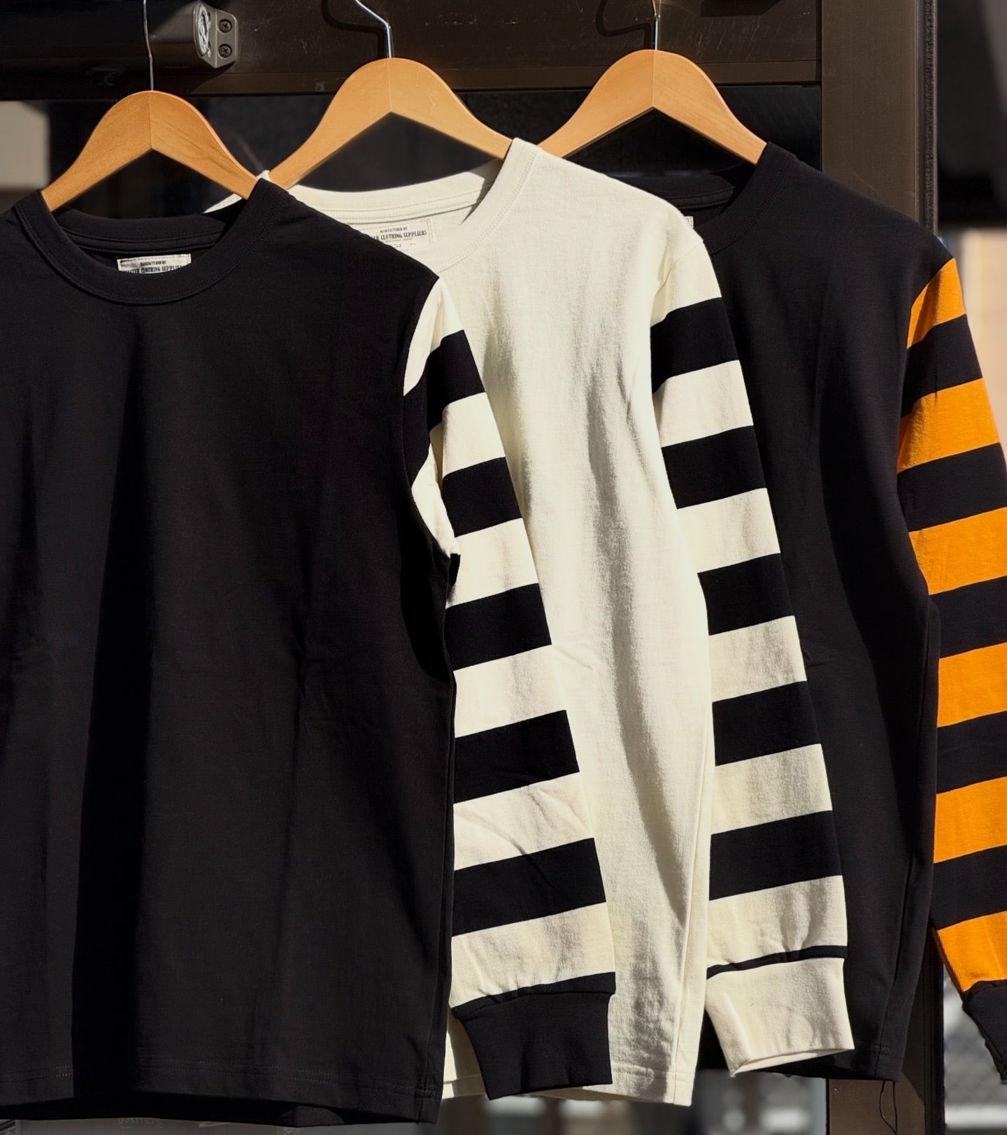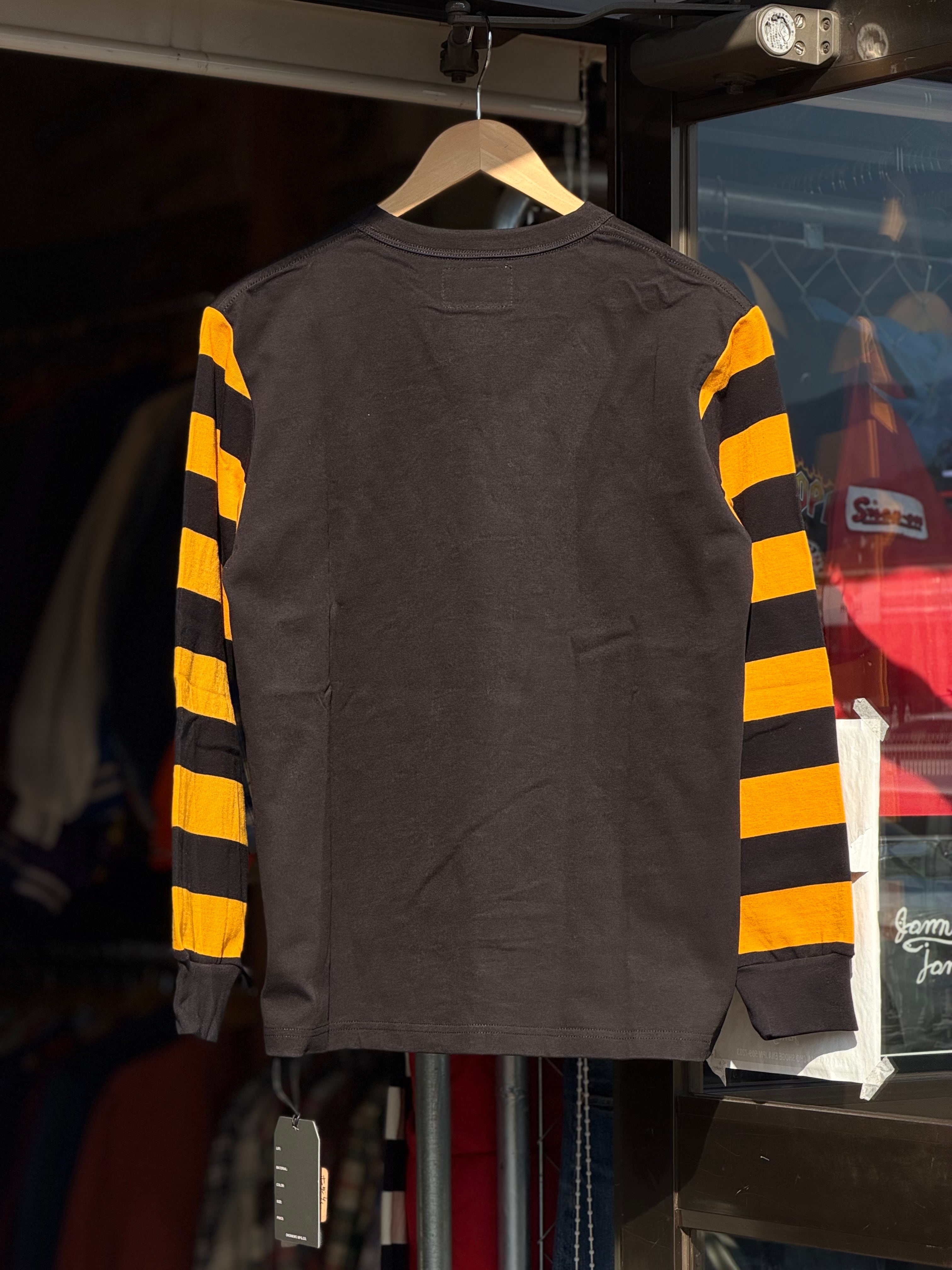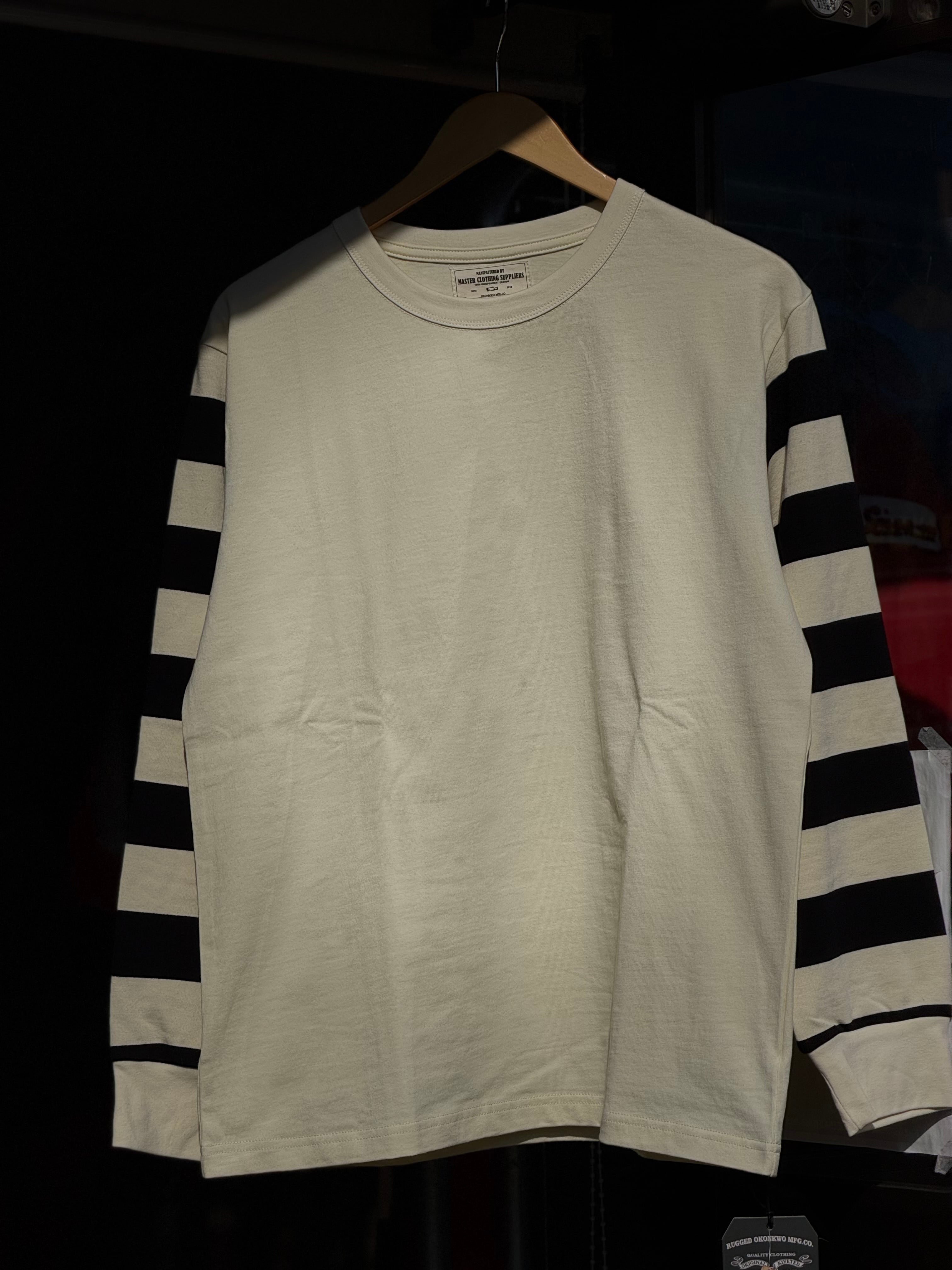 OKONKWO MFG.CO 袖ボーダーロングスリーブTシャツ ボーダースリーブ M L XL アメカジ バイカー 囚人 プリズナー ヘビーウェイト レイヤード 長袖Tシャツ ロンT 黒白 白黒 黒黄色 横縞 袖ボーダー バイク ハーレー乗り