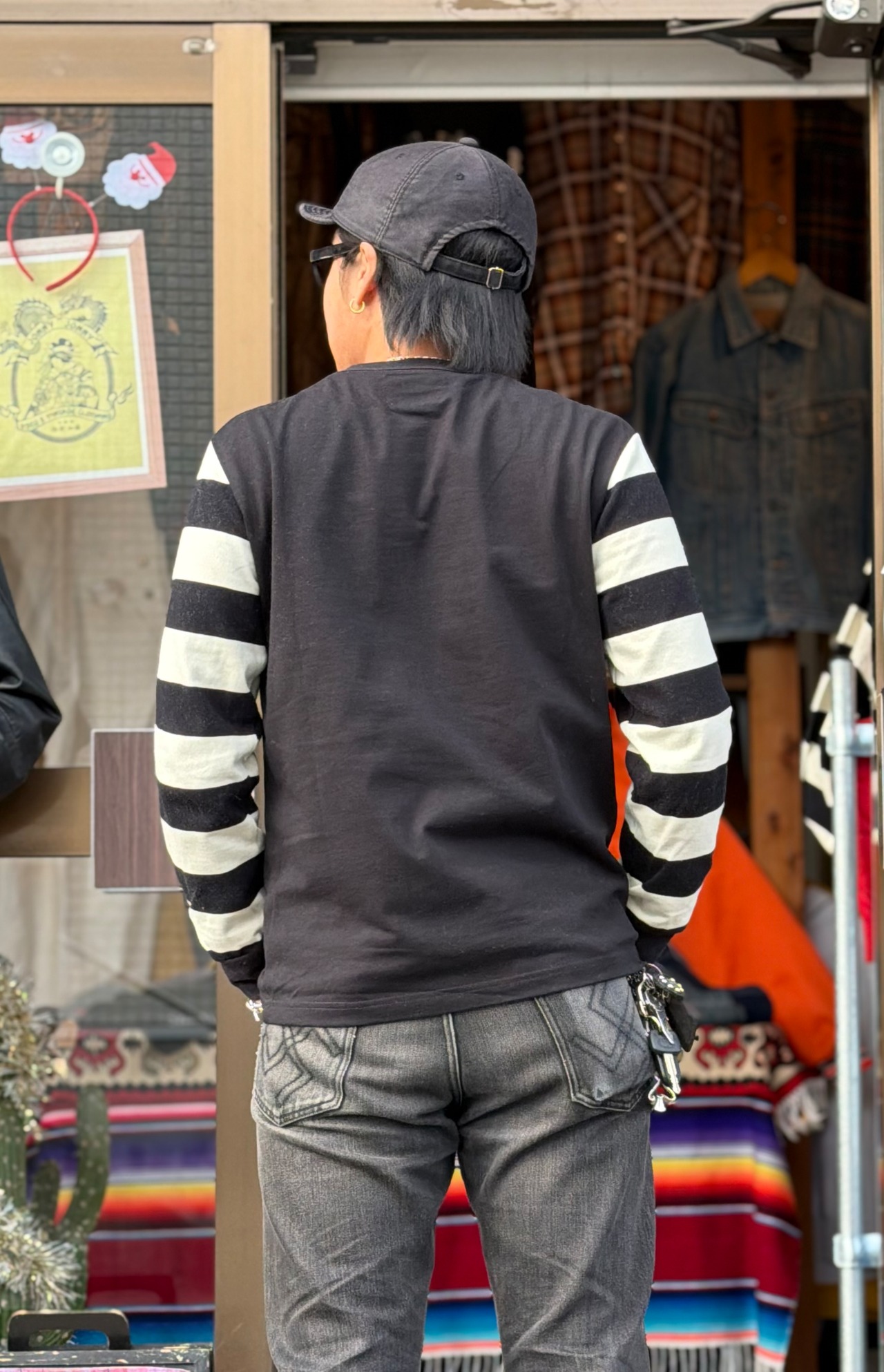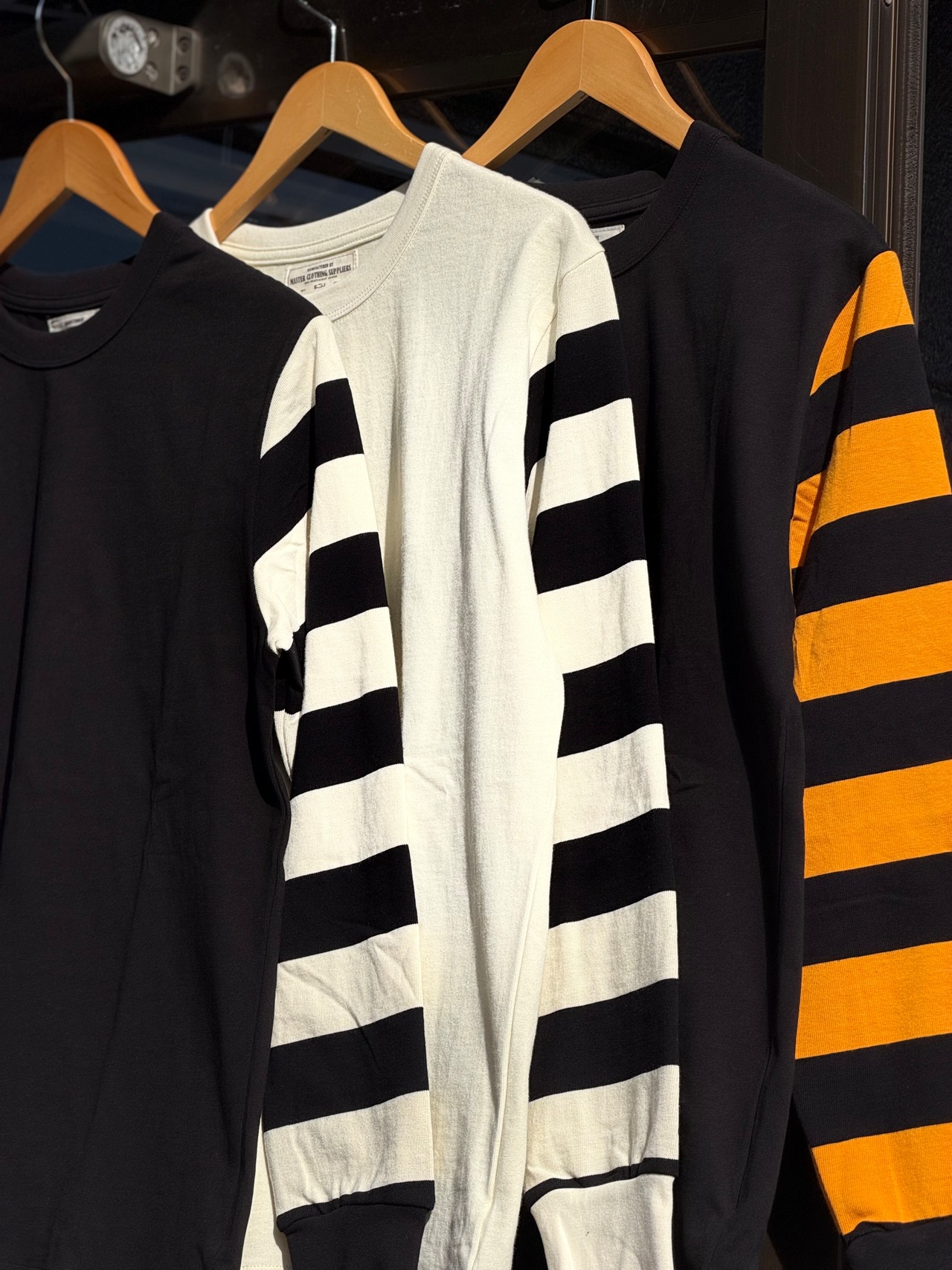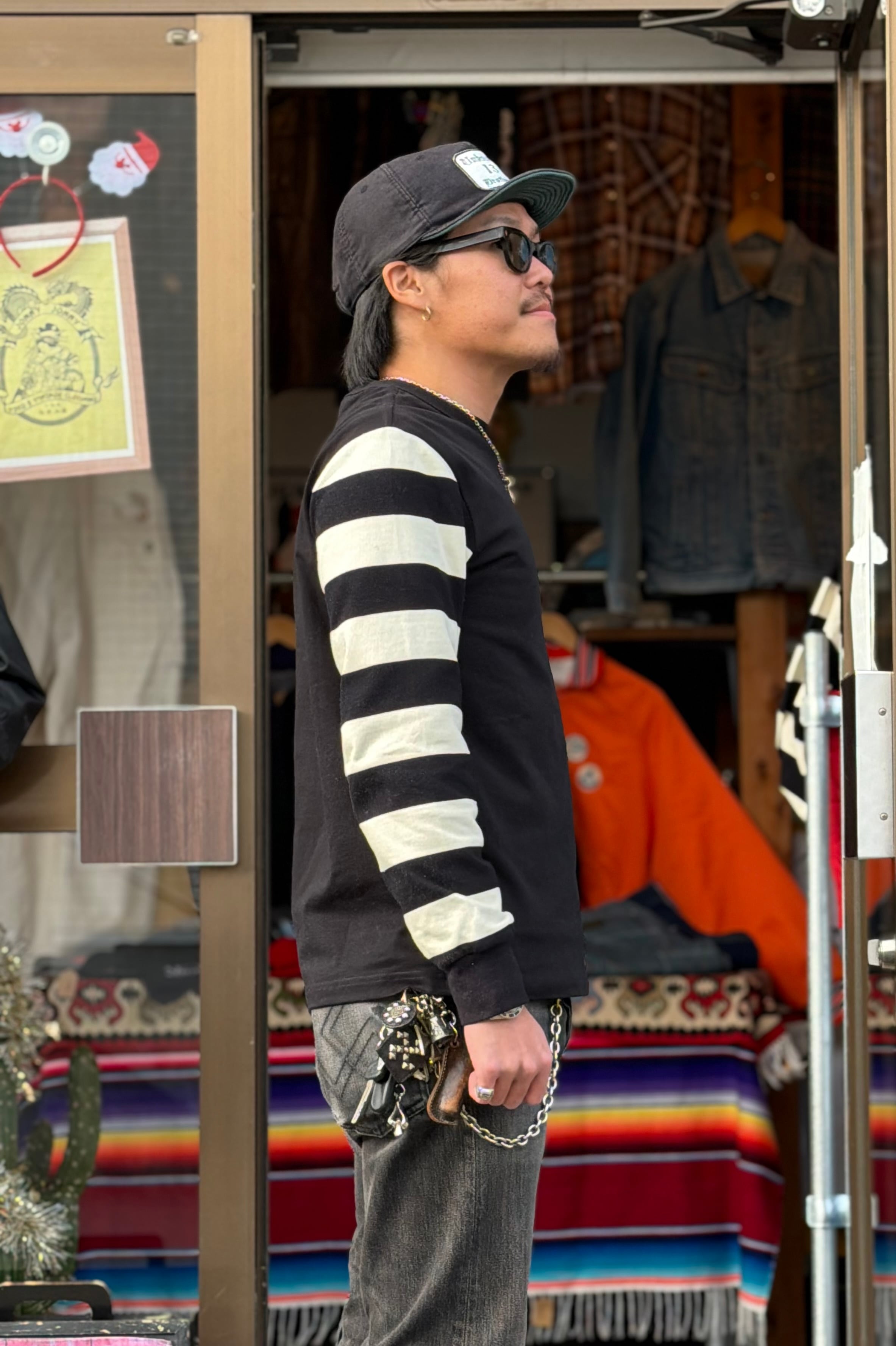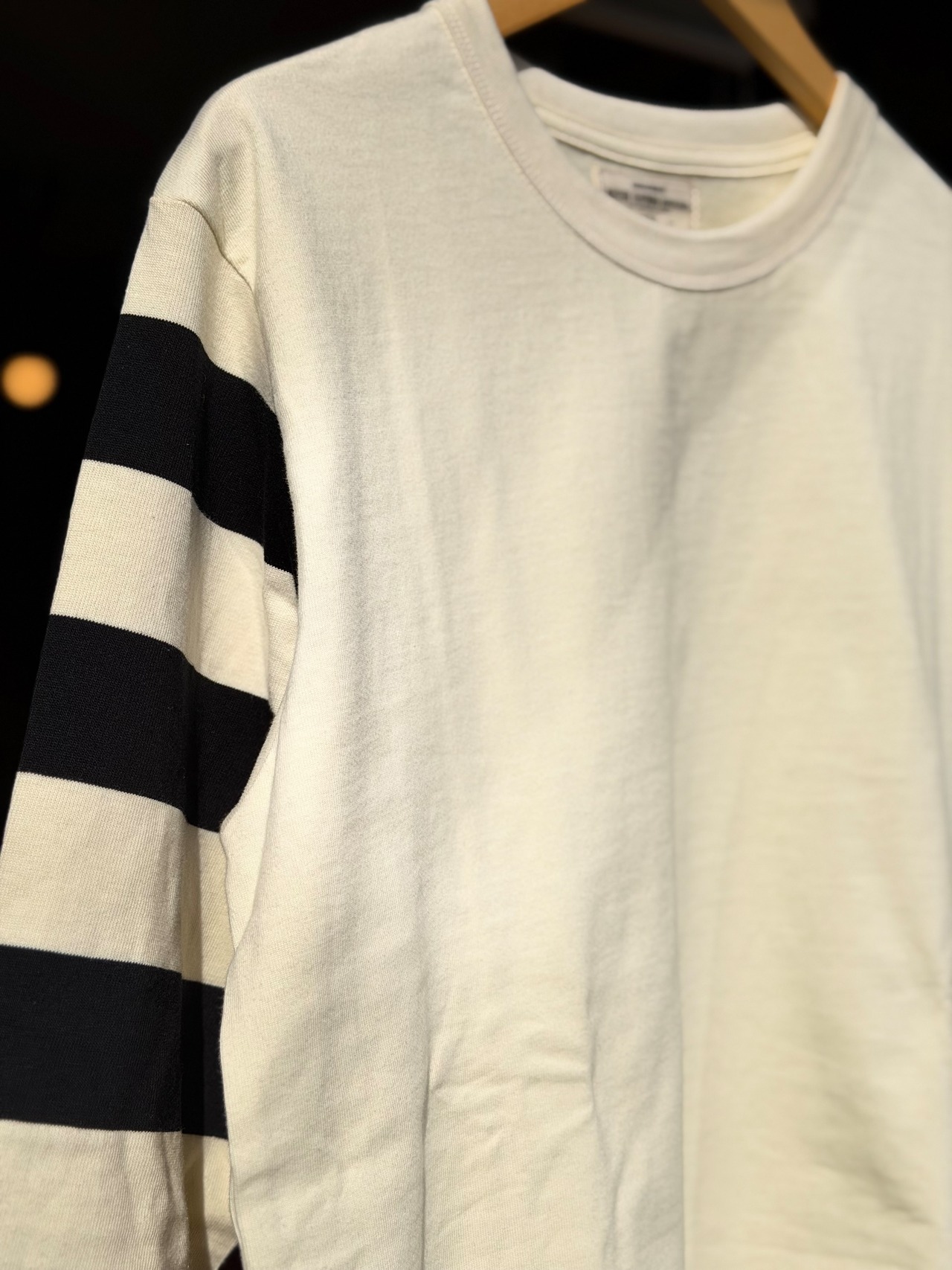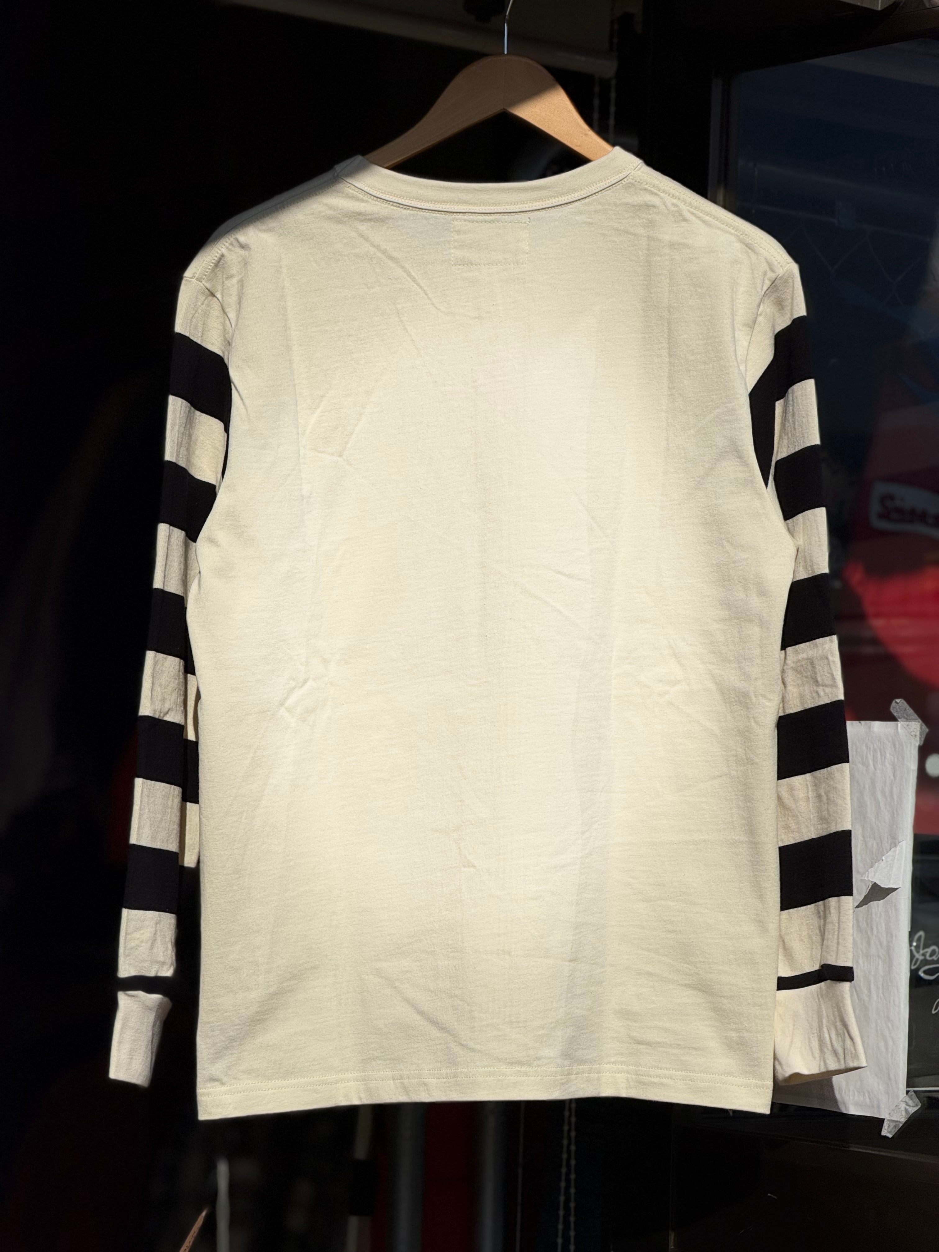バイカーカルチャーとは切っても切り離せない太めなピッチのボーダーパターンを採用し、全てがボーダーでは無く「ボディ部分は単色、腕部分は囚人服等を思わせるボーダーパターン」という切り替えになっています。