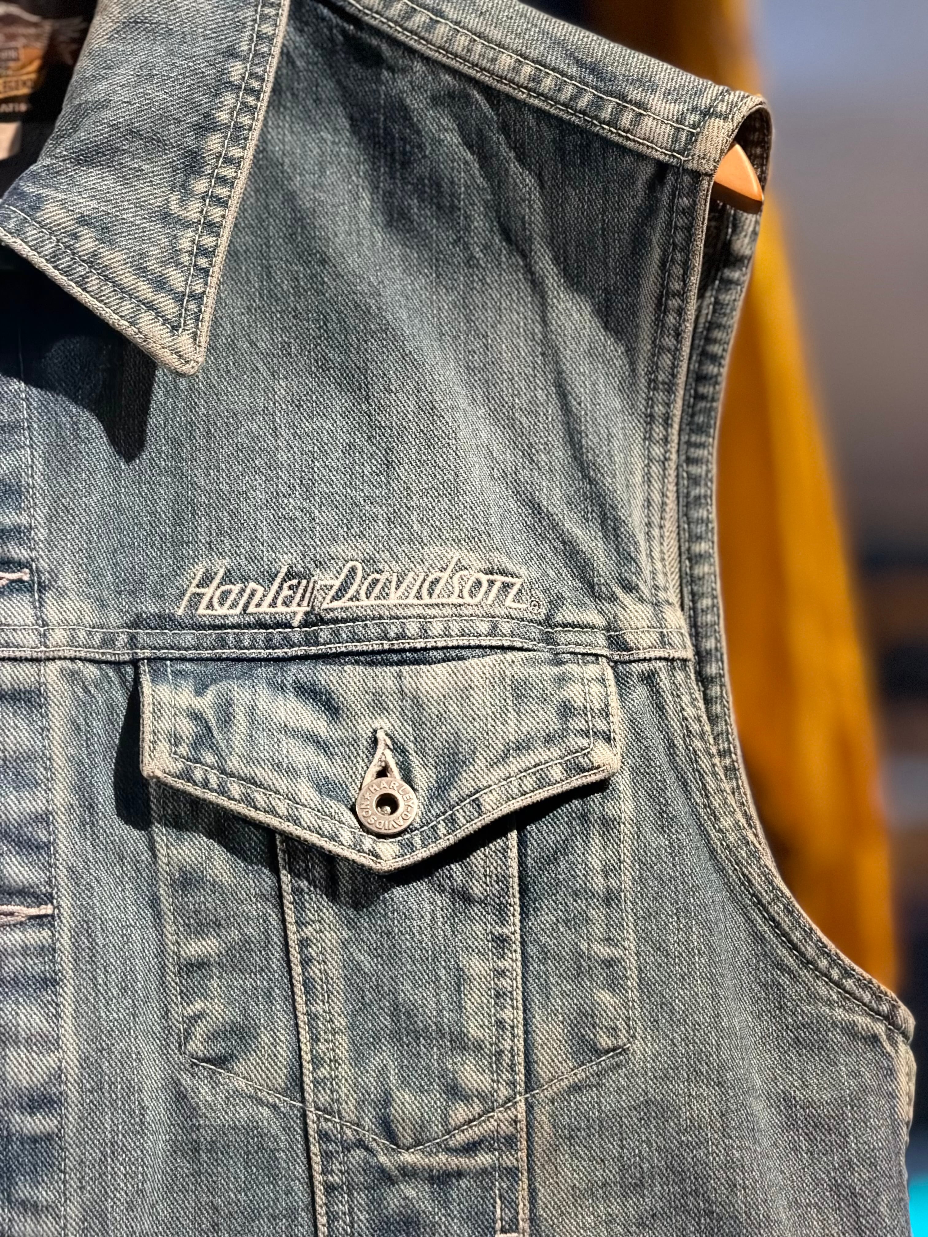 HARLEY-DAVIDSON "BORN IN THE U.S.A." 刺繍入りデニムベスト Lサイズ カットオフ デニムジャケット ハーレーダビッドソン イーグル アメカジ バイカー バイク Gベスト 古着