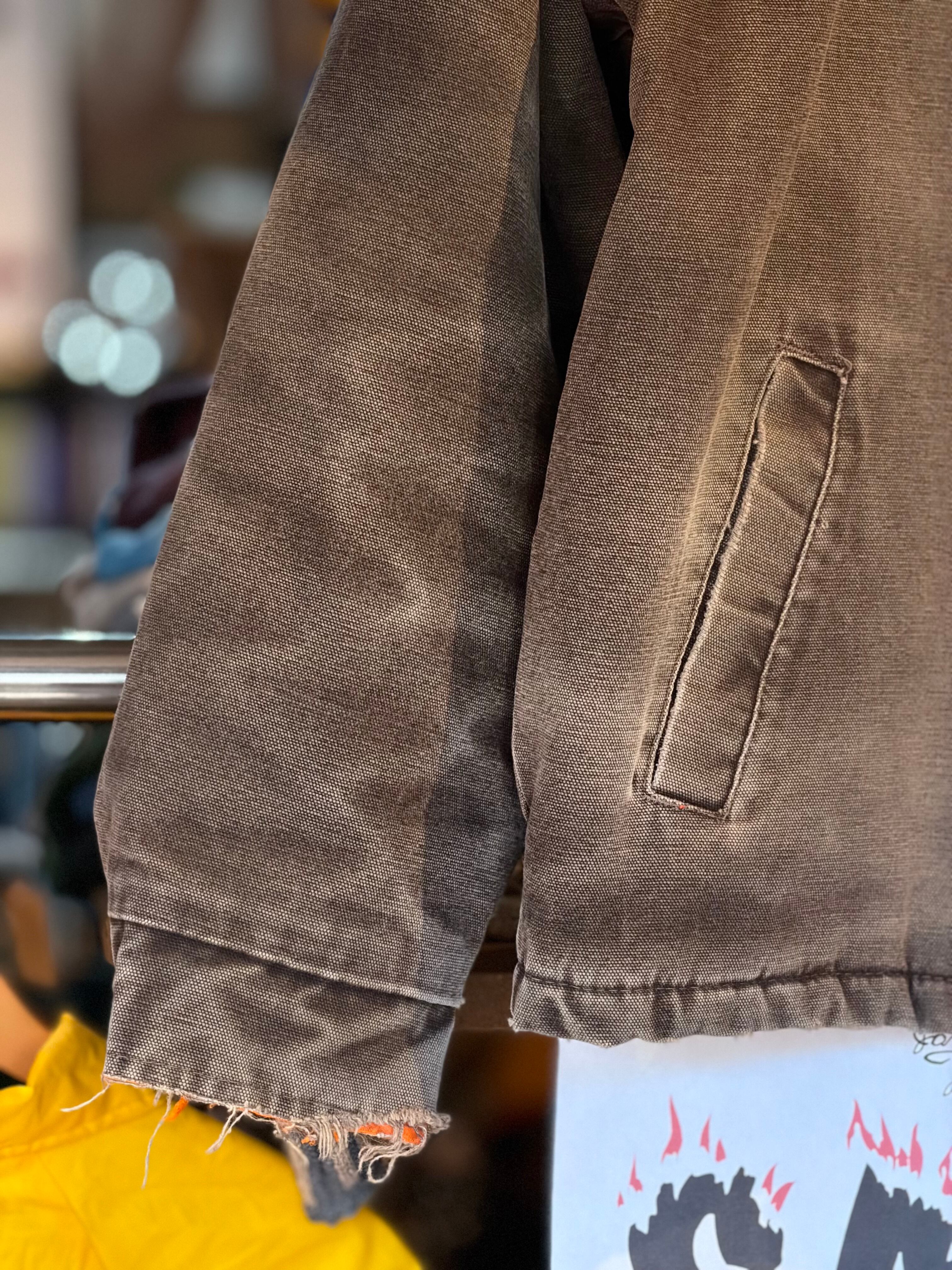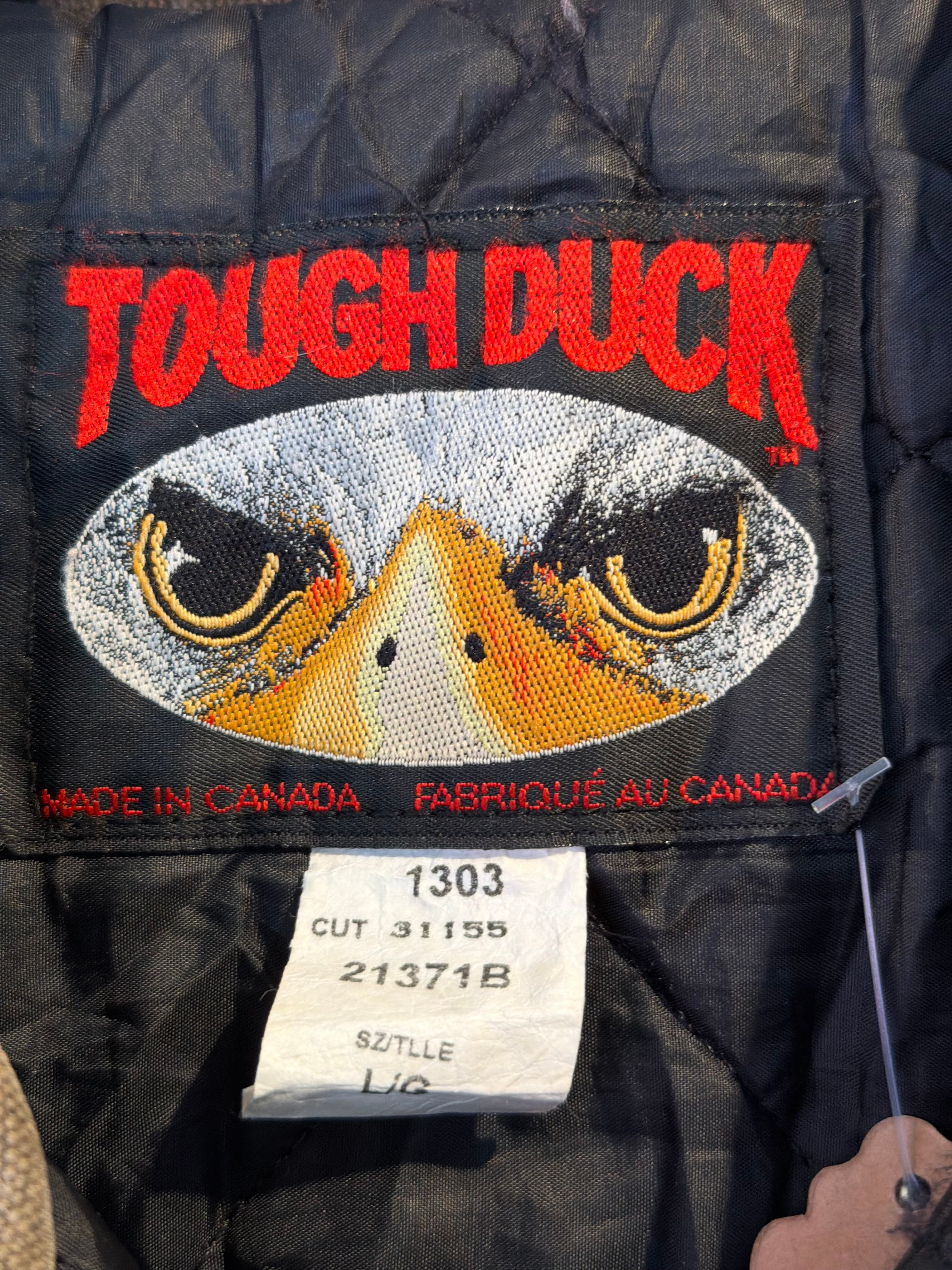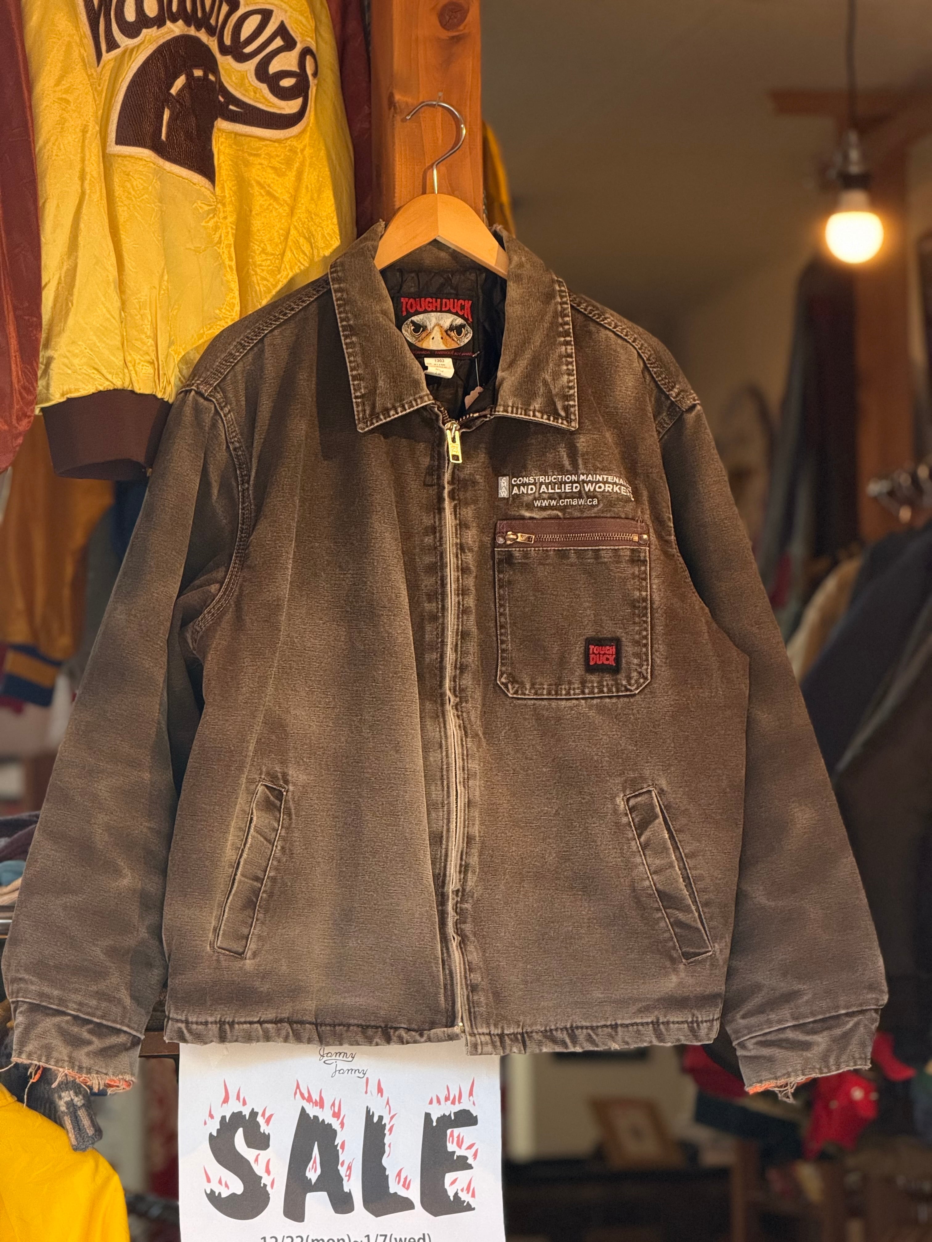 90's TOUGH DUCK キャンバスダックワークジャケット MADE IN CANADA Lサイズ カナダ製 デトロイトジャケット ダックジャケット フェード 鬼ヒゲ 袖口ダメージ アメカジ 古着 ダークブラウン カーハート carhartt