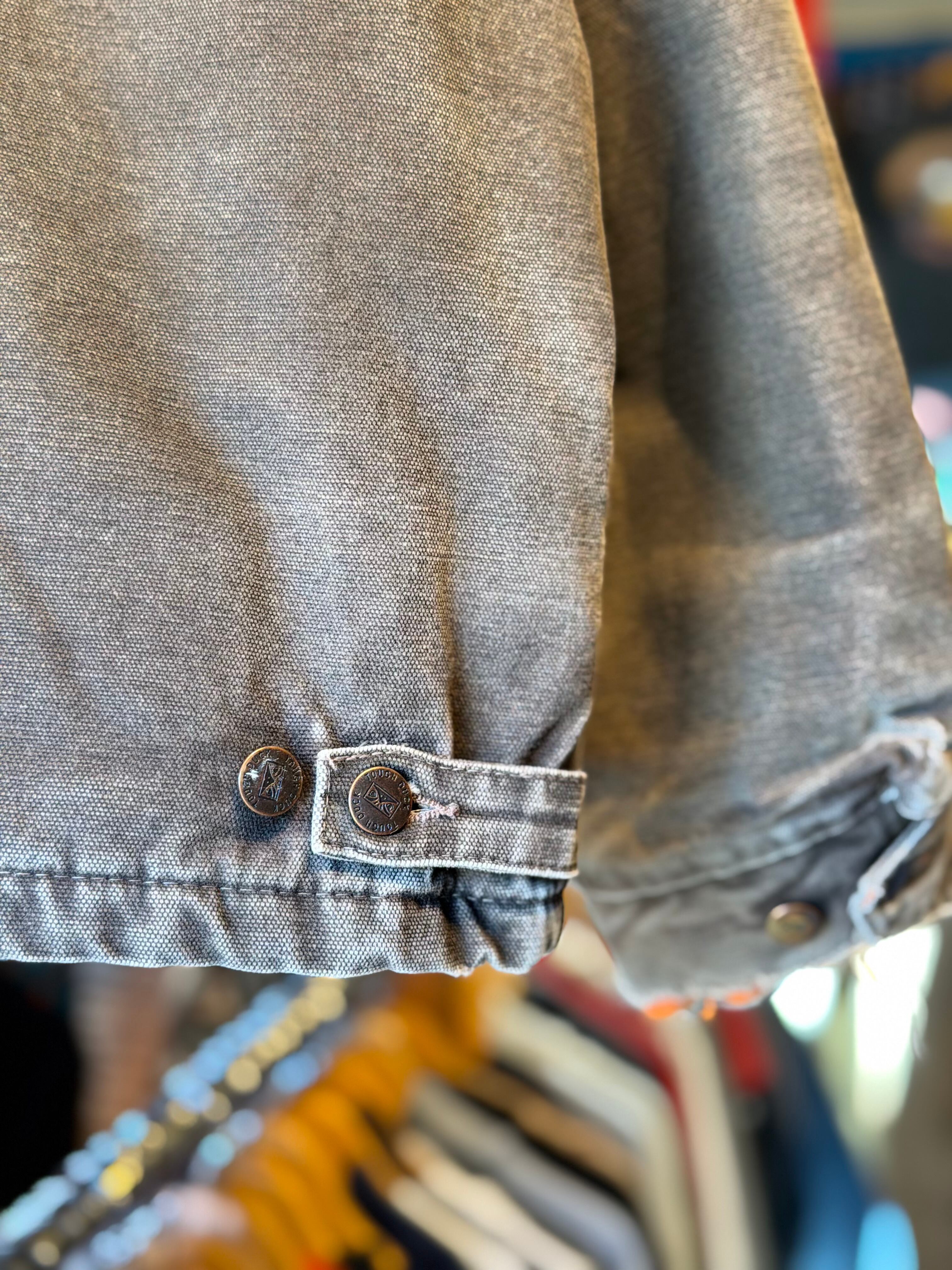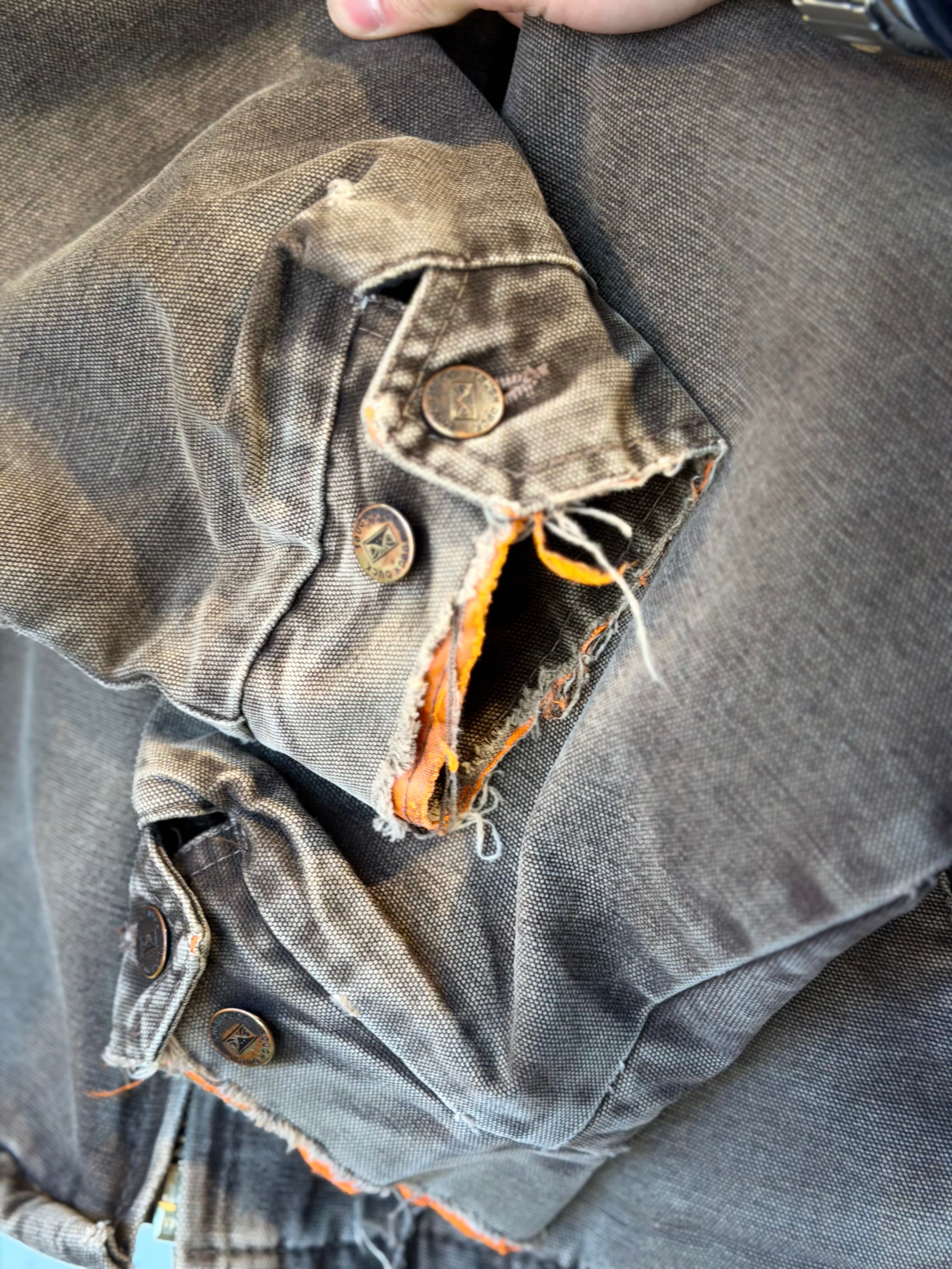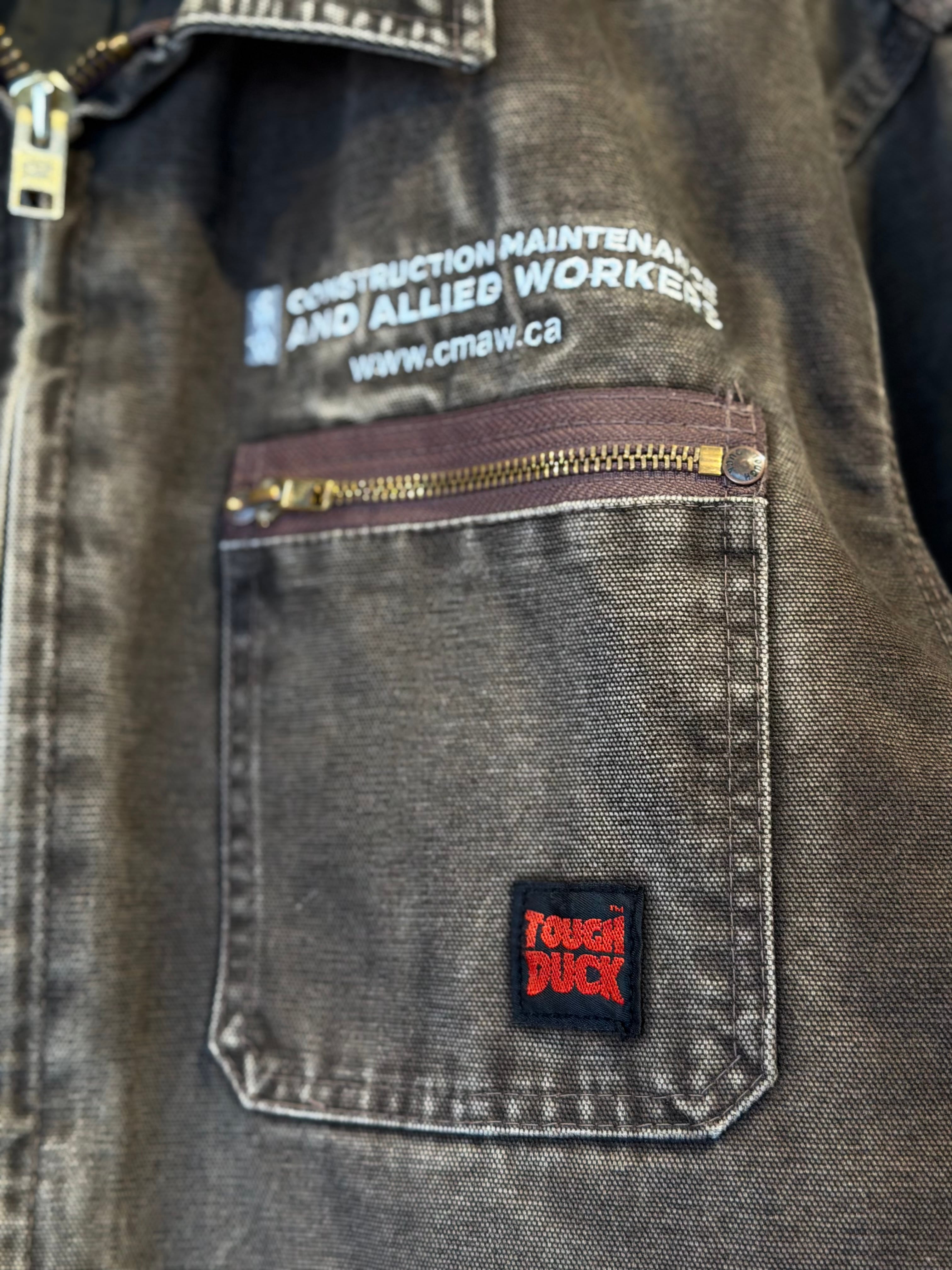 90's TOUGH DUCK キャンバスダックワークジャケット MADE IN CANADA Lサイズ カナダ製 デトロイトジャケット ダックジャケット フェード 鬼ヒゲ 袖口ダメージ アメカジ 古着 ダークブラウン カーハート carhartt