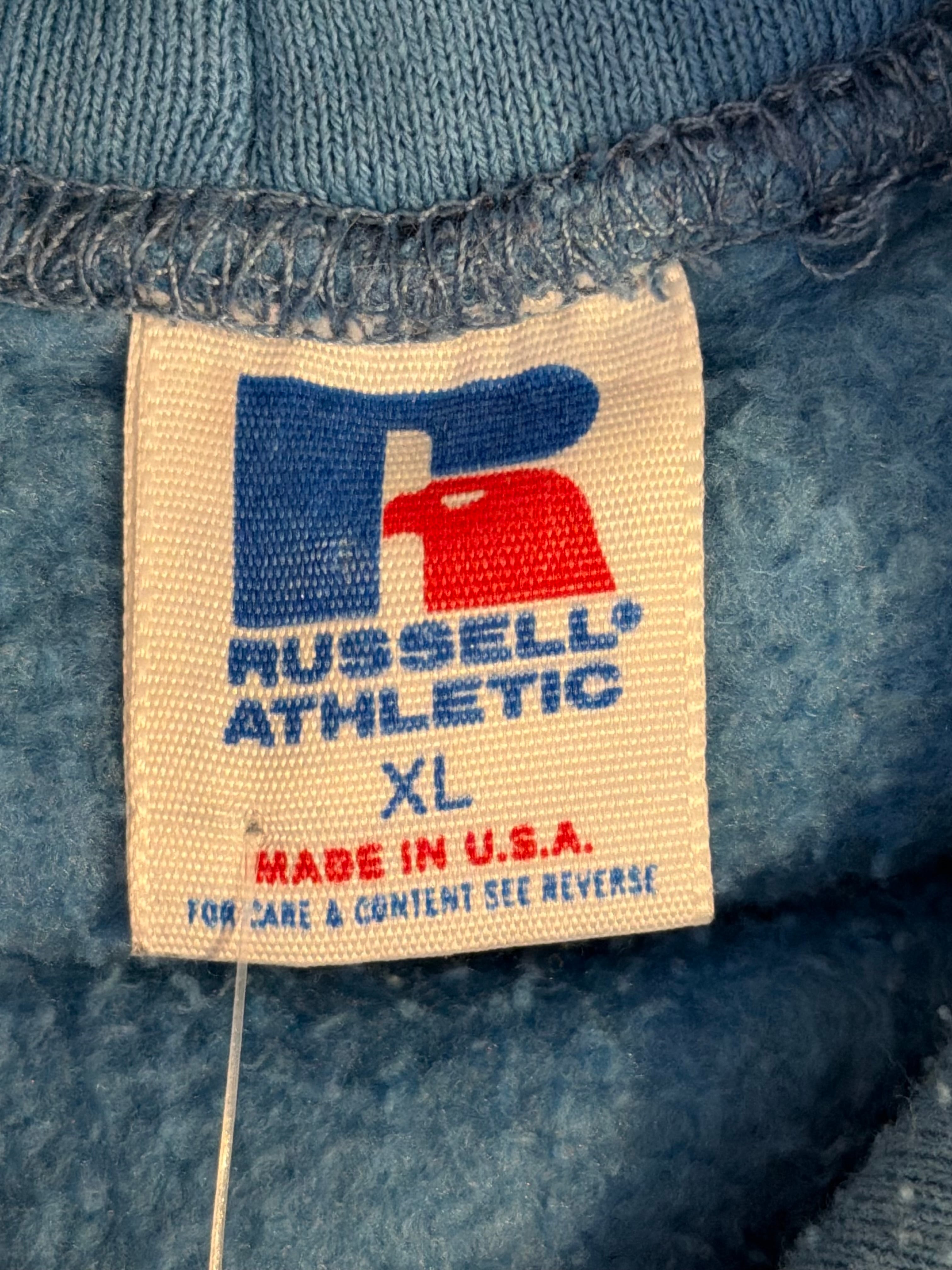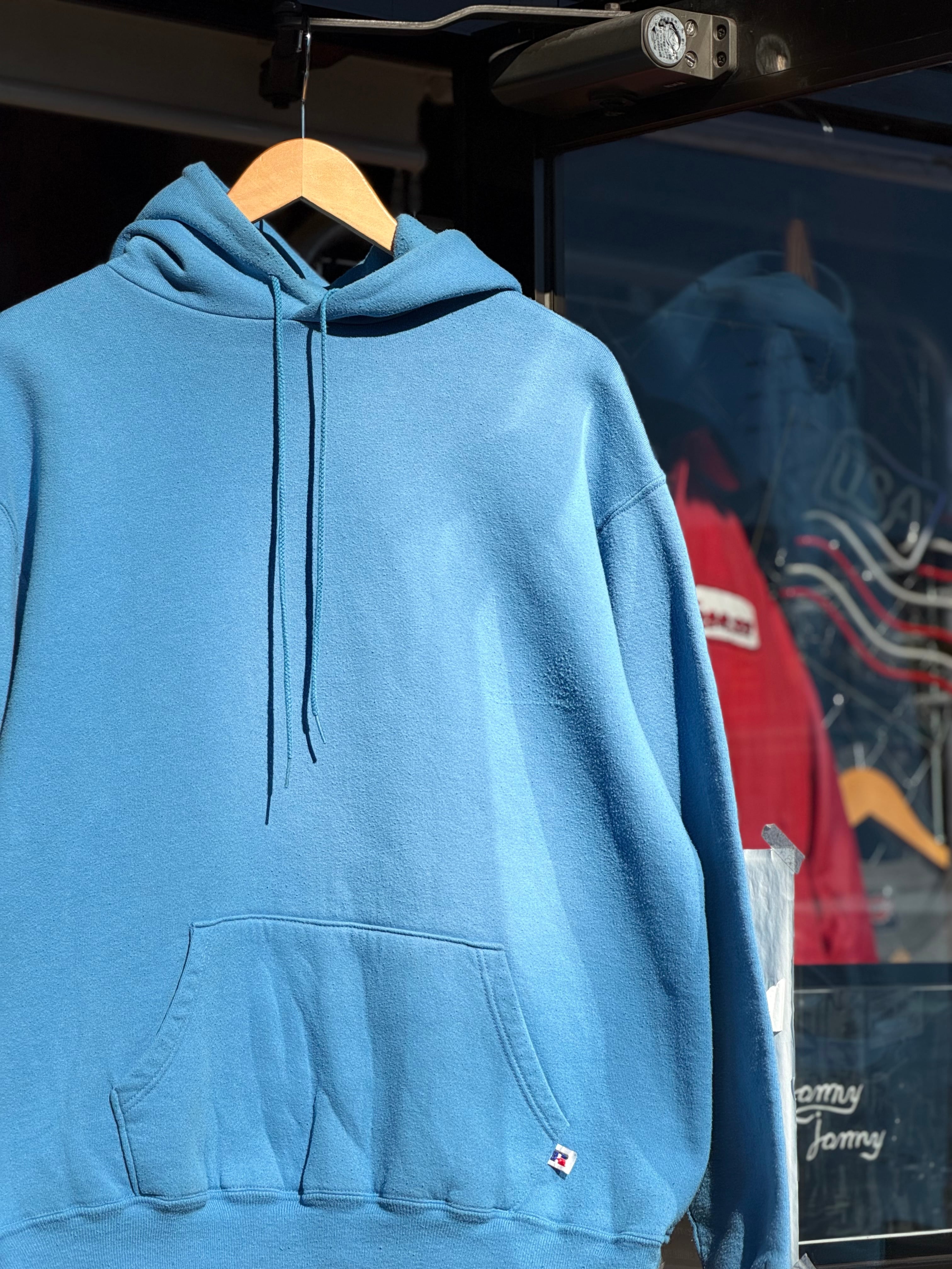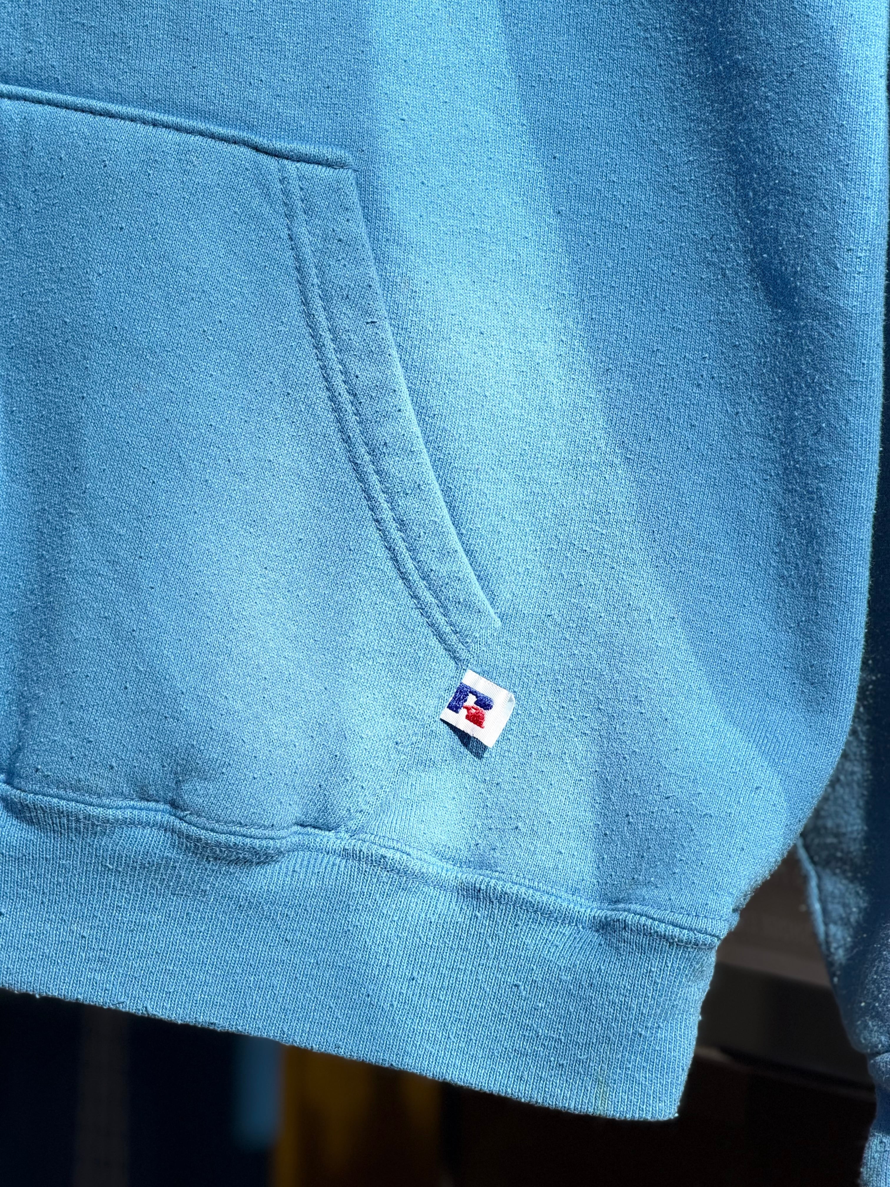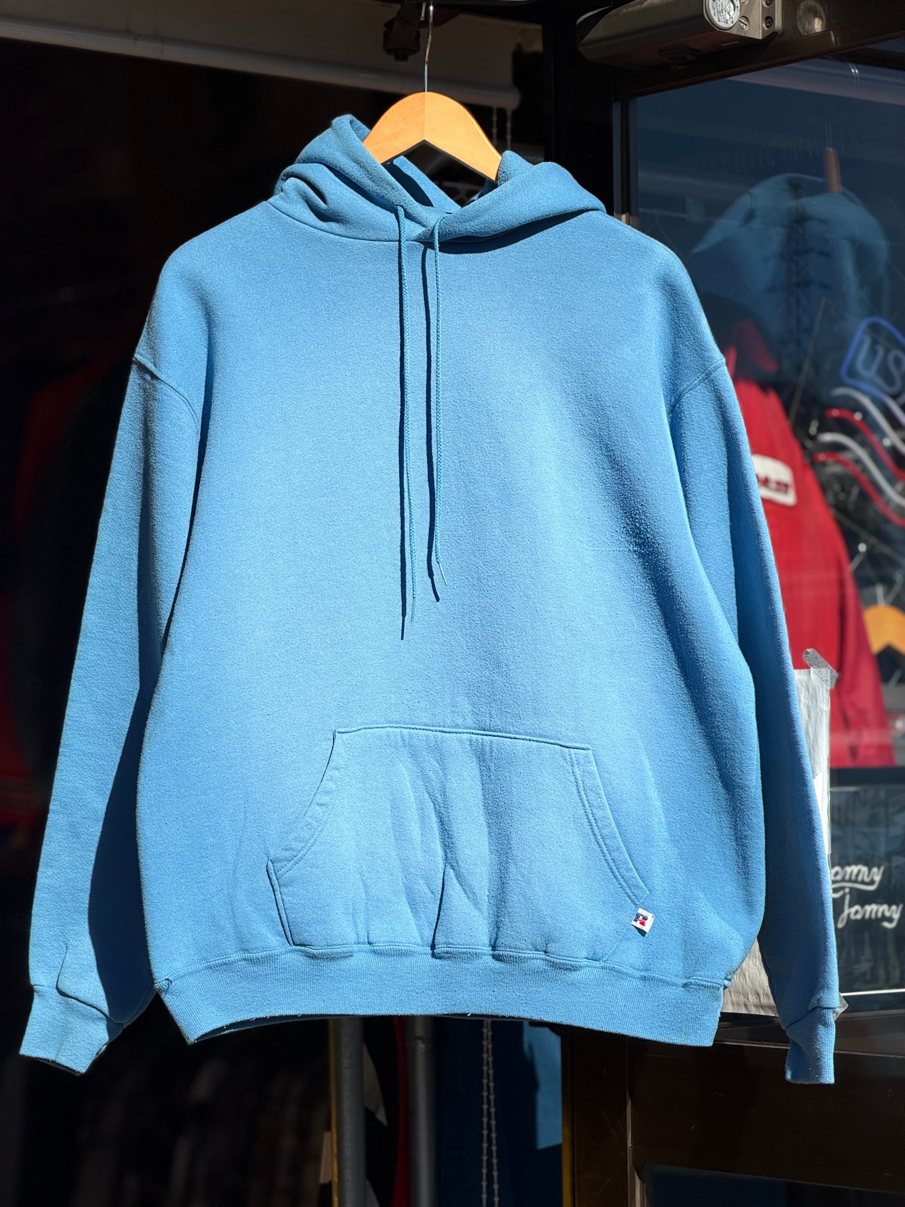 80~90's RUSSELL ATHLETIC 無地プルオーバーパーカー MADE IN U.S.A. XLサイズ 短丈 ライトブルー 水色 ボックスシルエット アメリカ製 ラッセルアスレチック 被りパーカー フーディ スウェット アメカジ 無地 シンプル