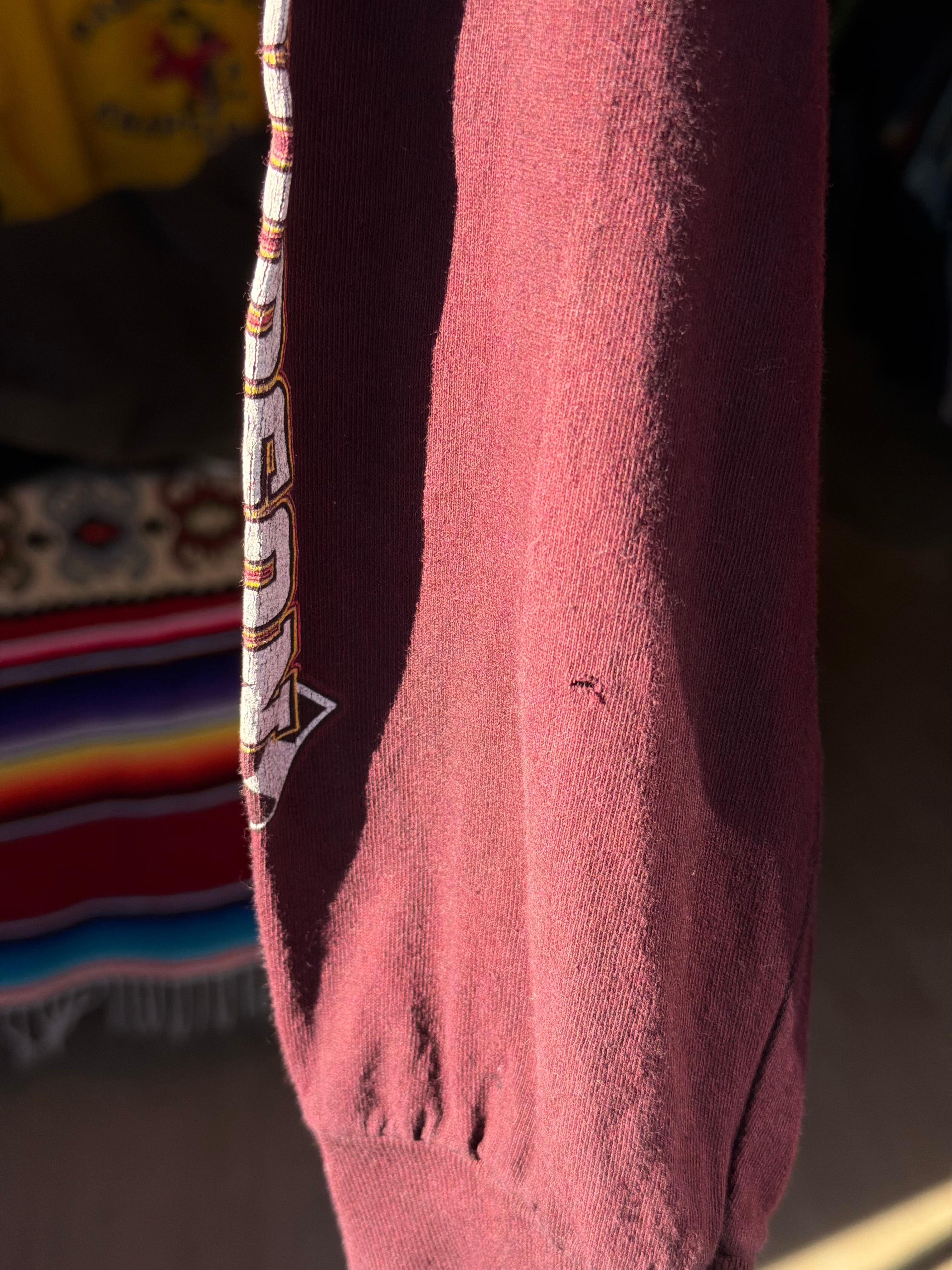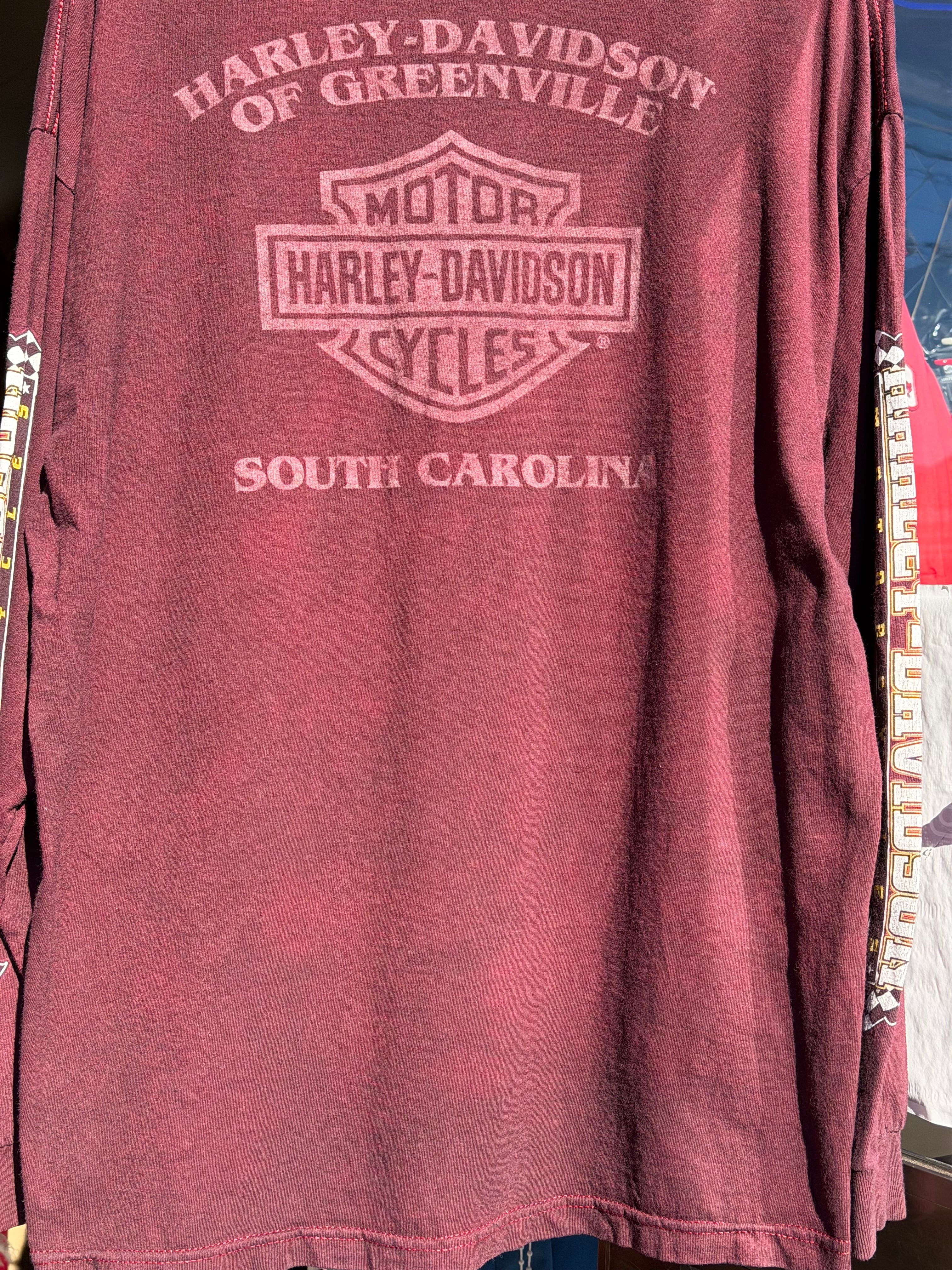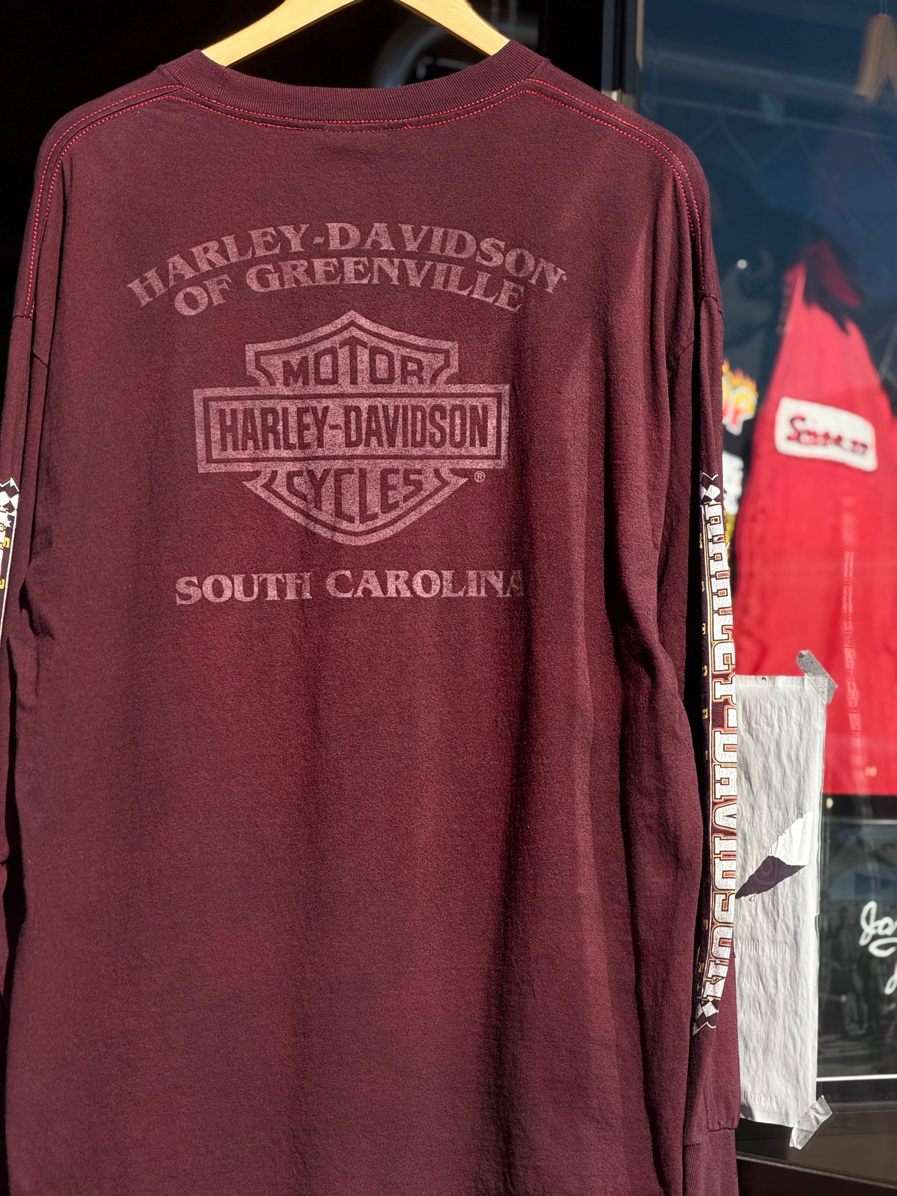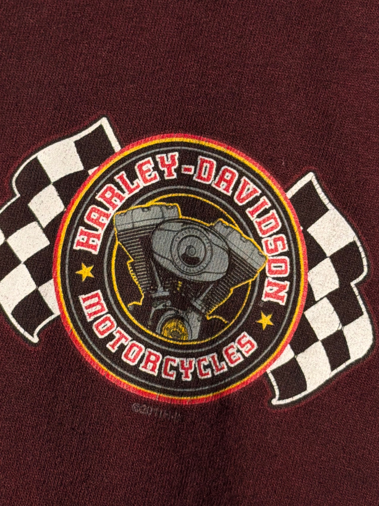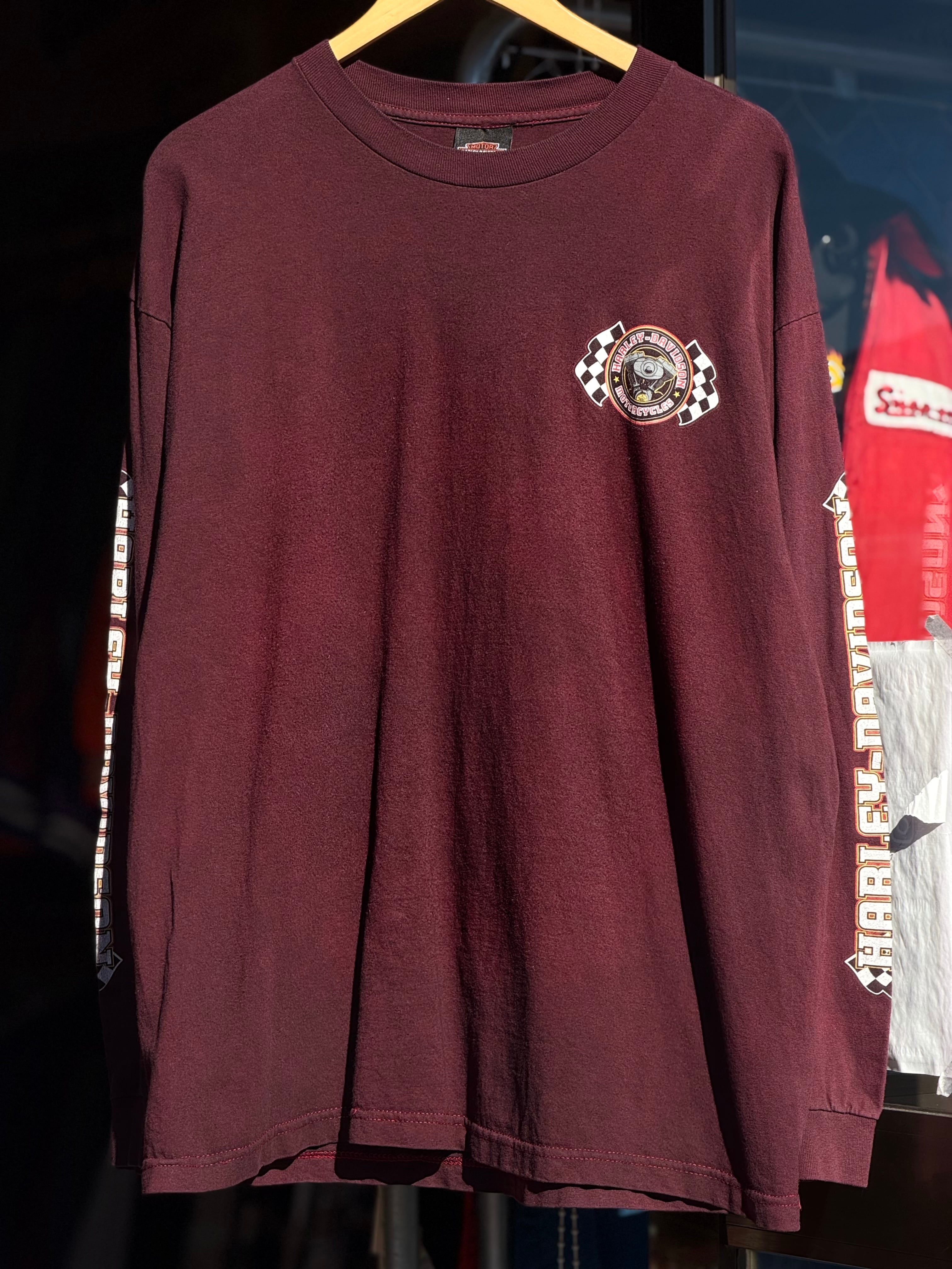 HARLEY-DAVIDSON 後染め長袖Tシャツ XLサイズ バーガンディ ブラック 後染め オーバーダイ 黒染め チェッカーフラッグ 袖プリ スリーブプリント ハーレーダビッドソン ロンT シンプル バイカー アメカジ 古着 ハンドメイド 2011年