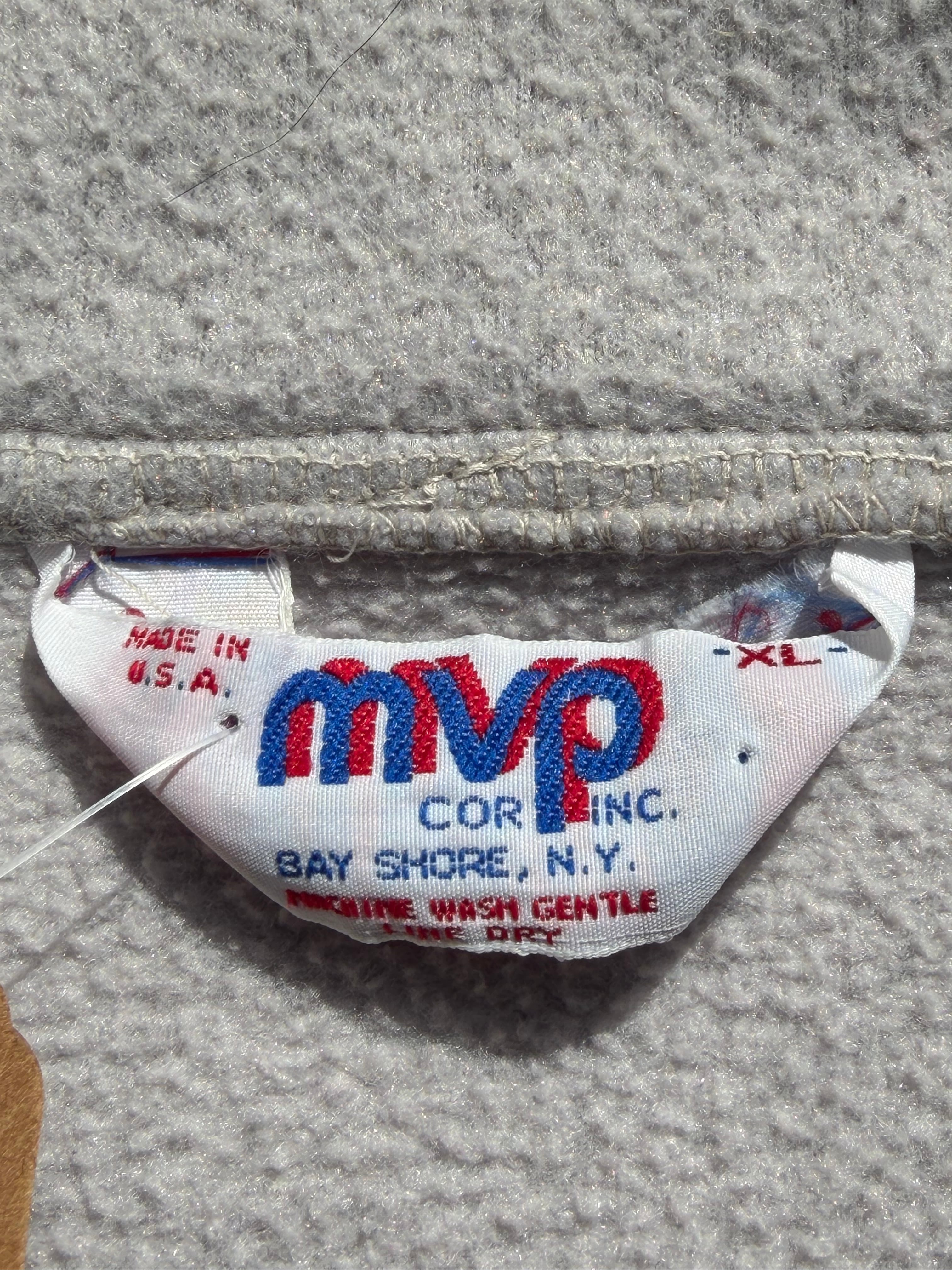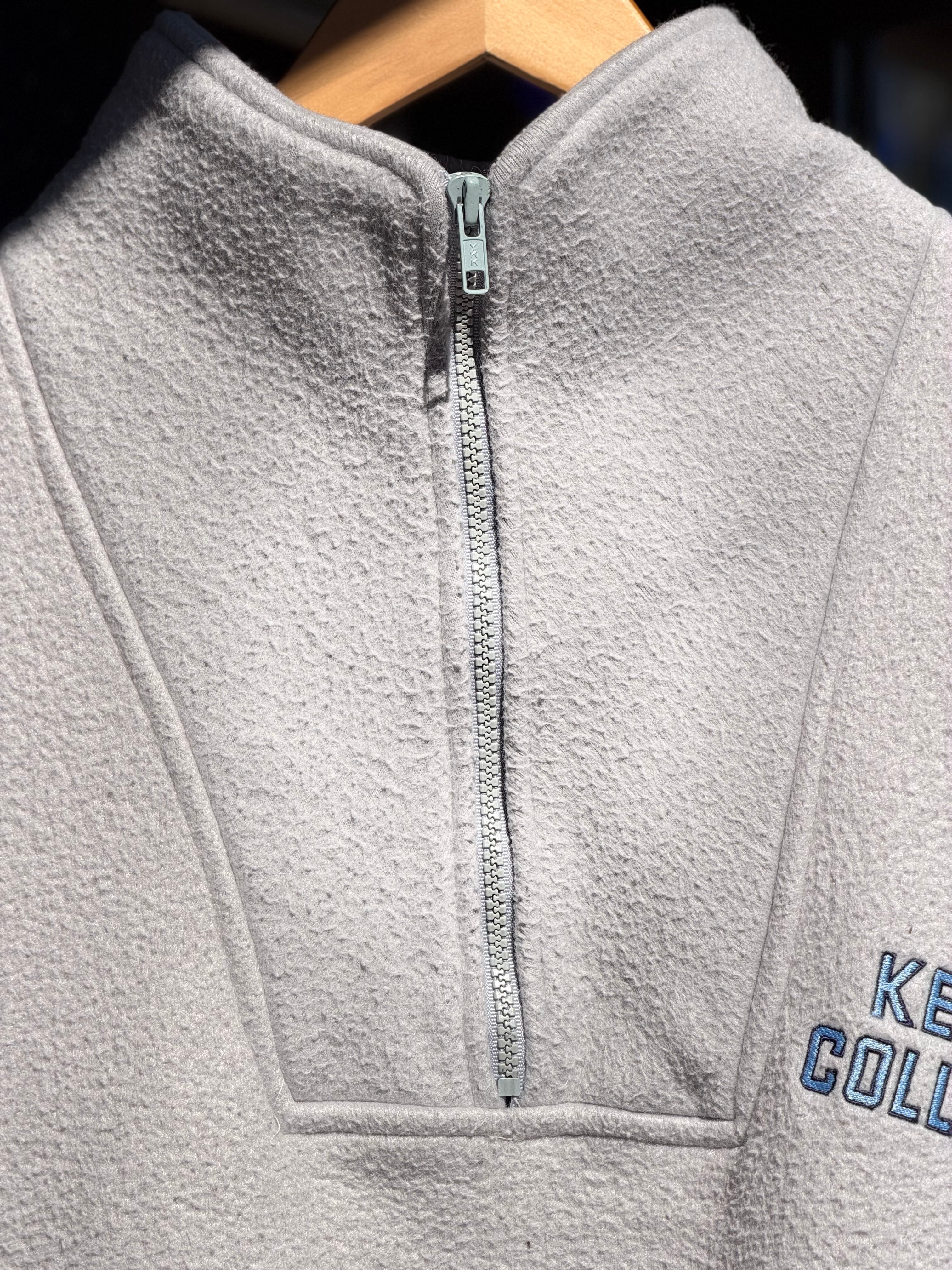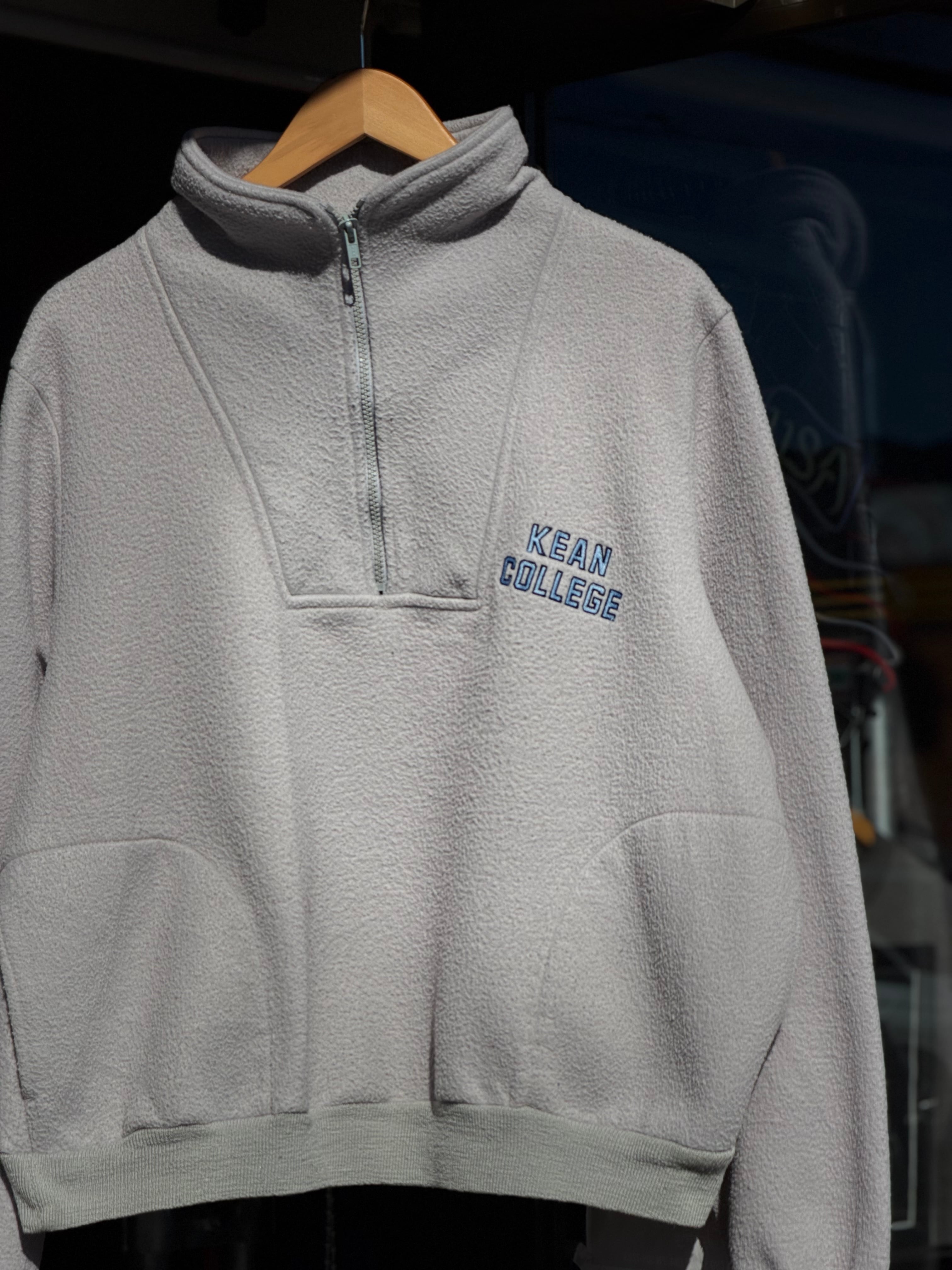 80~90's mvp CORP INC. "KEAN COLLEGE ハーフジップフリースプルオーバー MADE IN U.S.A. XLサイズ カレッジロゴ 刺繍 ワンポイント シンプル フリーススウェット アメリカ製 短丈 ポケット 白 オフホワイト