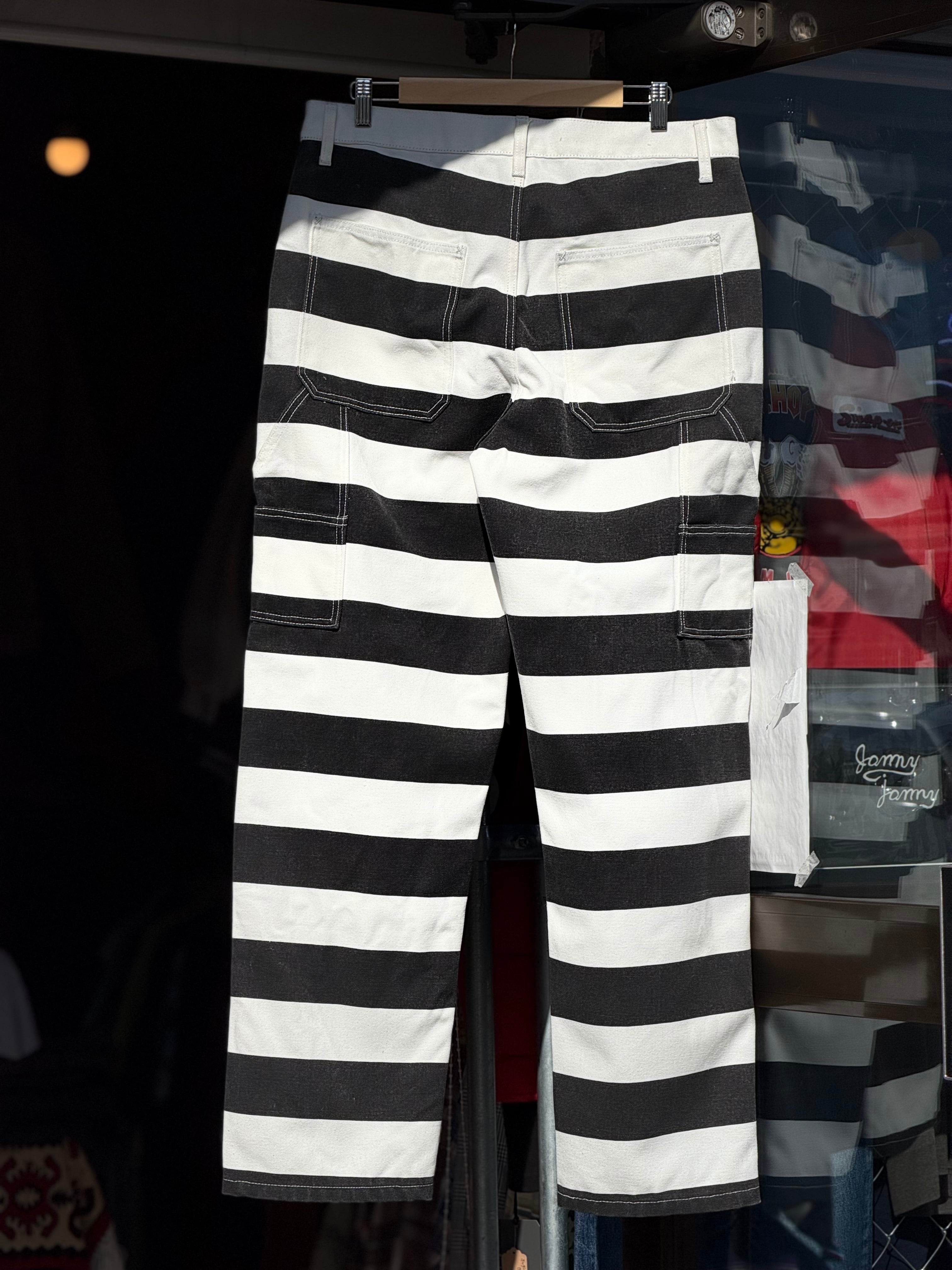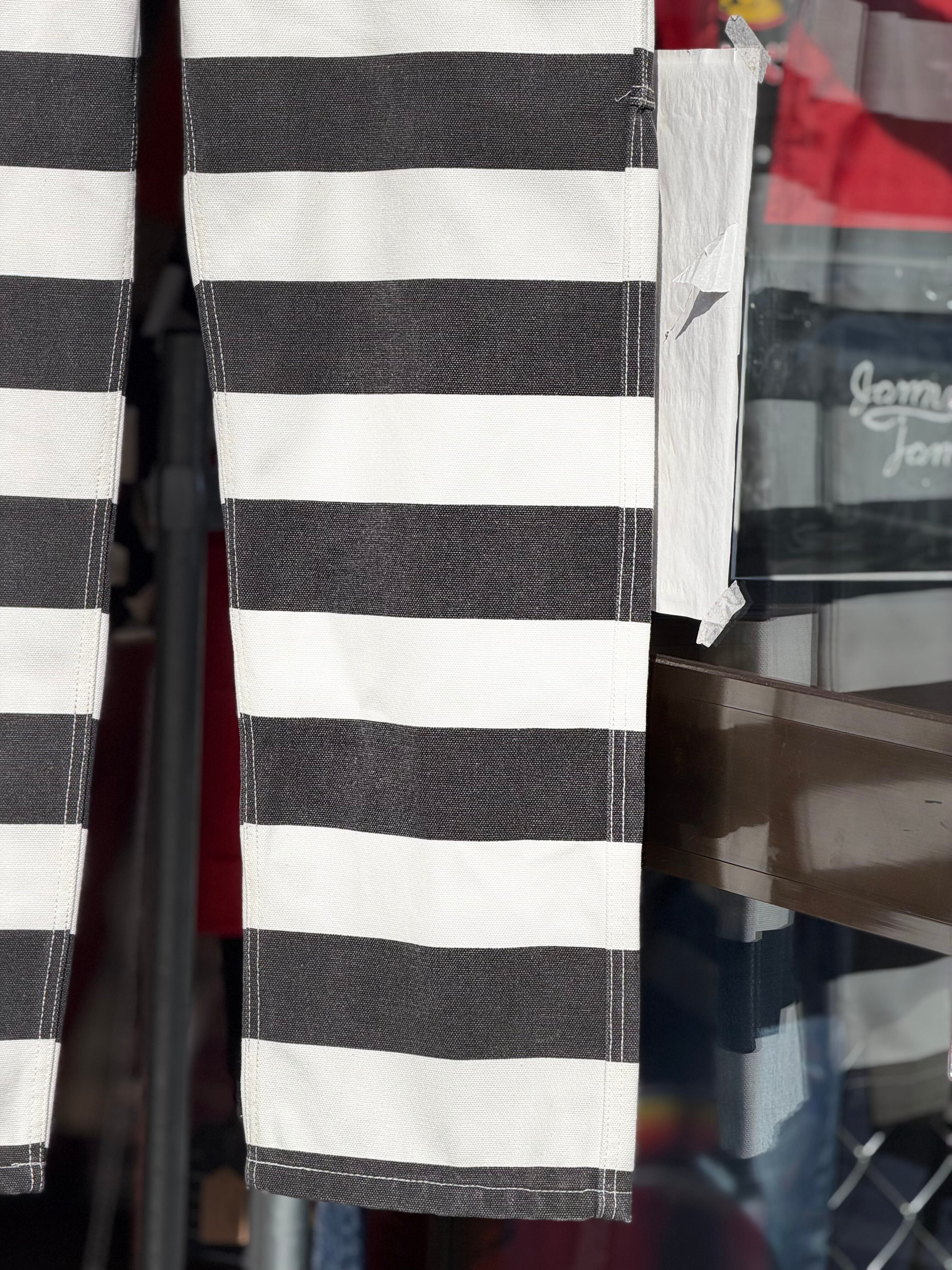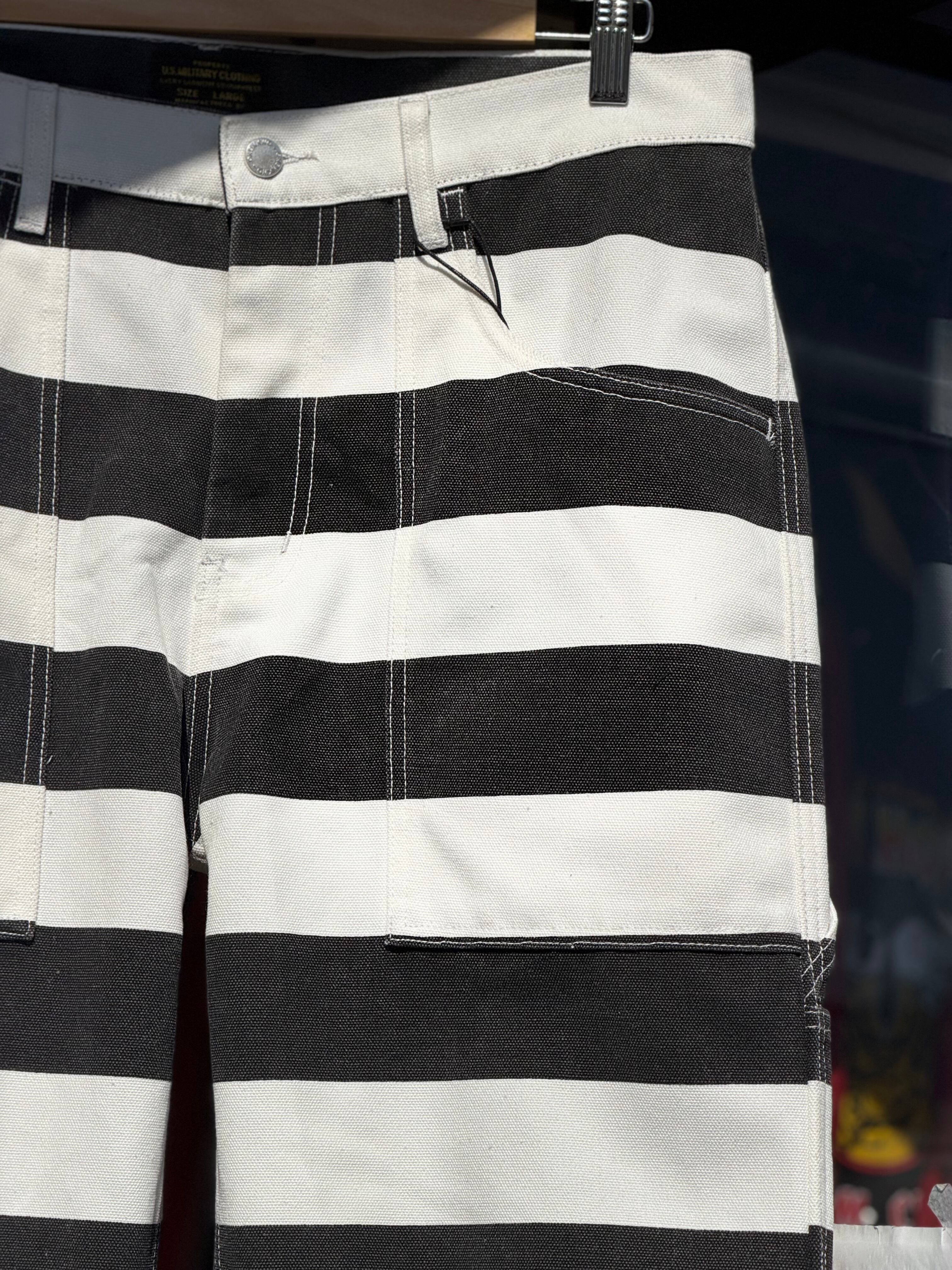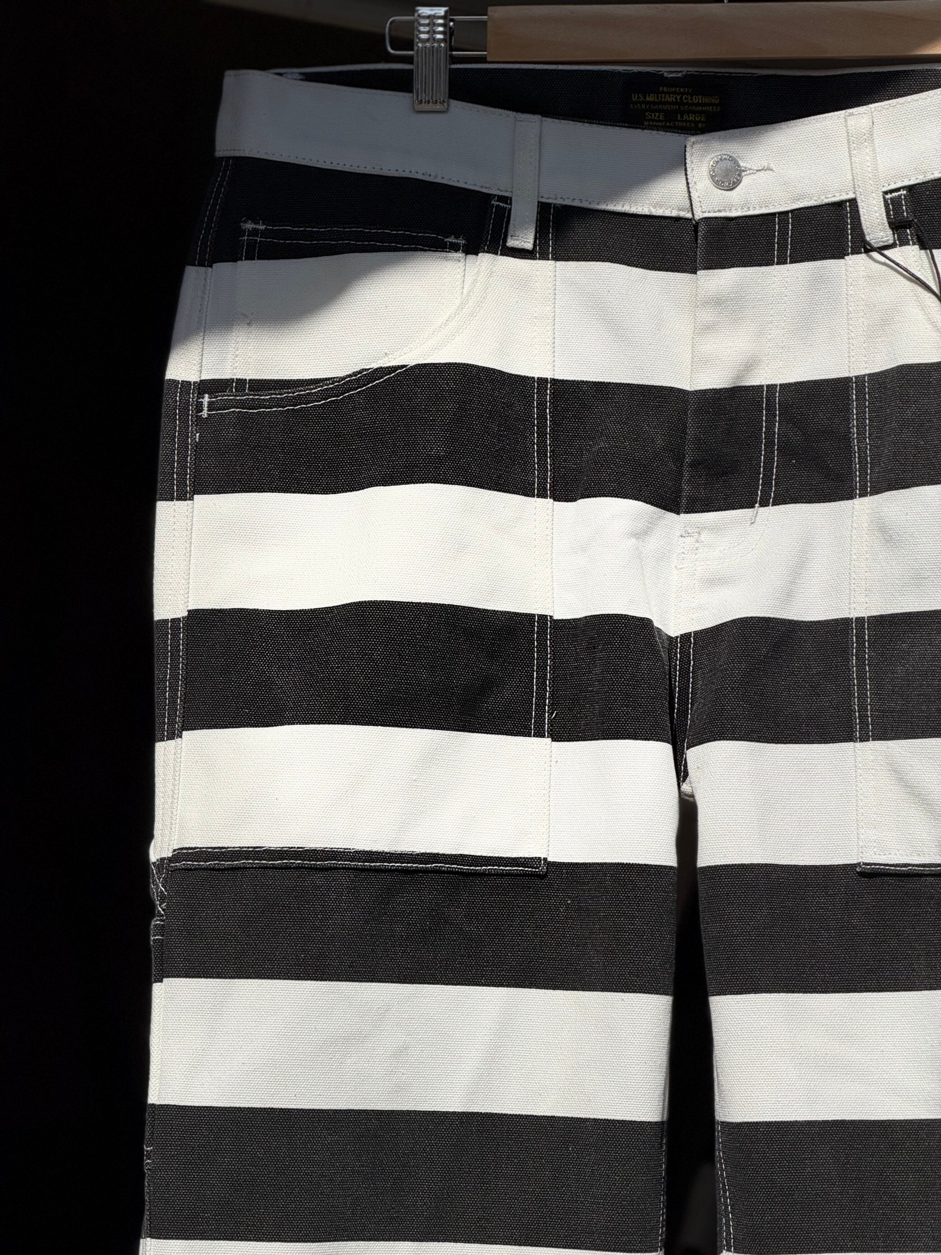 そんなボーダー柄を、ホワイトカラーで16ozというガッシリシッカリなコットン100%キャンバスダック地に、ブラックのボーダー柄をプリントする事で再現したプリズナーパンツになります。