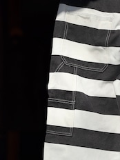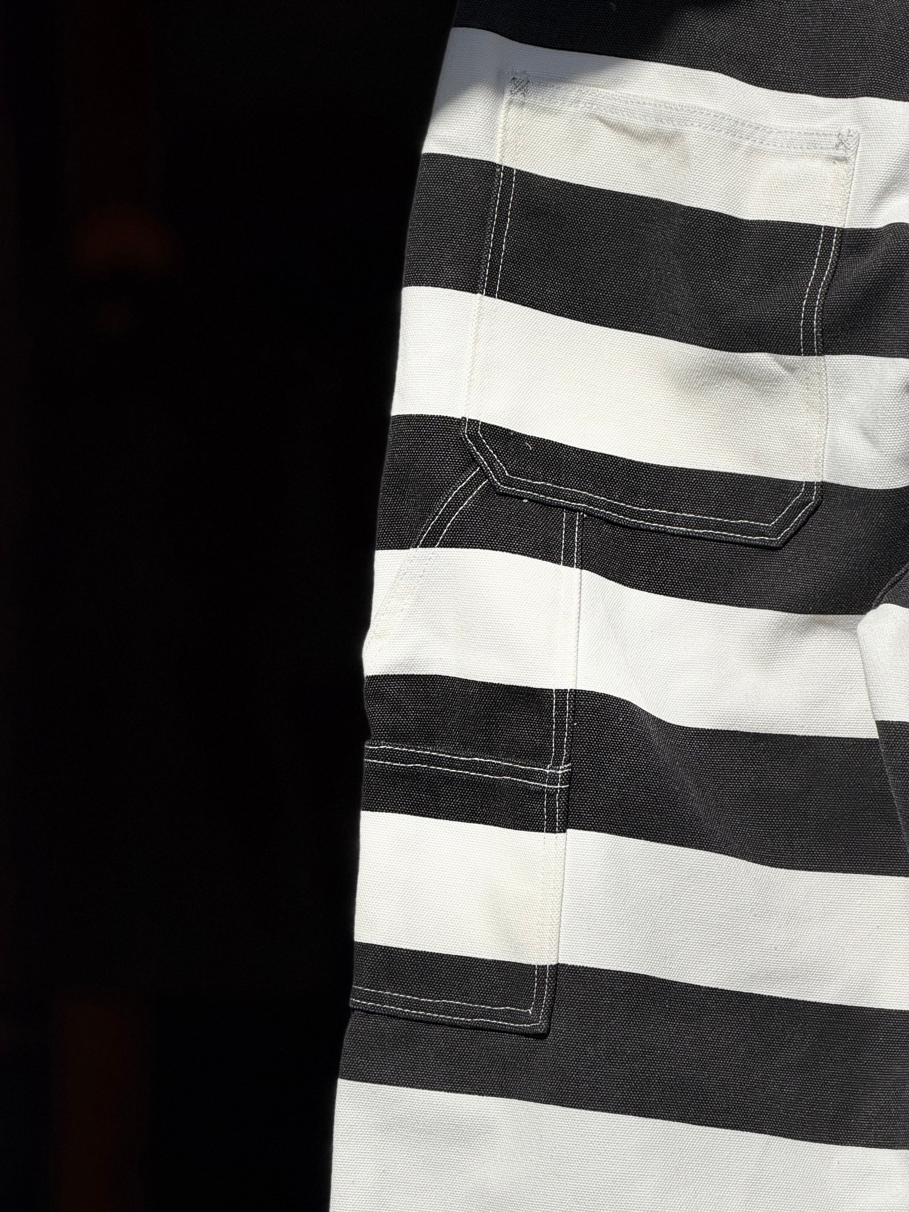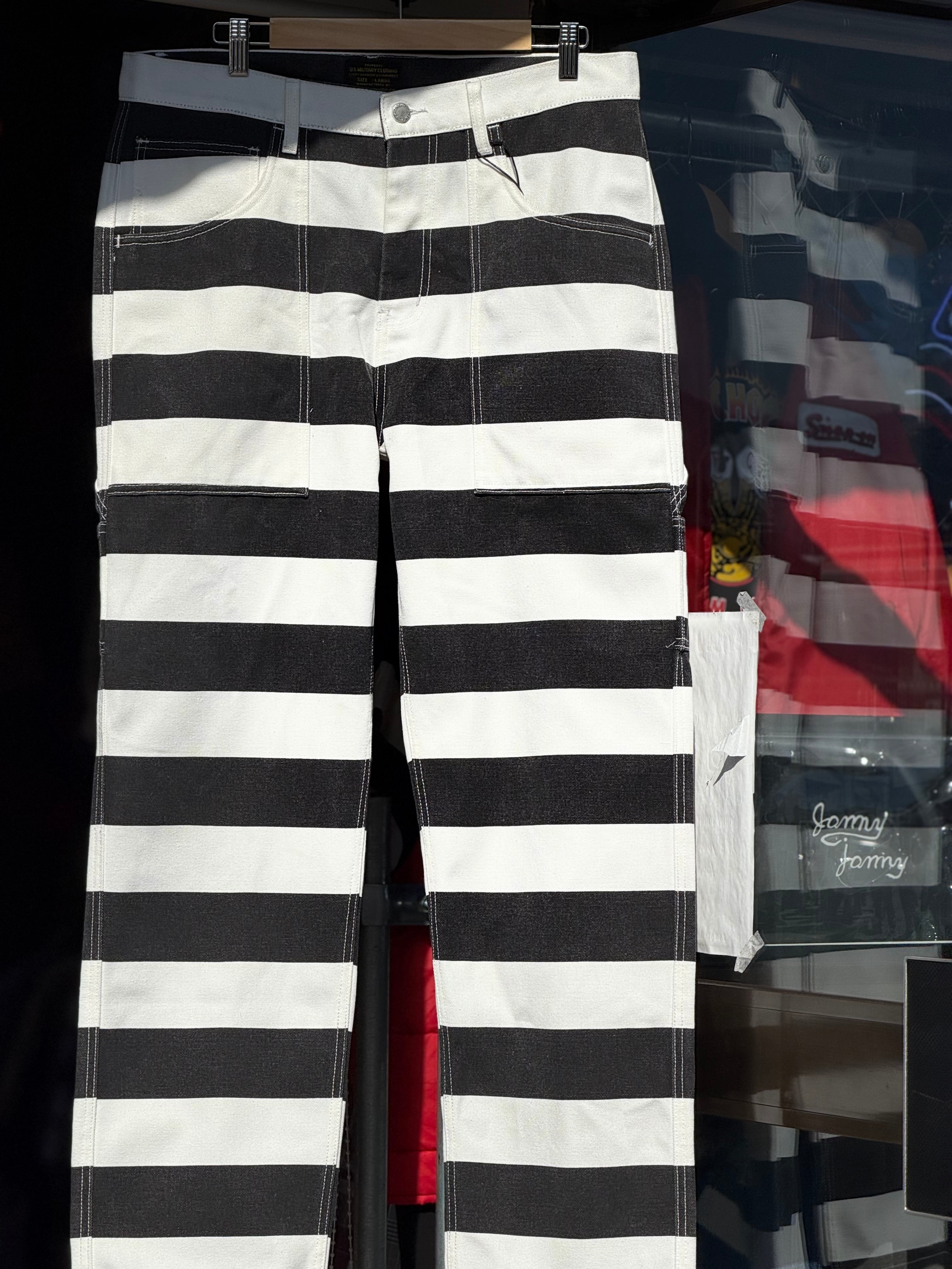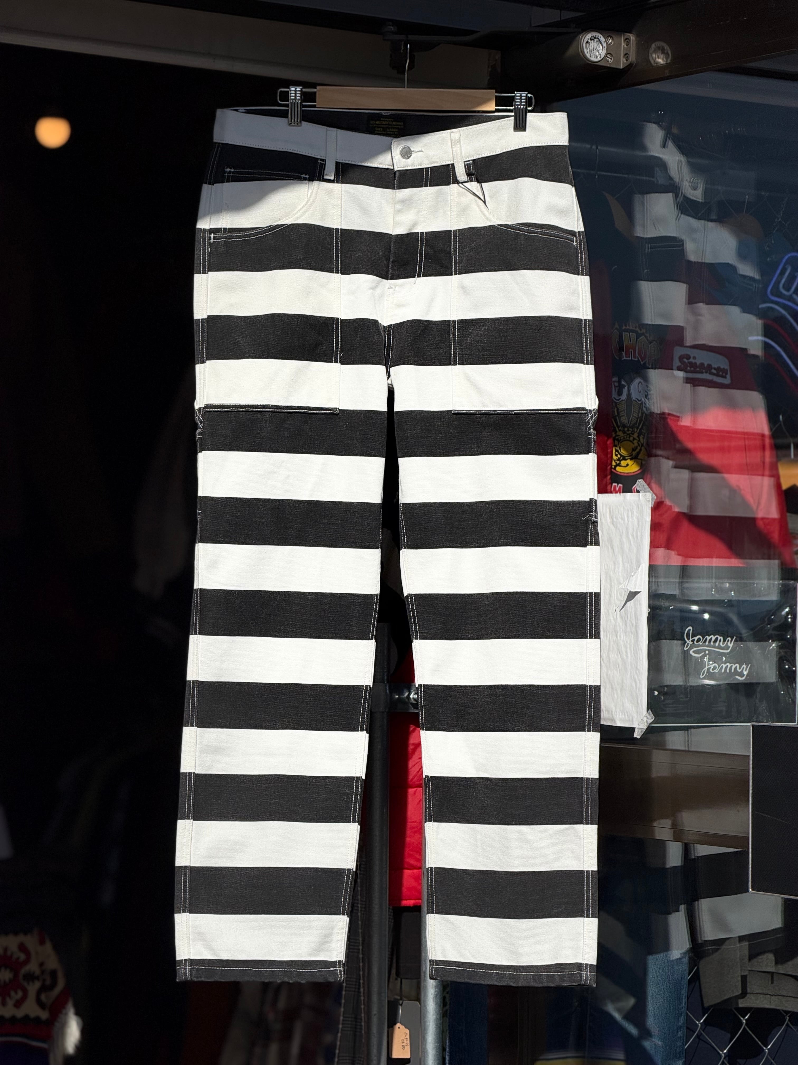 そんなボーダー柄を、ホワイトカラーで16ozというガッシリシッカリなコットン100%キャンバスダック地に、ブラックのボーダー柄をプリントする事で再現したプリズナーパンツになります。