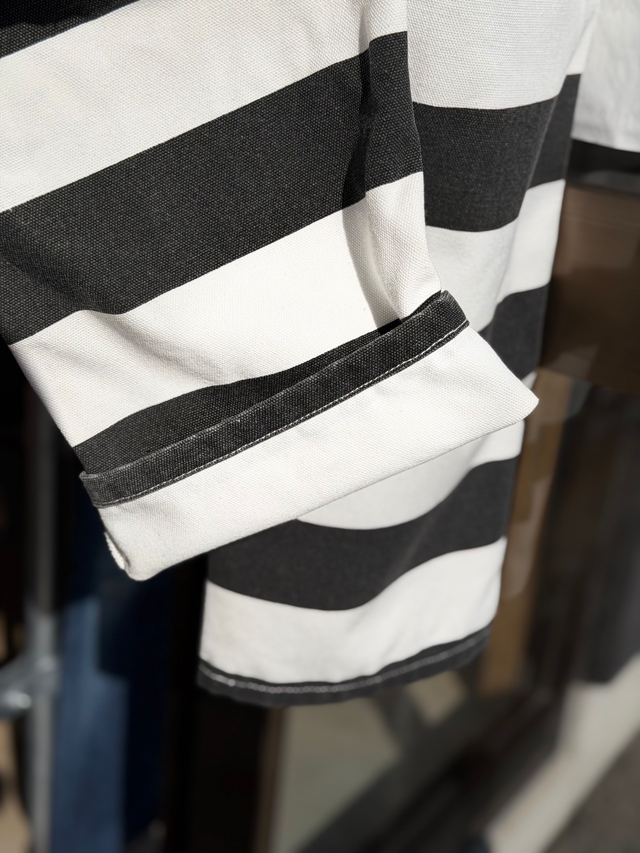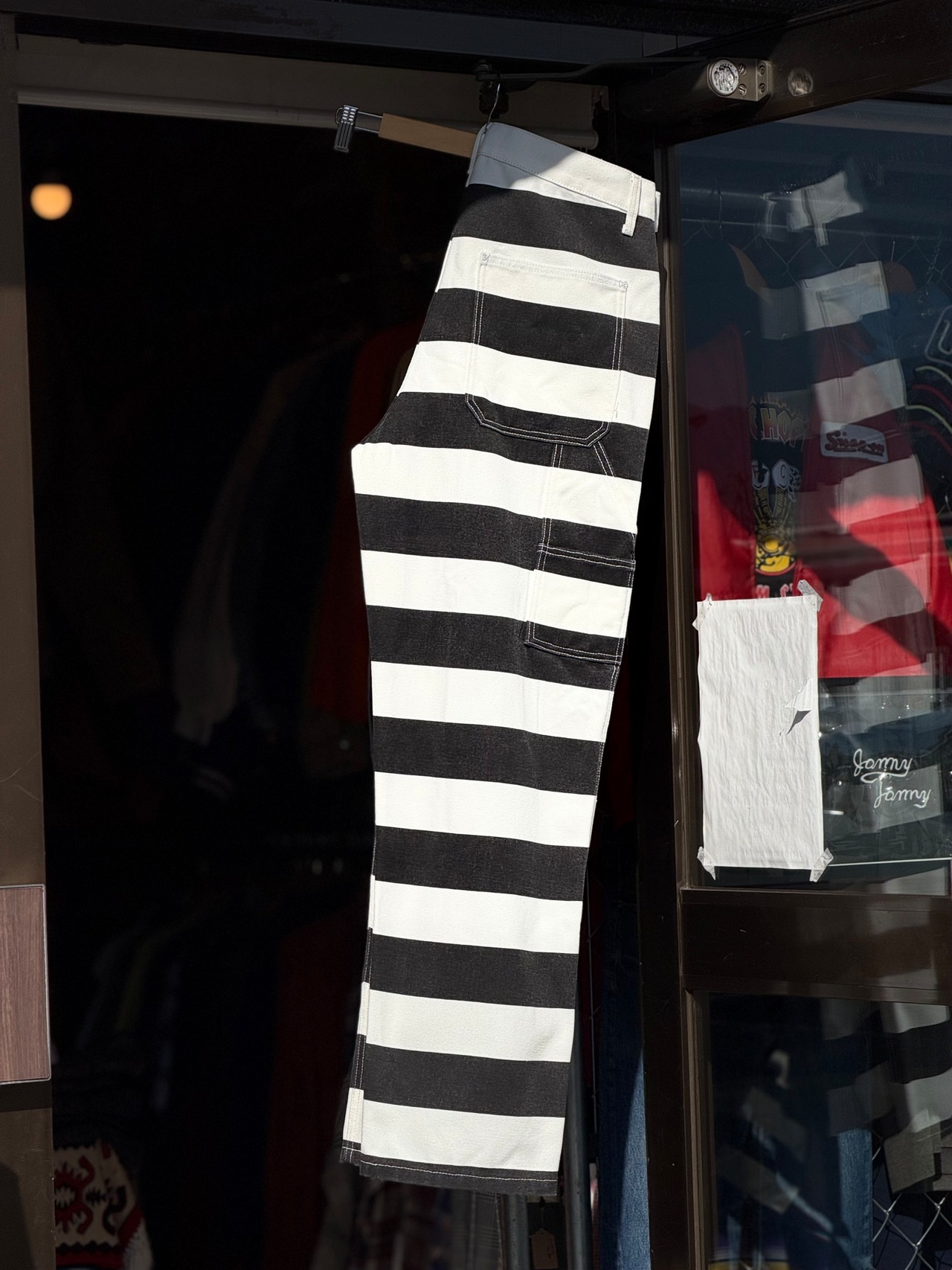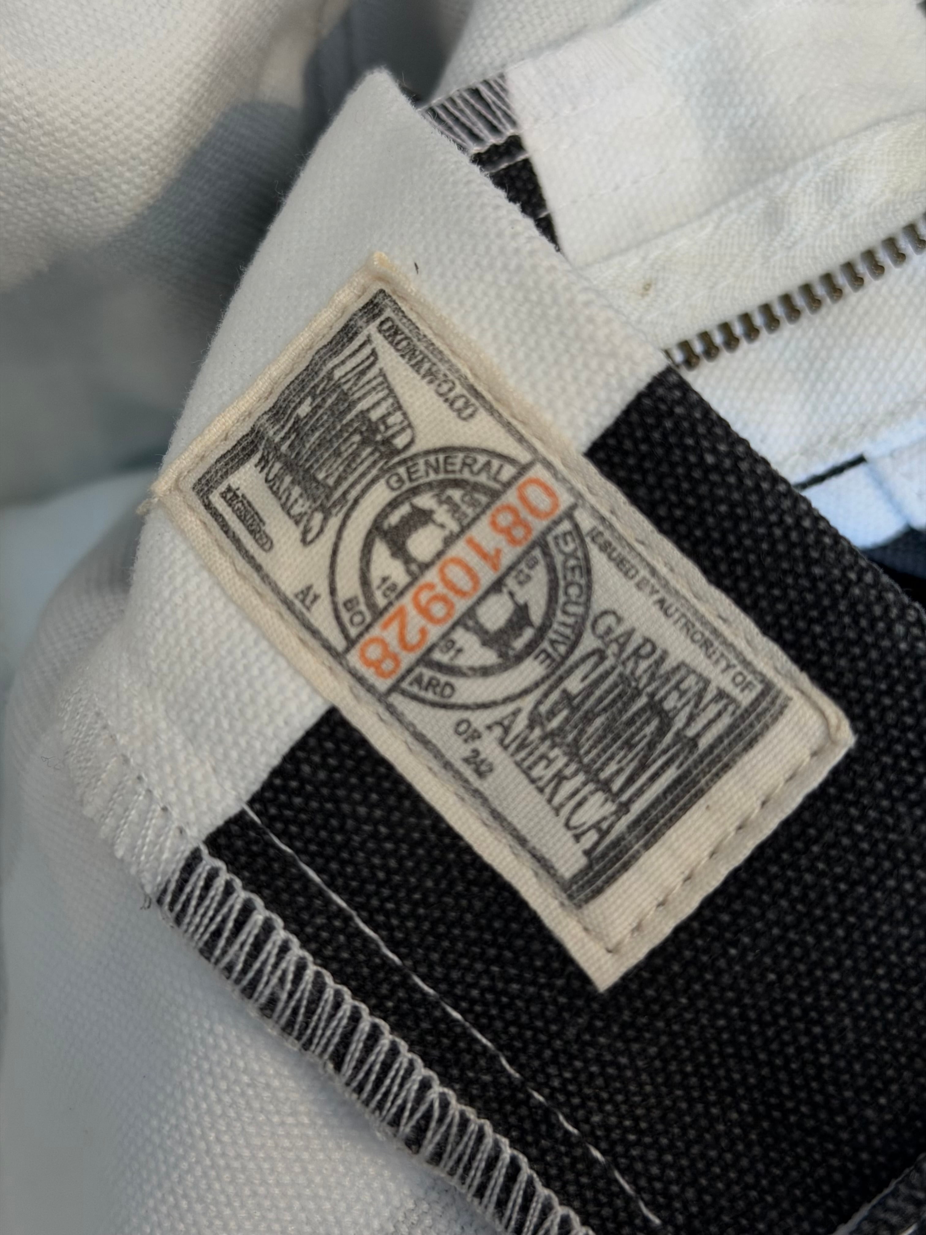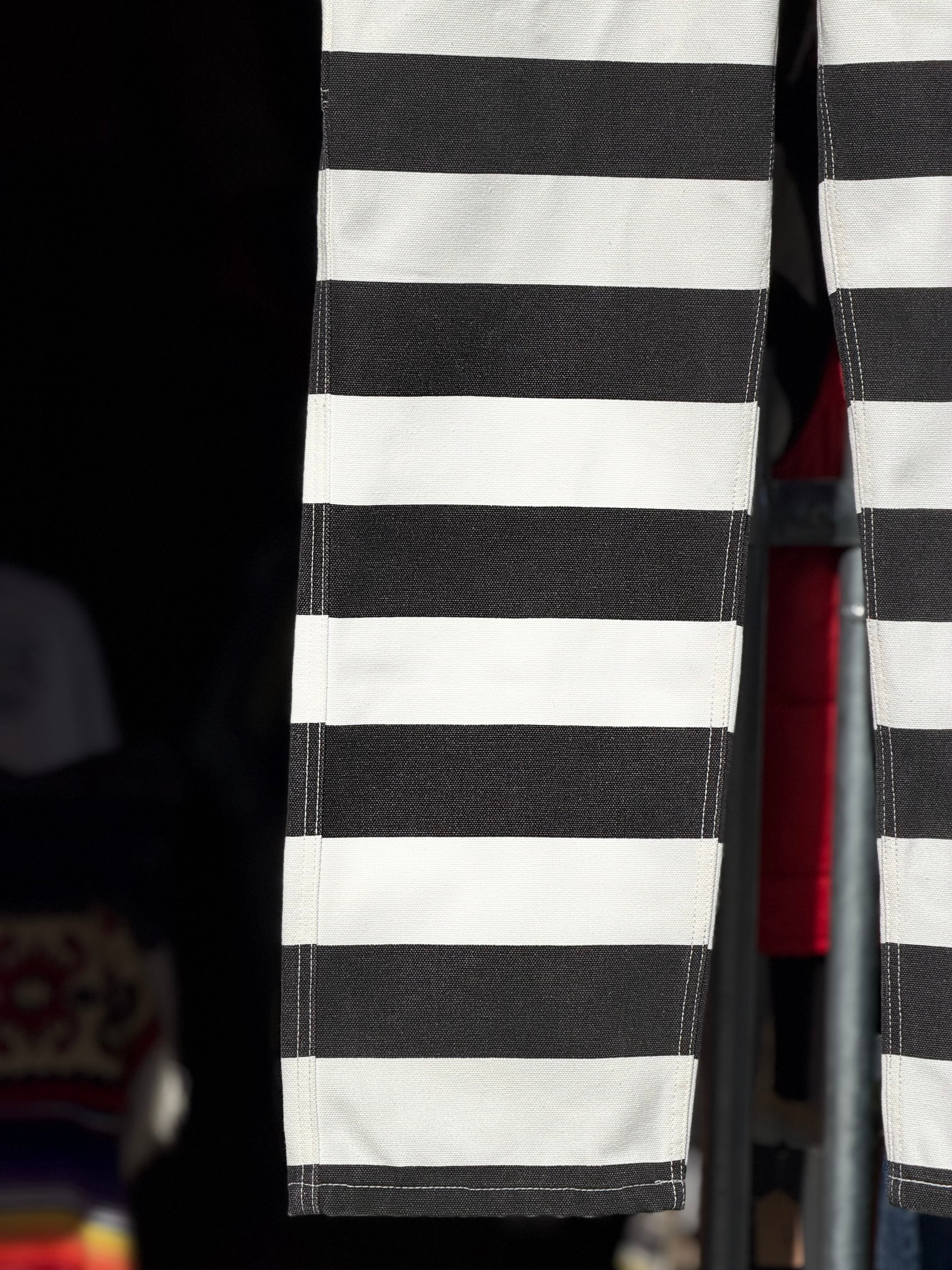 そんなボーダー柄を、ホワイトカラーで16ozというガッシリシッカリなコットン100%キャンバスダック地に、ブラックのボーダー柄をプリントする事で再現したプリズナーパンツになります。