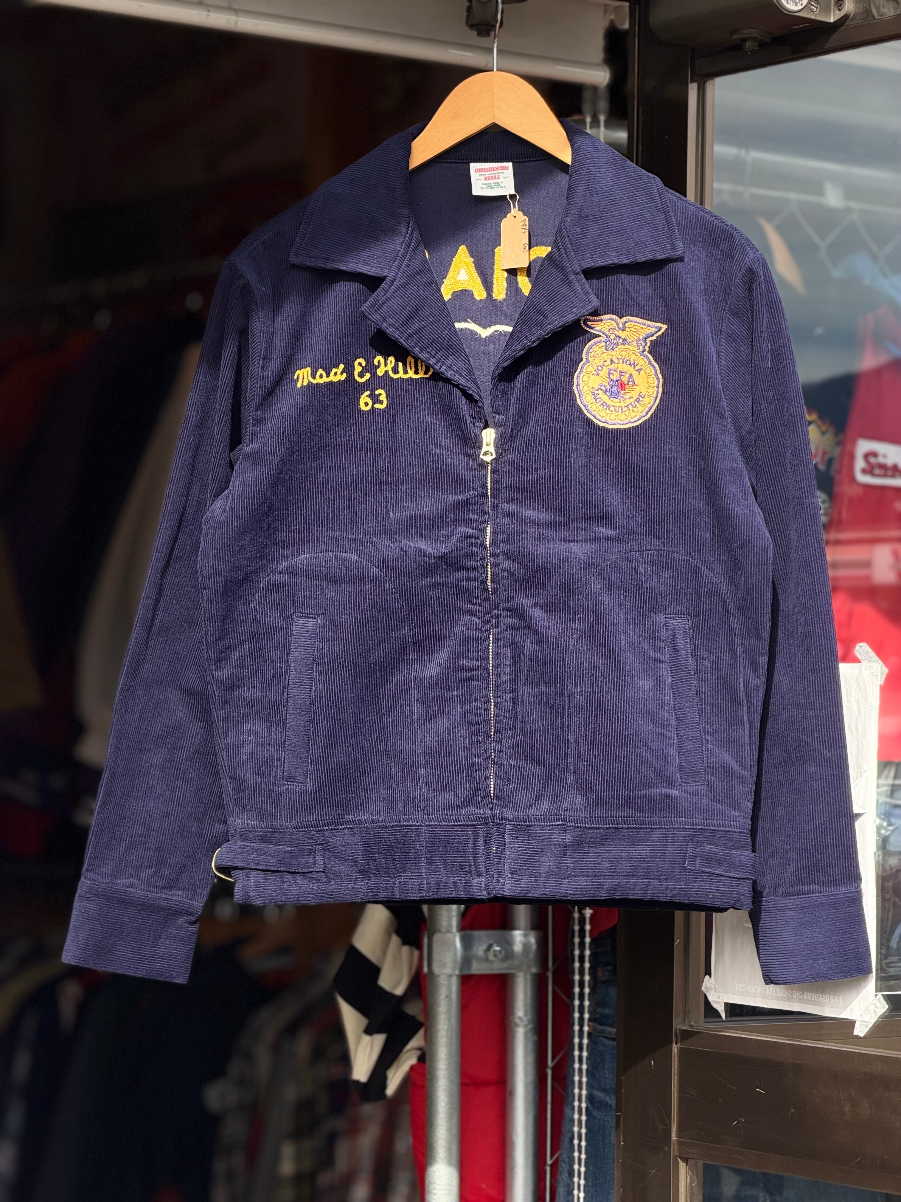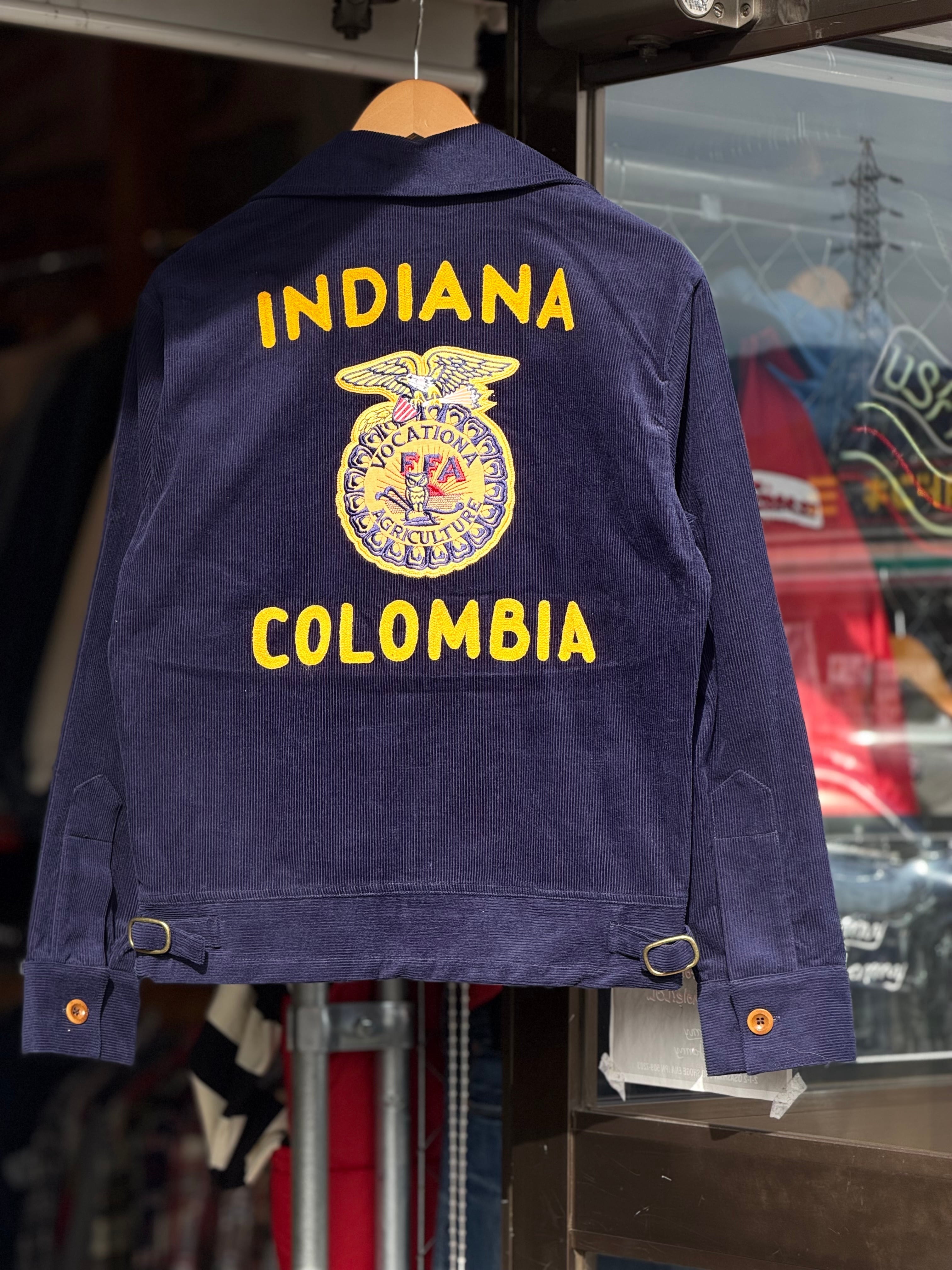 FFA jacket "INDIANA COLOMBIA" コーデュロイジャケット M L GDDQSDC&CO ネイビー FFAジャケット 制服 復刻 新品 アメカジ 短丈 ヴィンテージ ビンテージ vintage TALONジップ オープンカラー ユニフォーム 刺繍 チェーンステッチ 農業高校