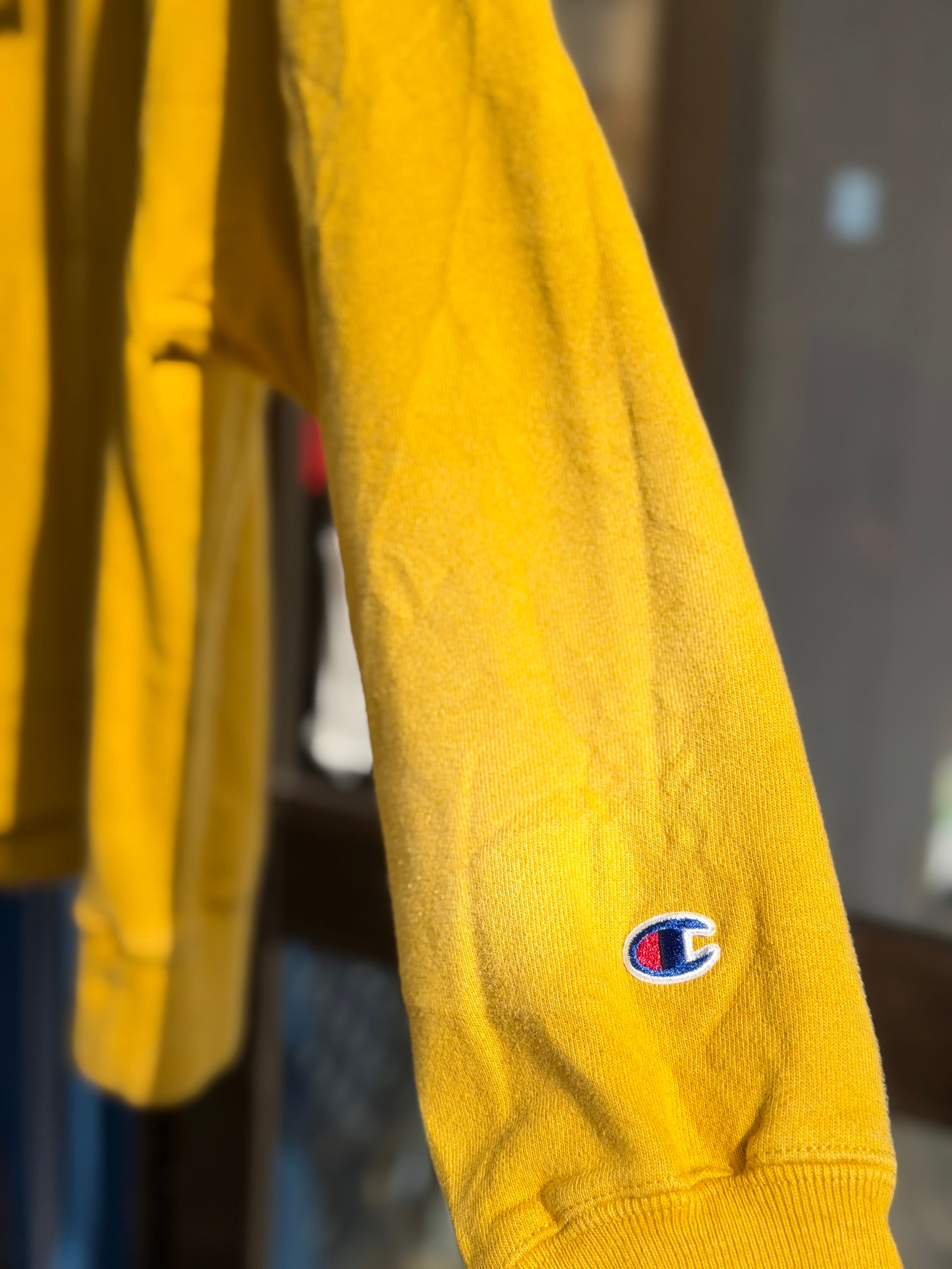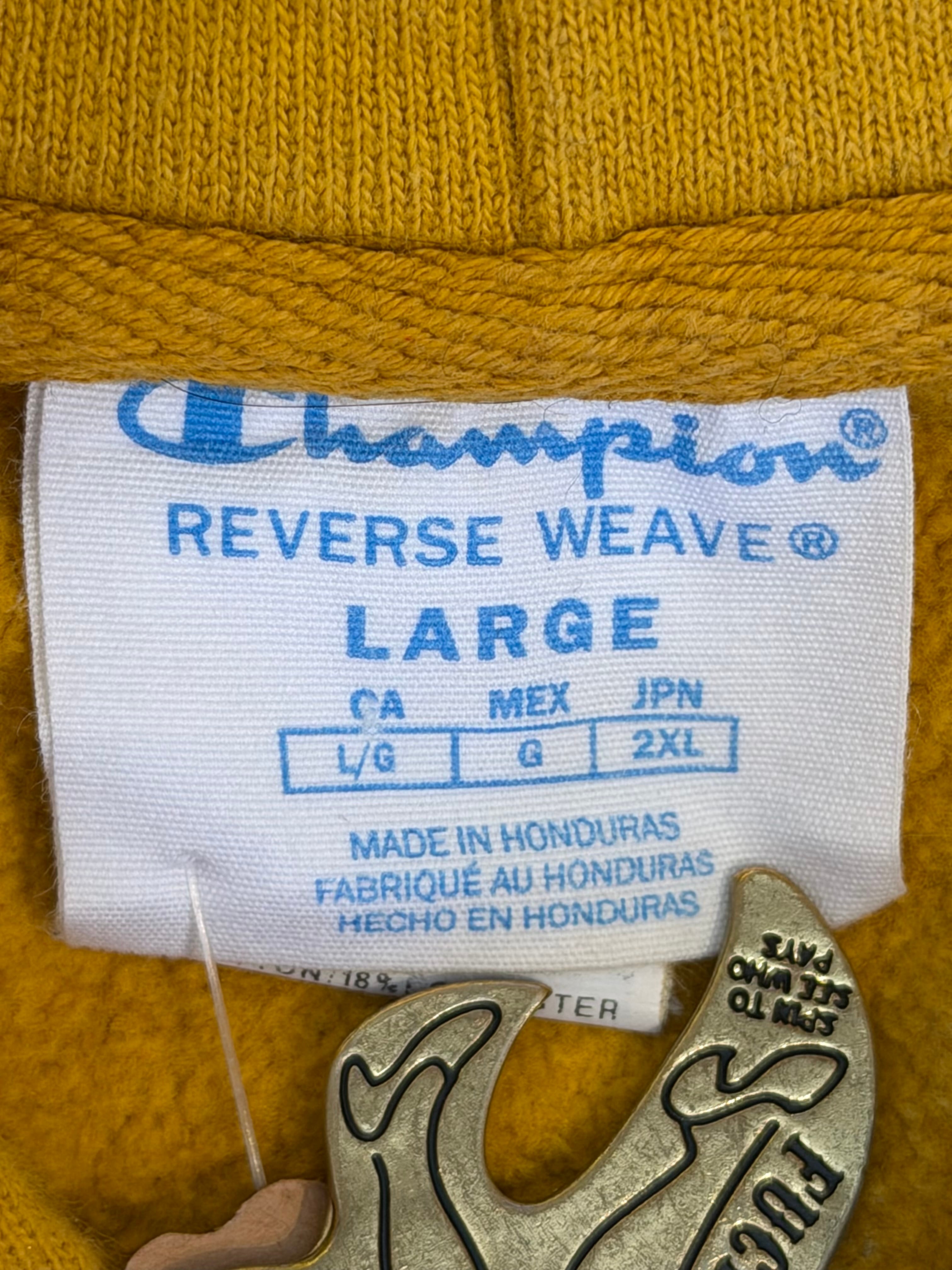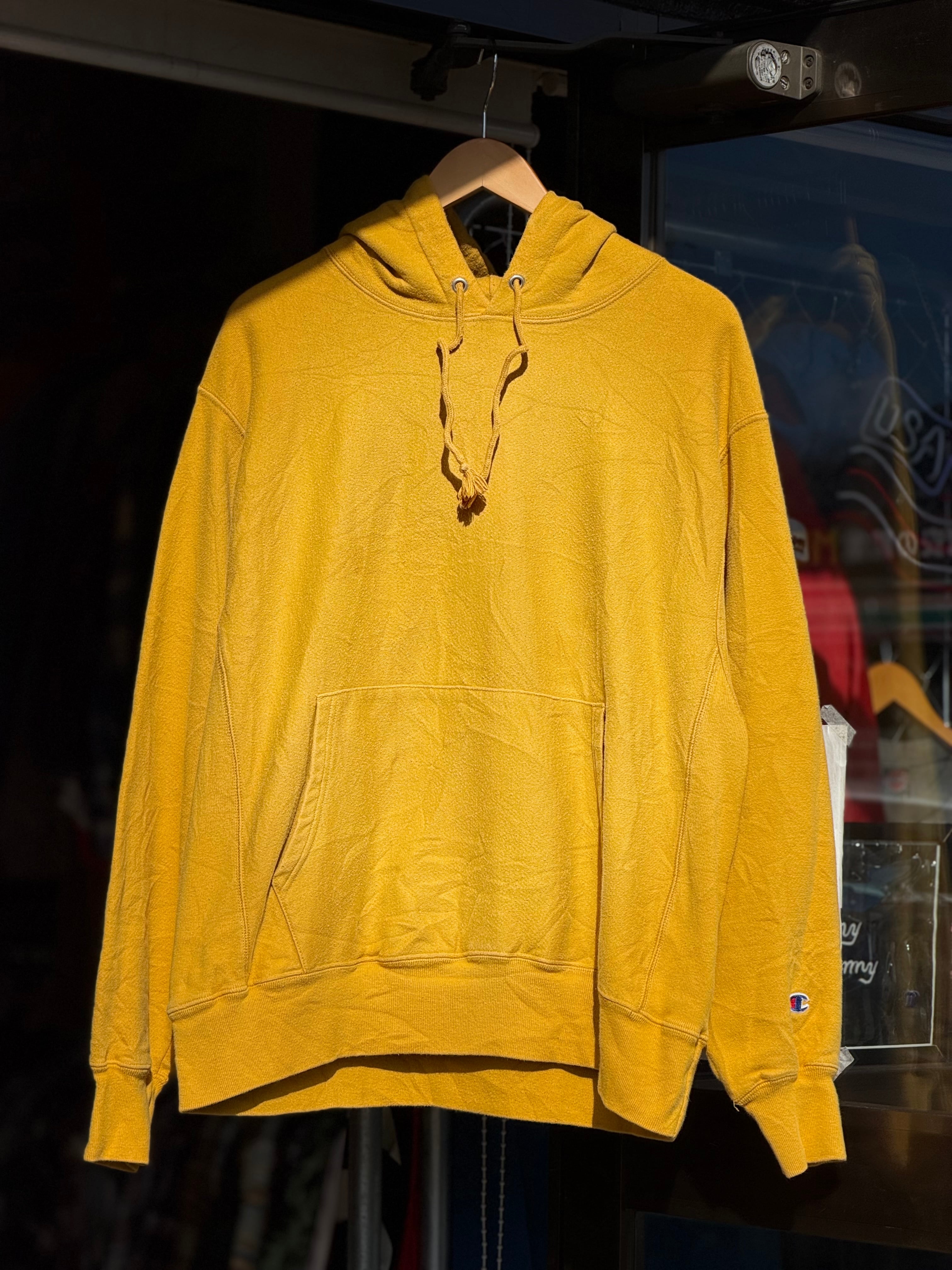 Champion REVERSE WEAVE リバースウィーブプルオーバーパーカー Lサイズ JPN 2XL マスタード イエロー 黄色 辛子色 カラシ色 褪色 フェード RW チャンピオン 無地 目無し 青タグ アメカジ スウェット フーディー 古着 シンプル XXL