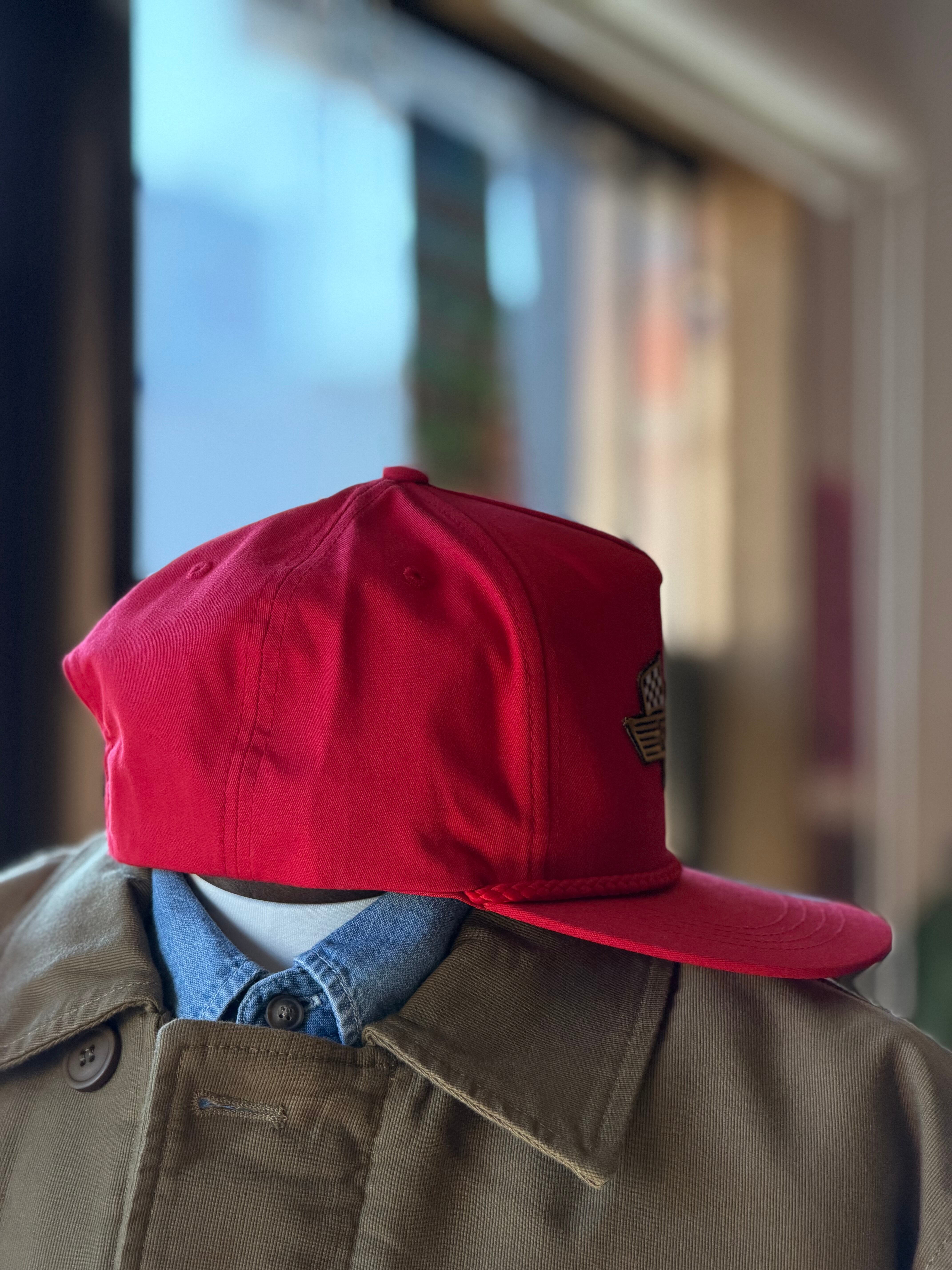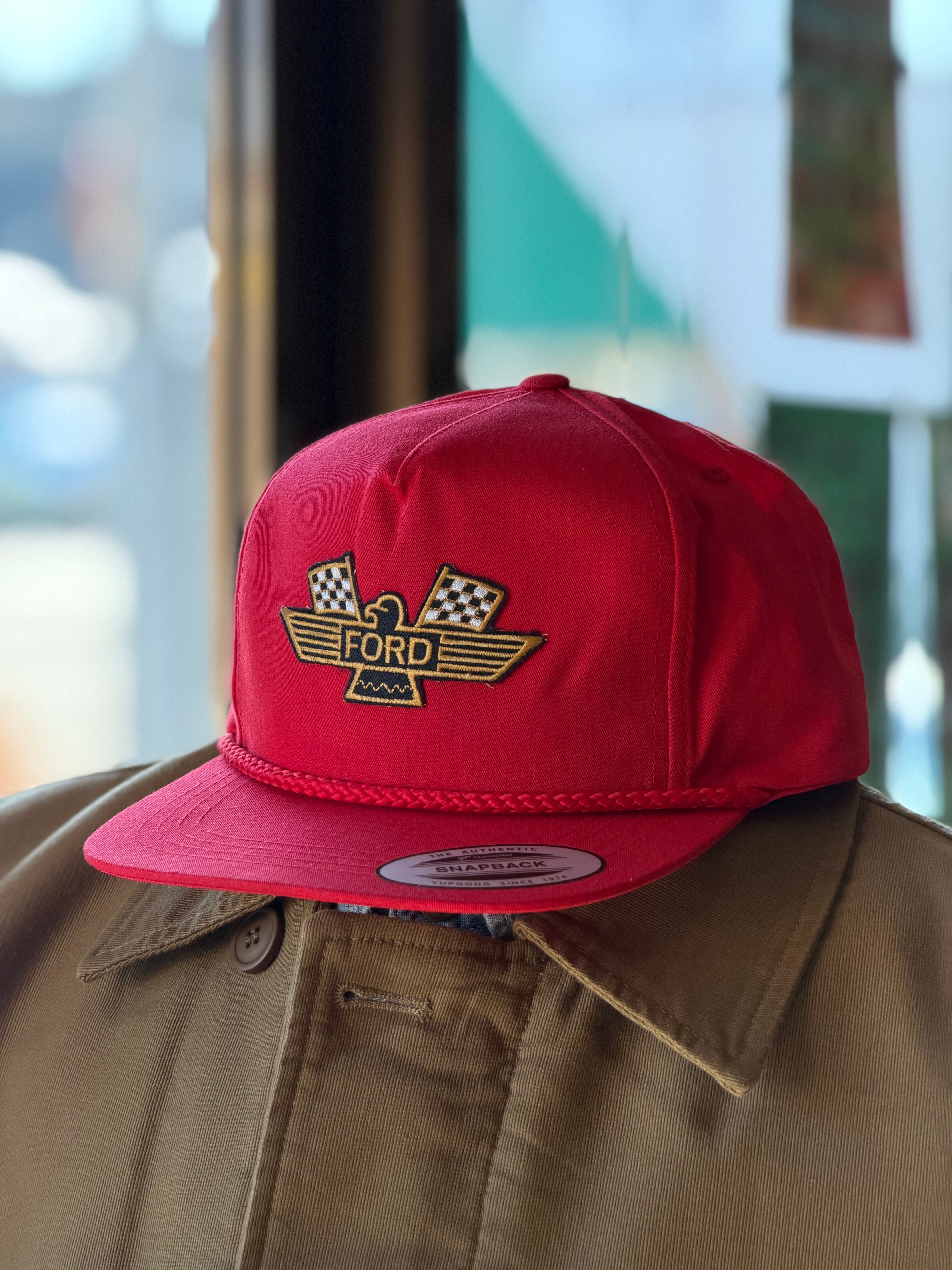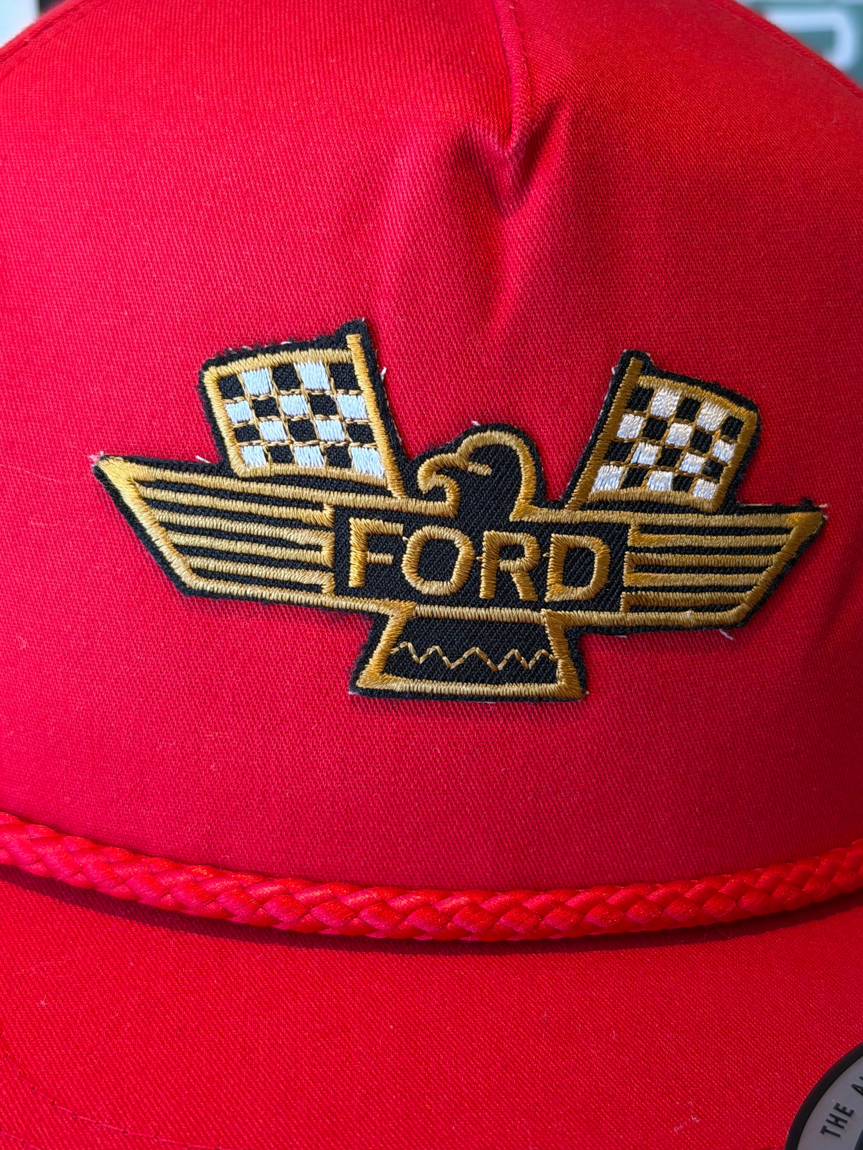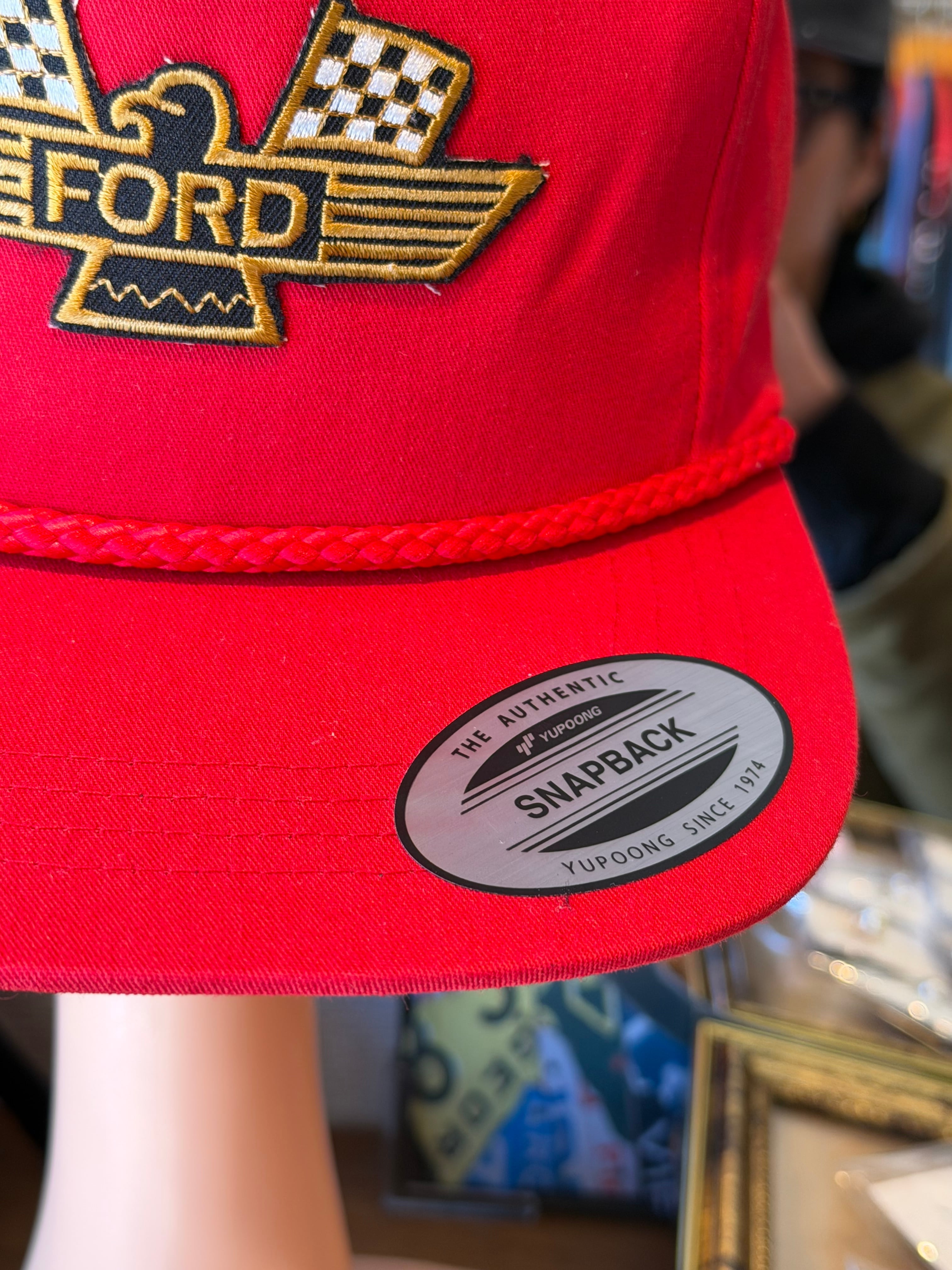5パネルロープトラッカーキャップ Vintage patches custom "FORD" レッド スナップバック ロープ付き アメカジ 帽子 ロープキャップ ワッペンカスタム ビンテージワッペン ヴィンテージワッペン 新品 フォード サンダーバード チェック チェッカーフラッグ アメ車 70's 70s 60's 60s Ford Galaxie Thunder Bird