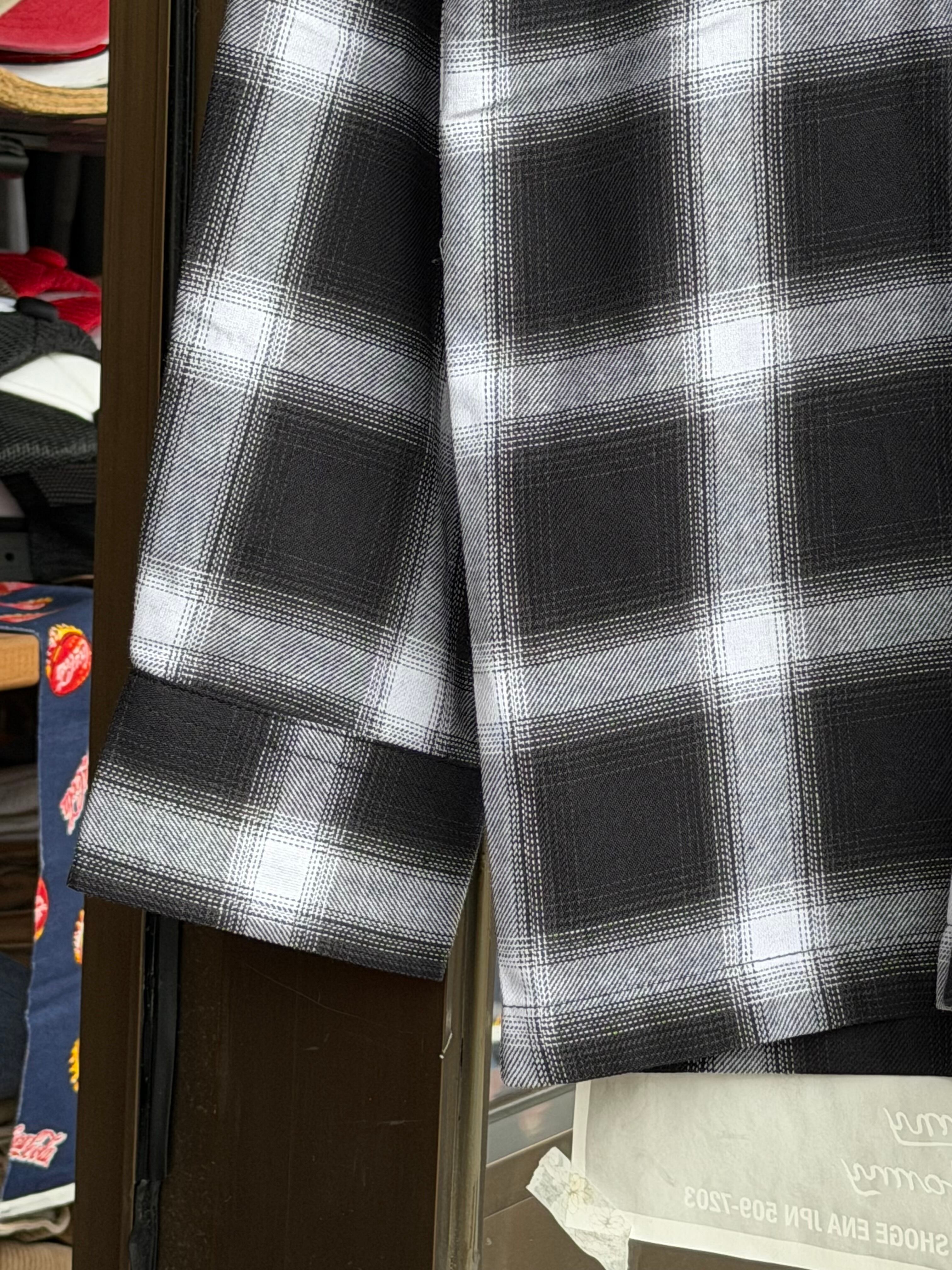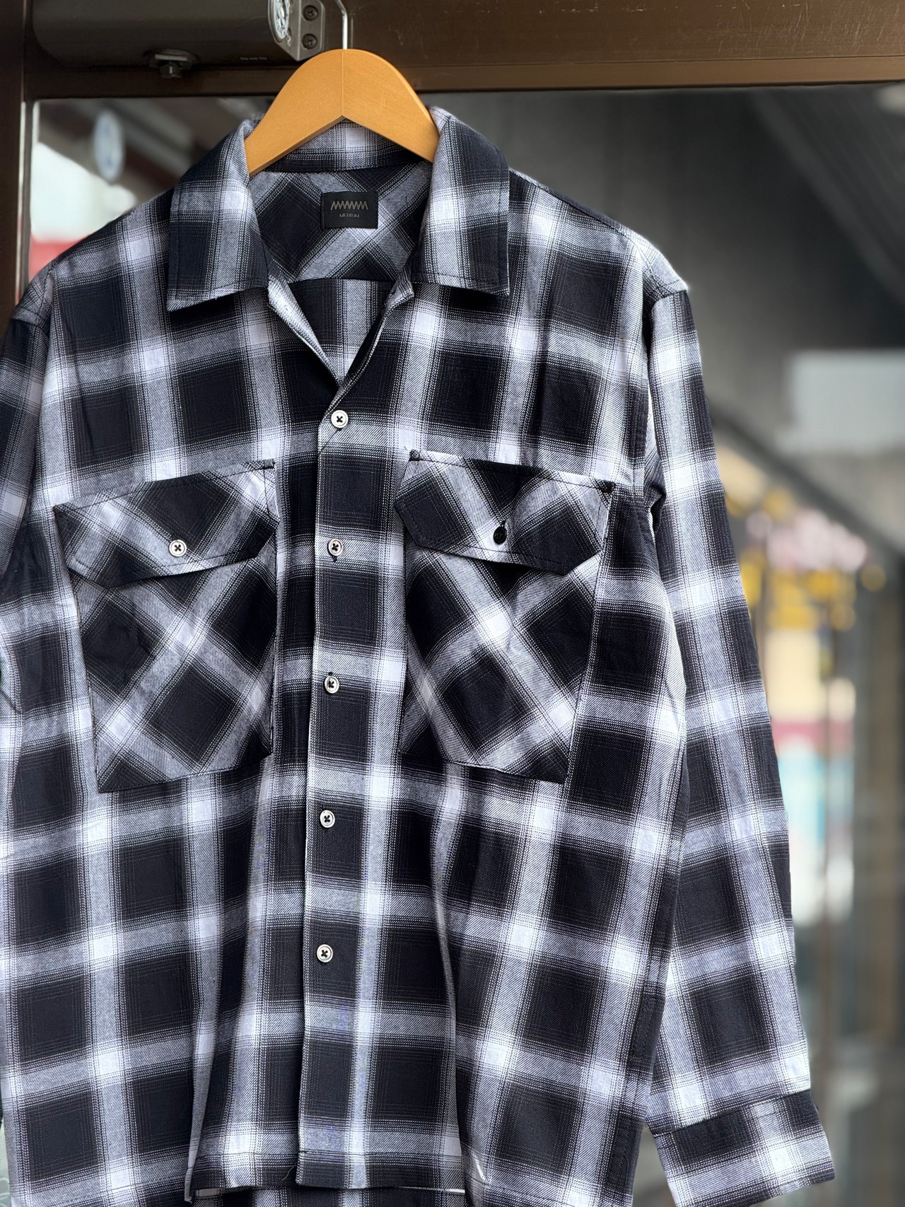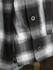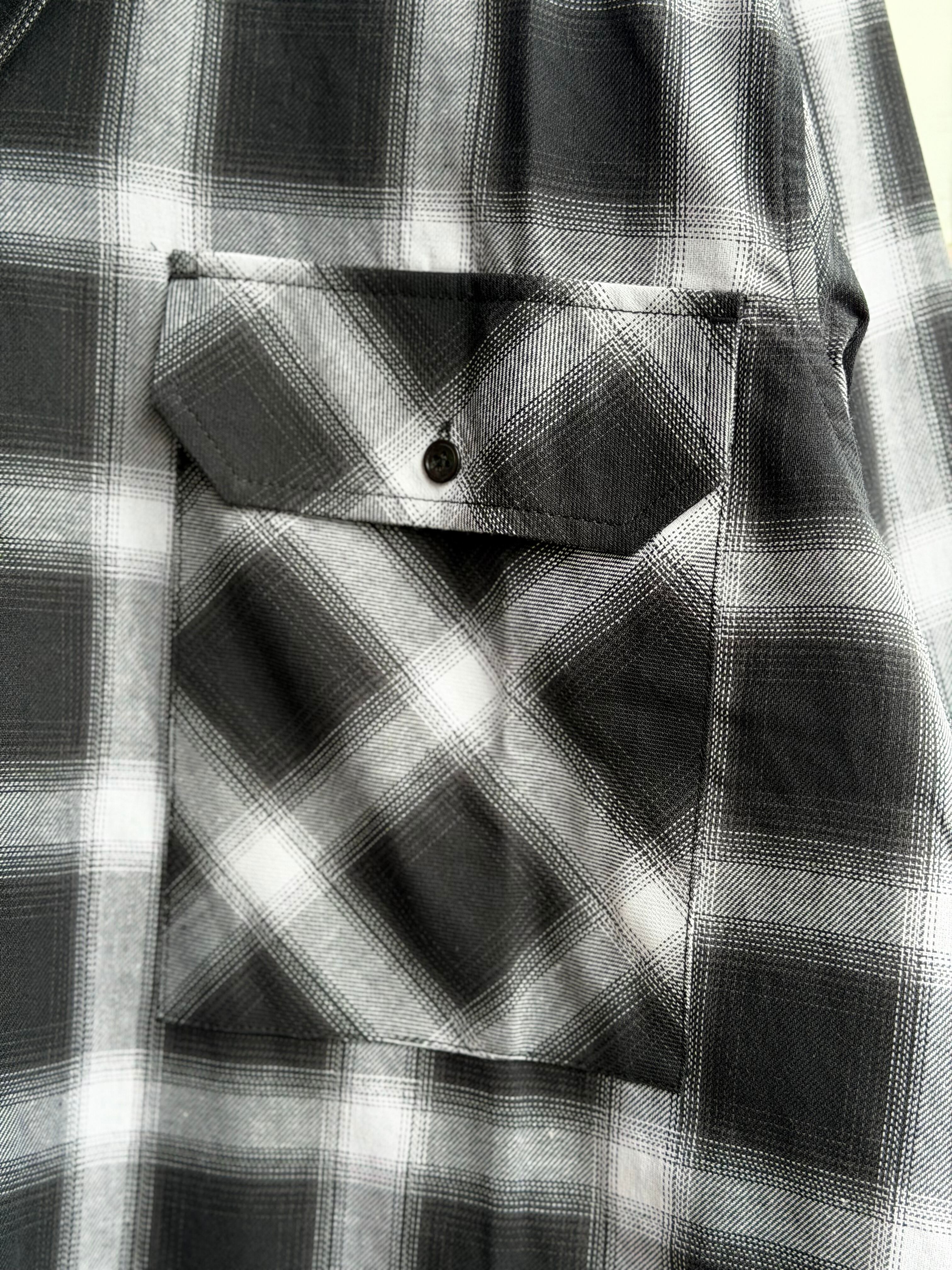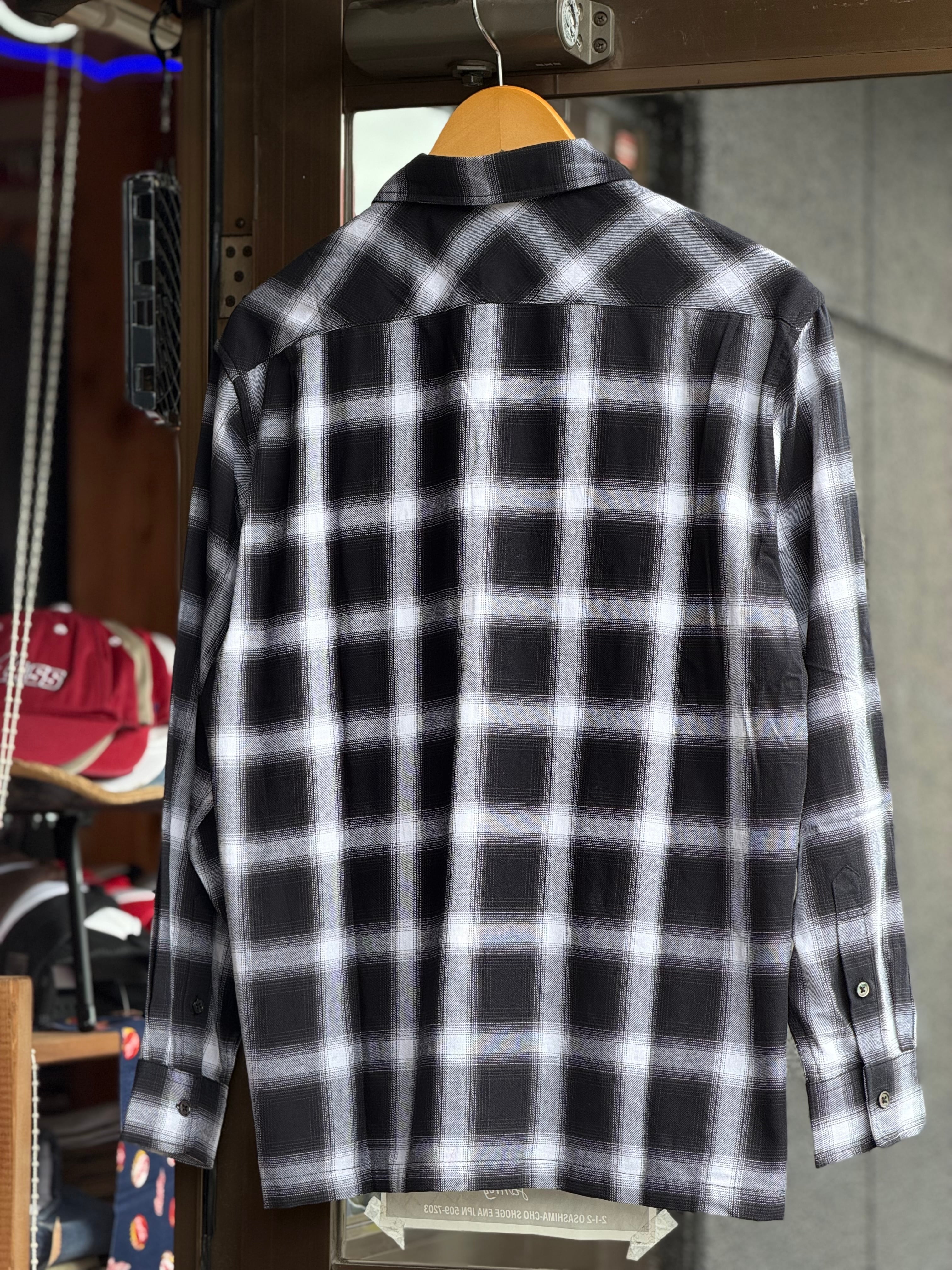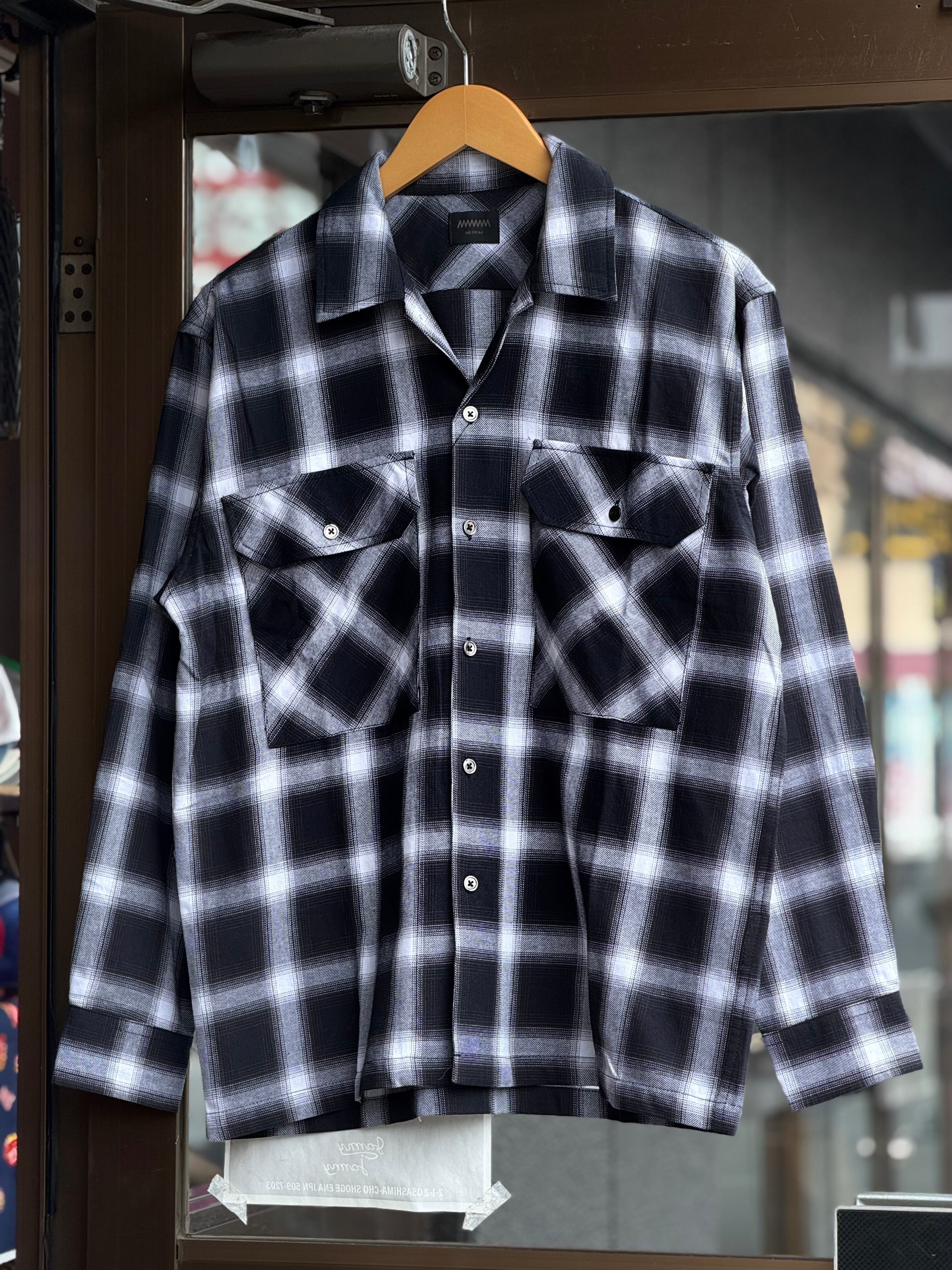 オンブレチェックオープンカラーライトフランネルシャツ M L ブラック ホワイト シャドウチェック 開襟シャツ オープンカラーシャツ ジャストサイズ 新品 ボックスシルエット アメカジ ビンテージ ヴィンテージ チェックシャツ オンブレシャツ バイカー アウトロー 不良 ルード コットン100% ombre check