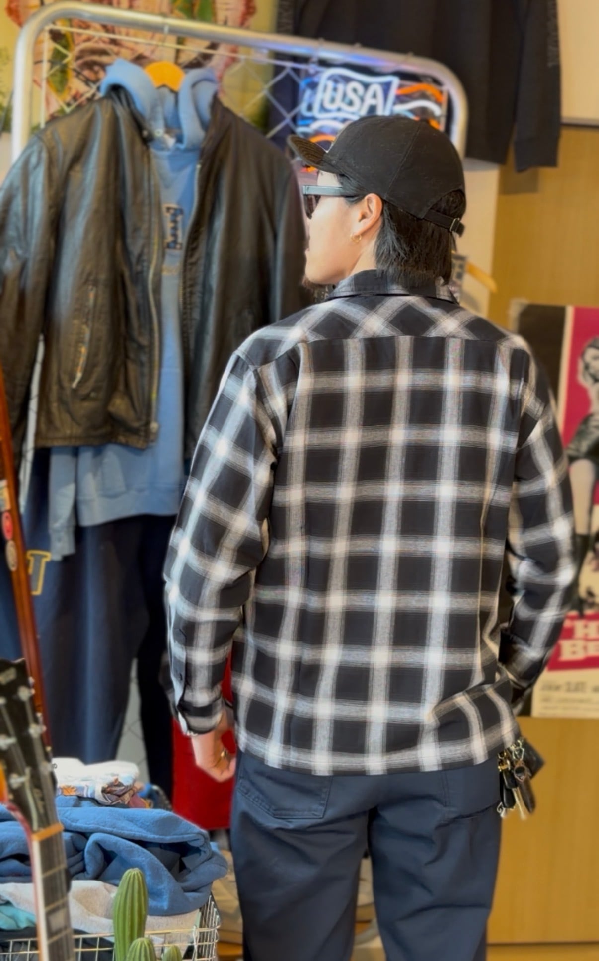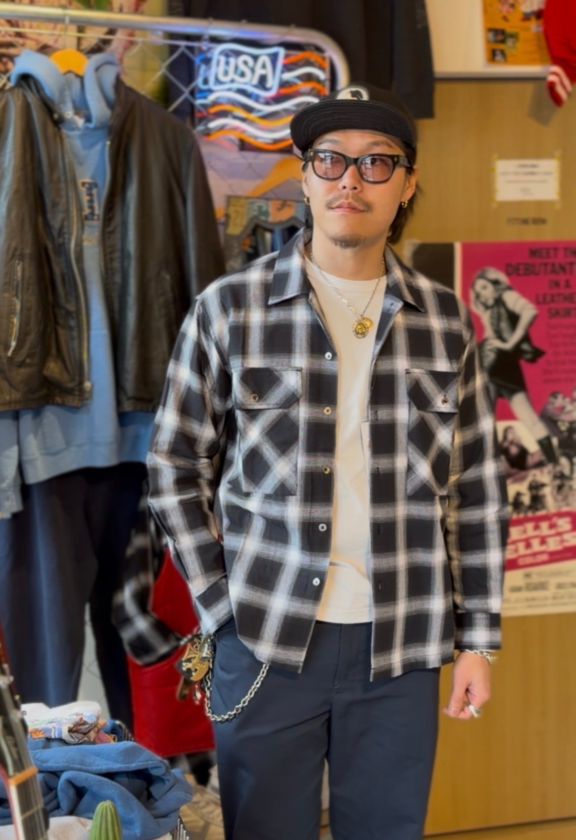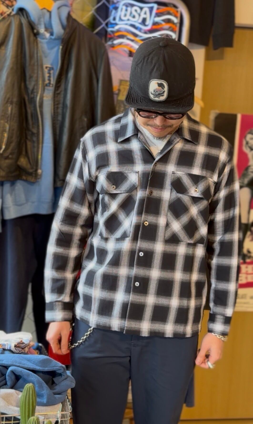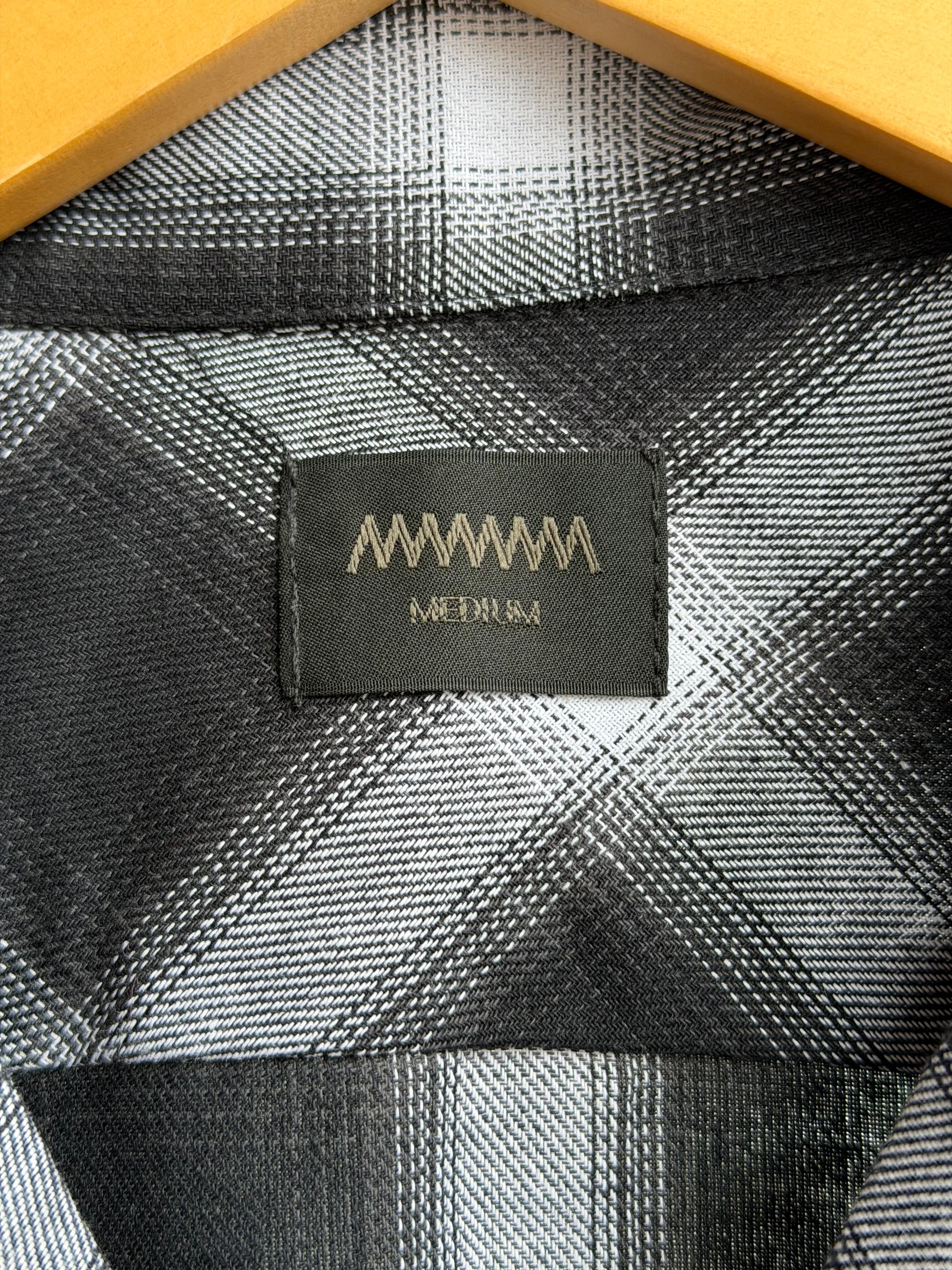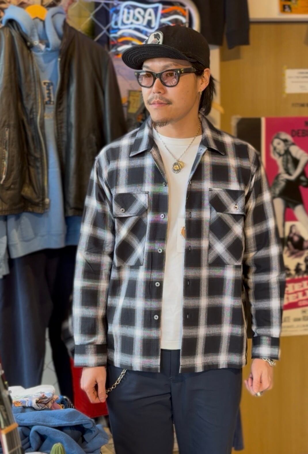 オンブレチェックオープンカラーライトフランネルシャツ M L ブラック ホワイト シャドウチェック 開襟シャツ オープンカラーシャツ ジャストサイズ 新品 ボックスシルエット アメカジ ビンテージ ヴィンテージ チェックシャツ オンブレシャツ バイカー アウトロー 不良 ルード コットン100% ombre check
