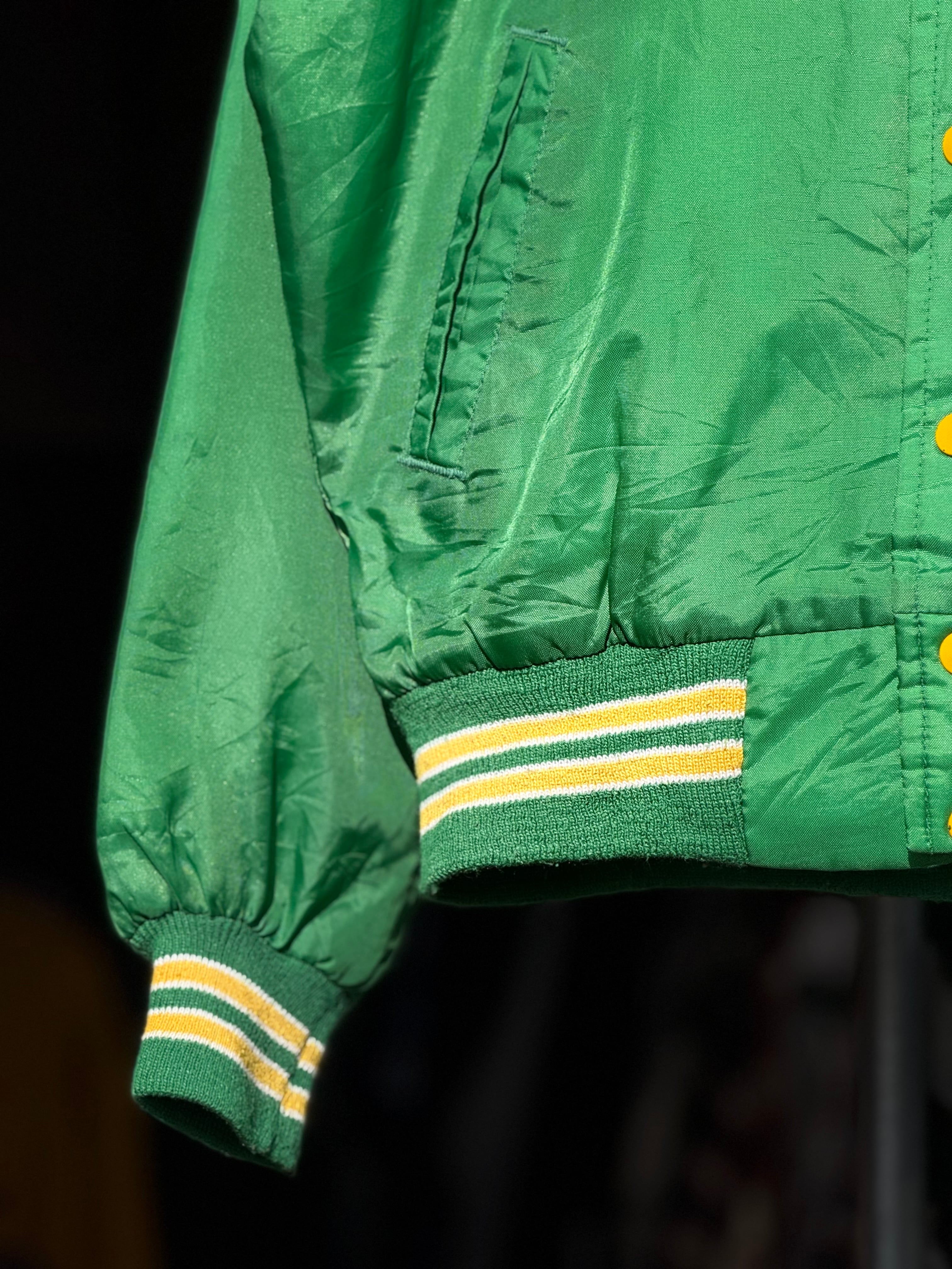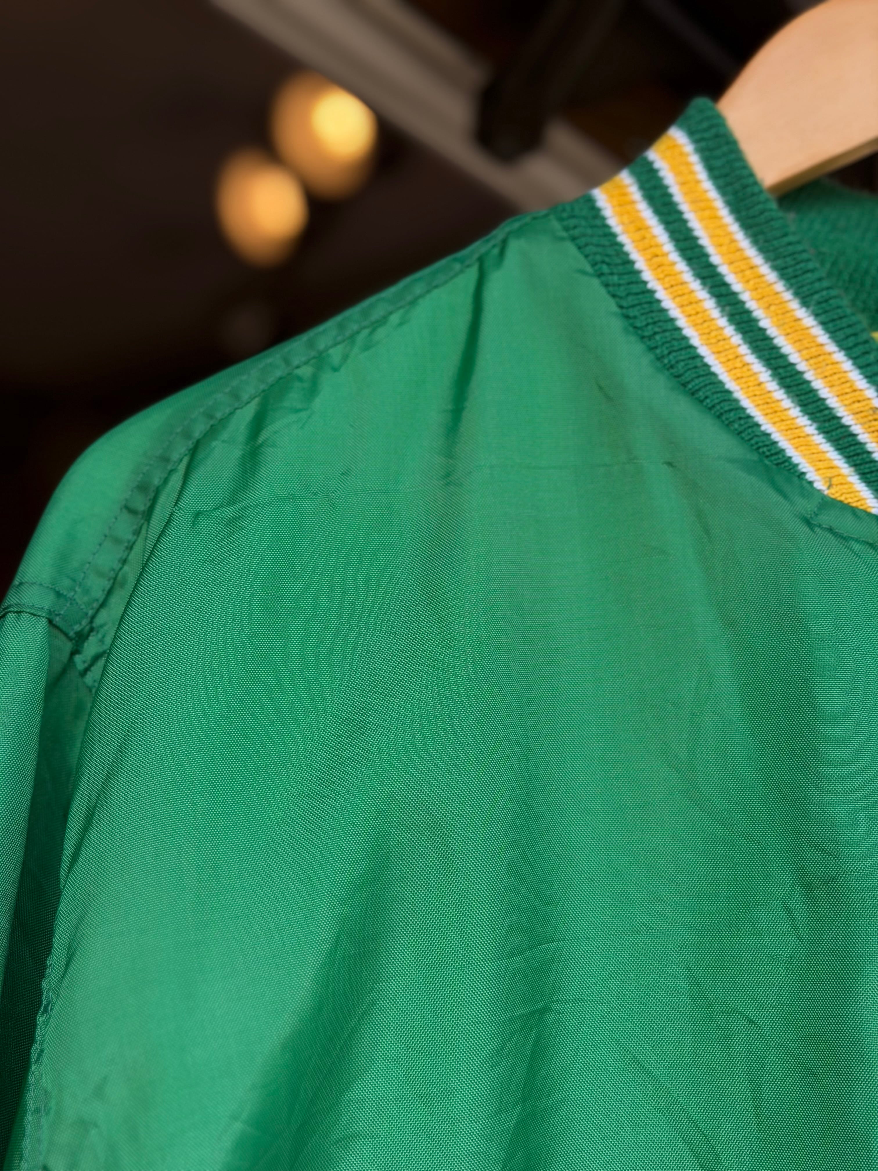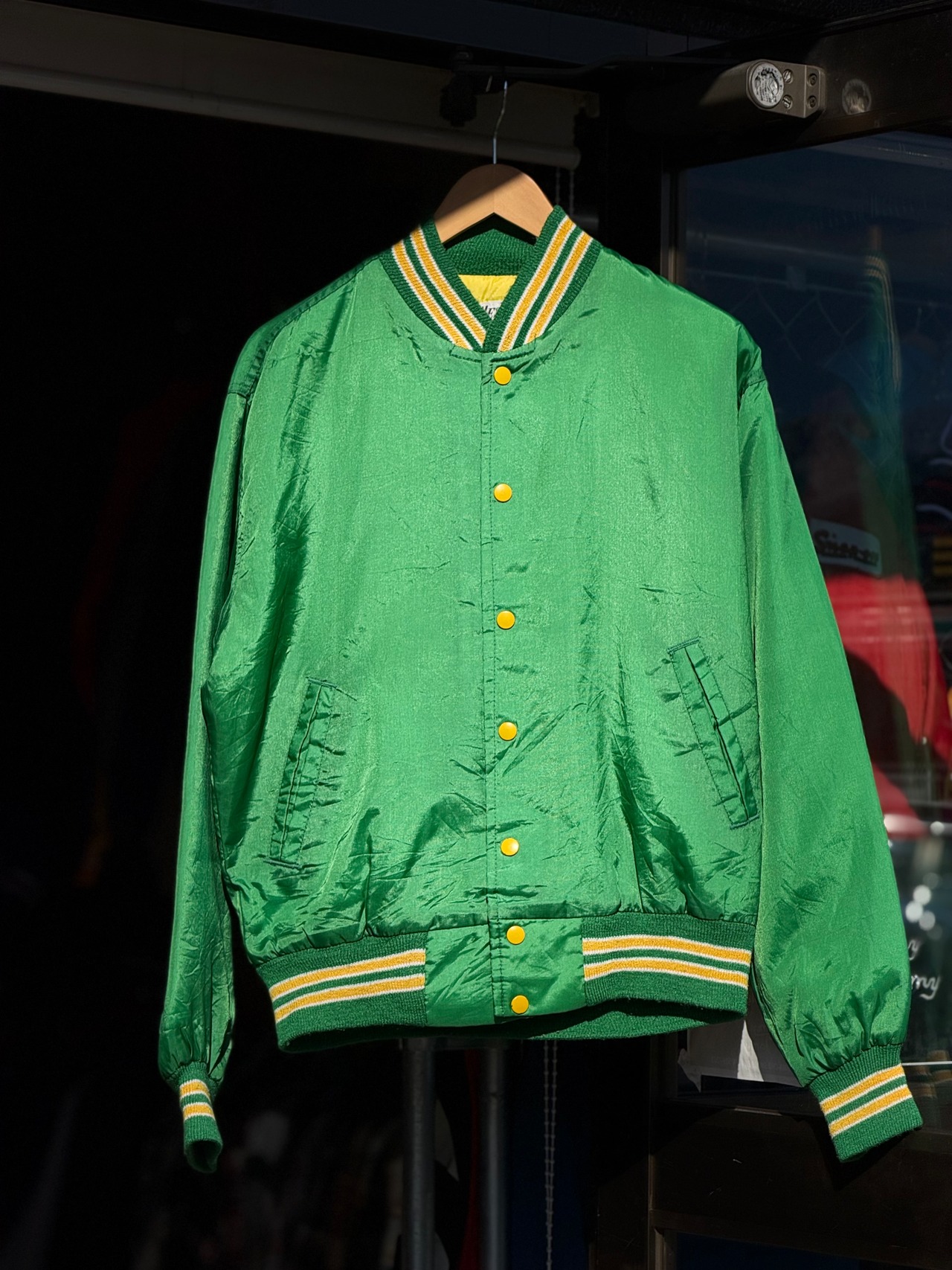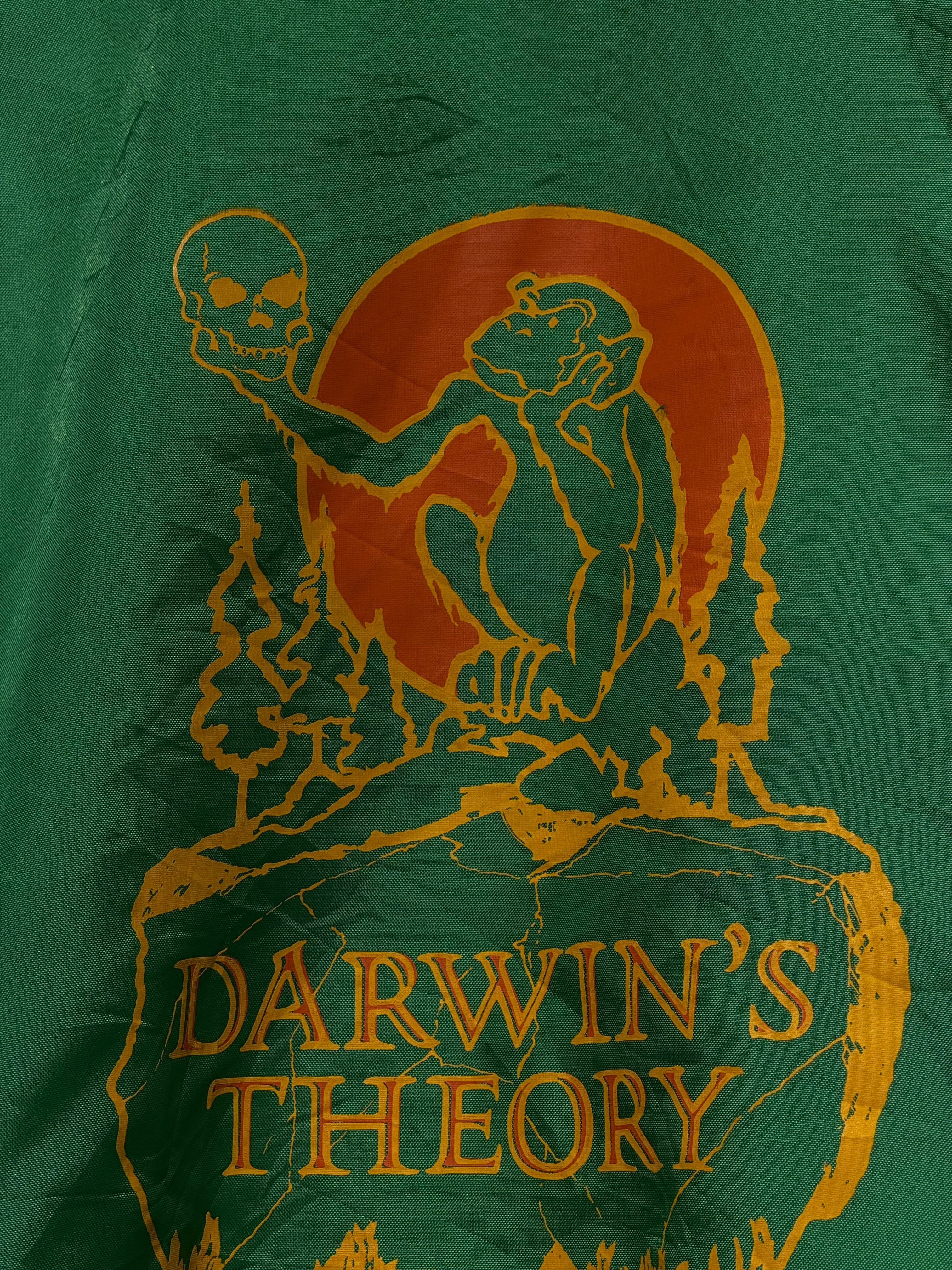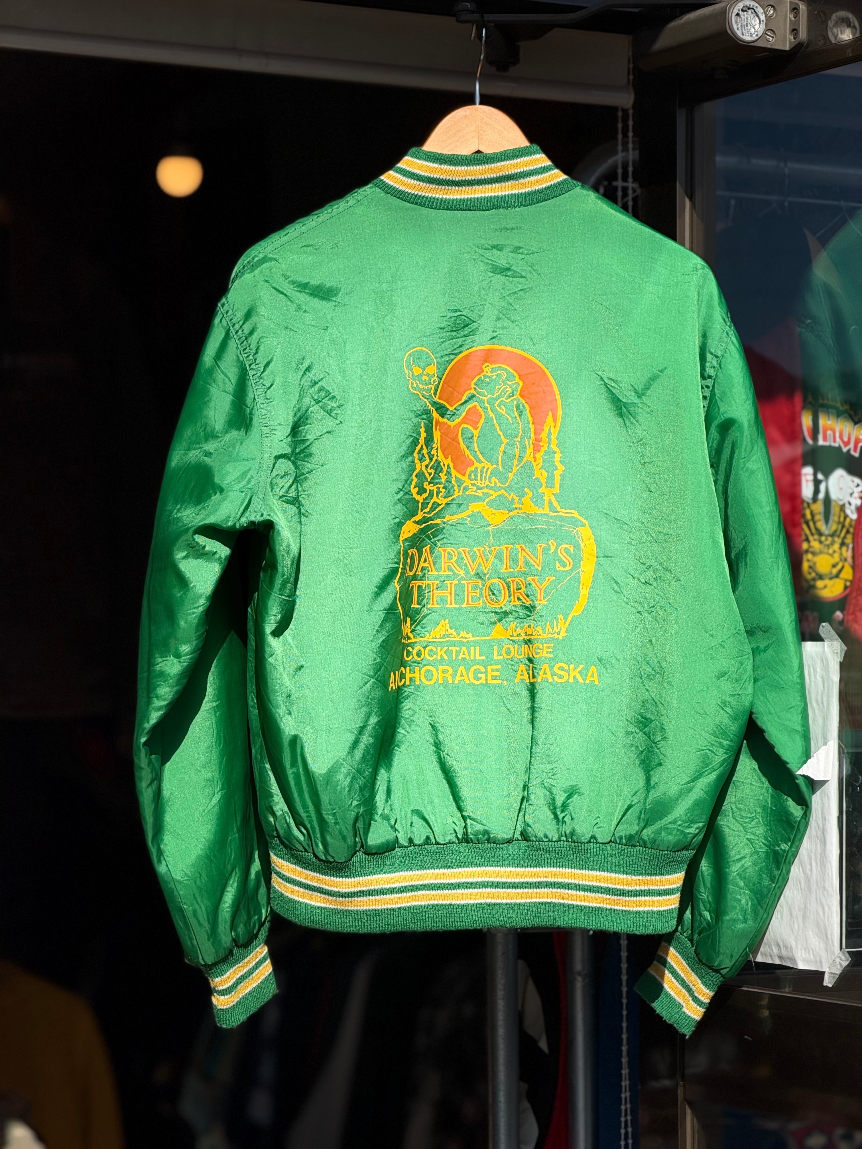 80~90's WEST WIND "DARWIN'S THEORY" 裏地キルティングナイロンスタジャン MADE IN U.S.A. Mサイズ ダーウィンの進化論 カクテルラウンジ スカル ドクロ 猿 髑髏 バー 飲食店モノ キルティングライナー 短丈 アメカジ グリーン アメリカ製 アラスカ レストラン