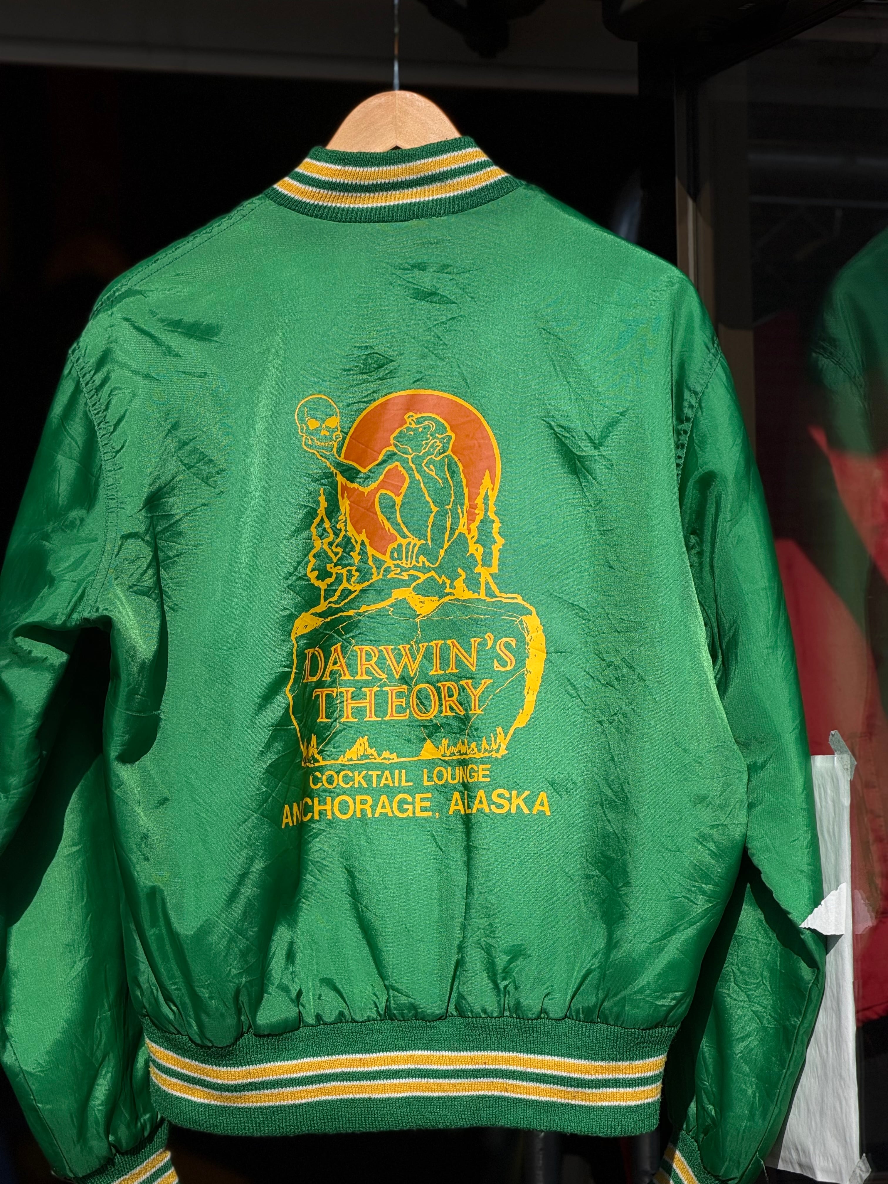 背中のプリントは"DARWIN'S THEORY"というアラスカ州アンカレジという都市に今もあるカクテルラウンジ、要はバーのデザインです。