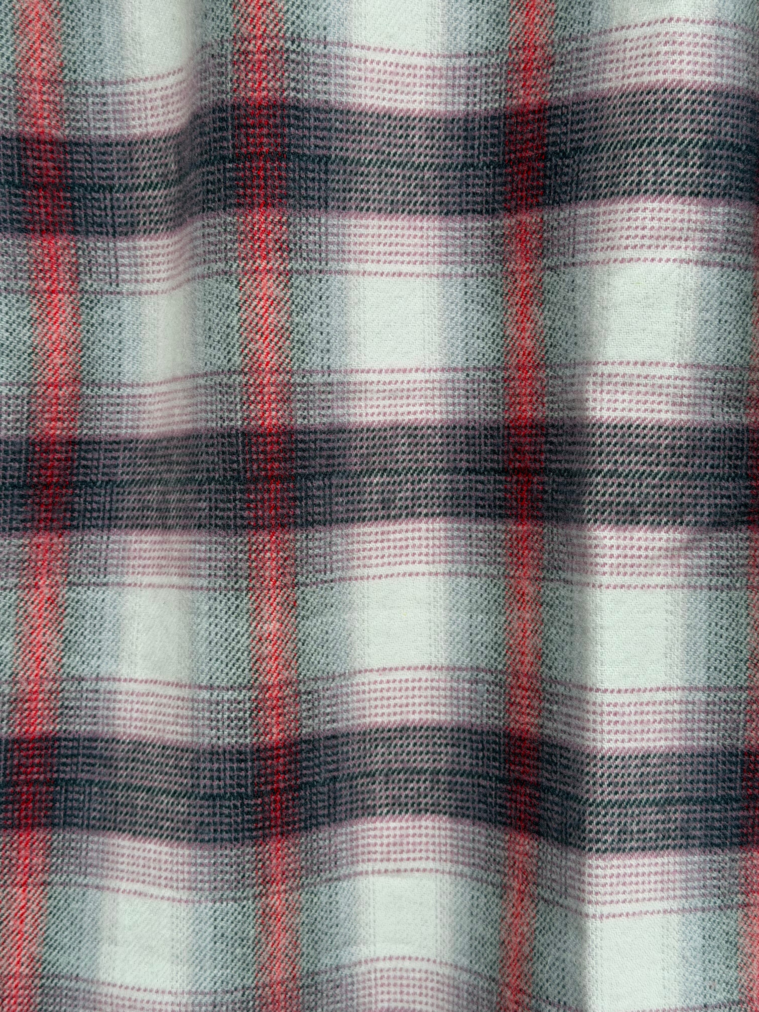 ホワイトベースにピンク、ダークグレー、レッドなどが入るオンブレチェックのパターン。