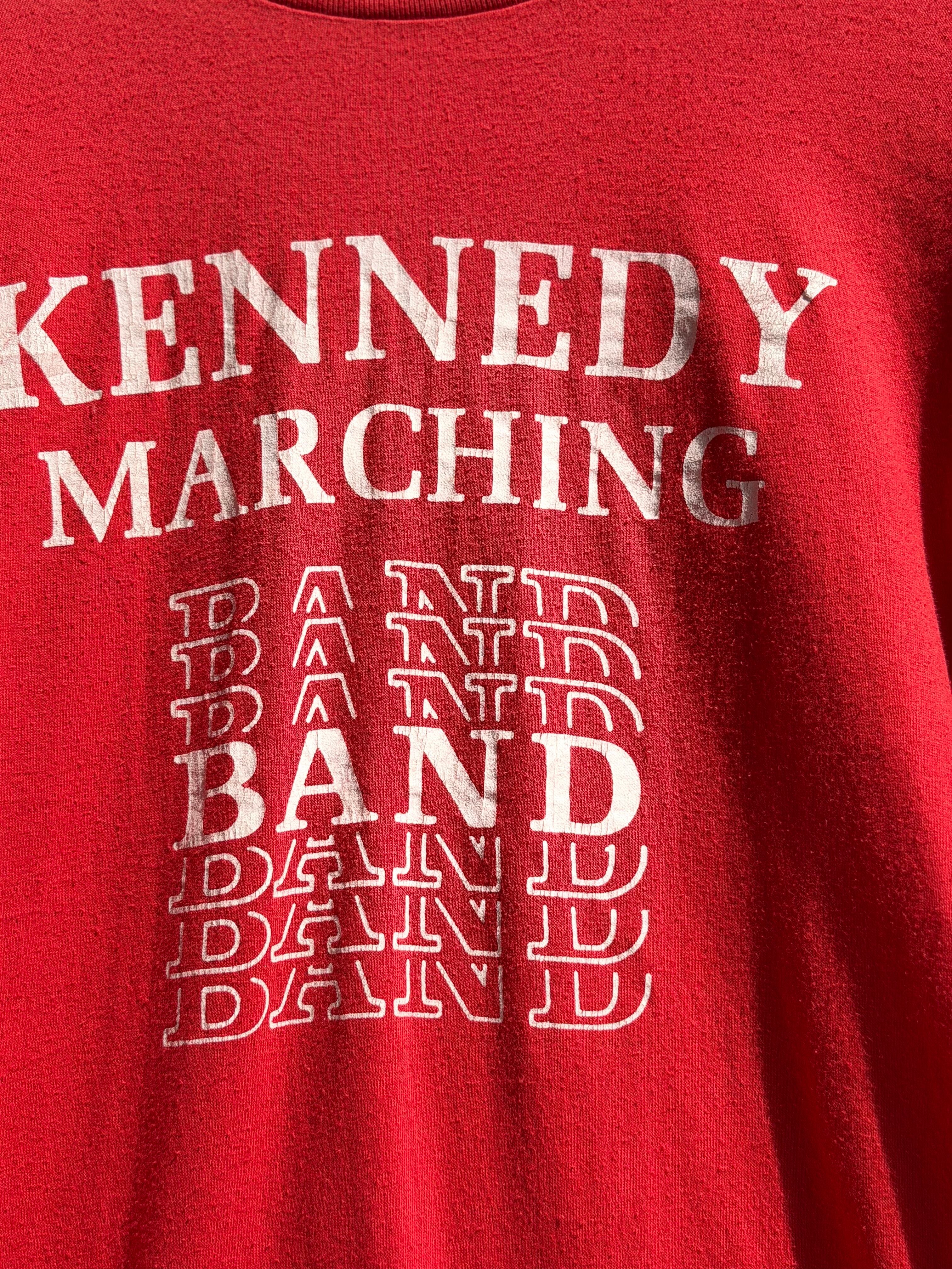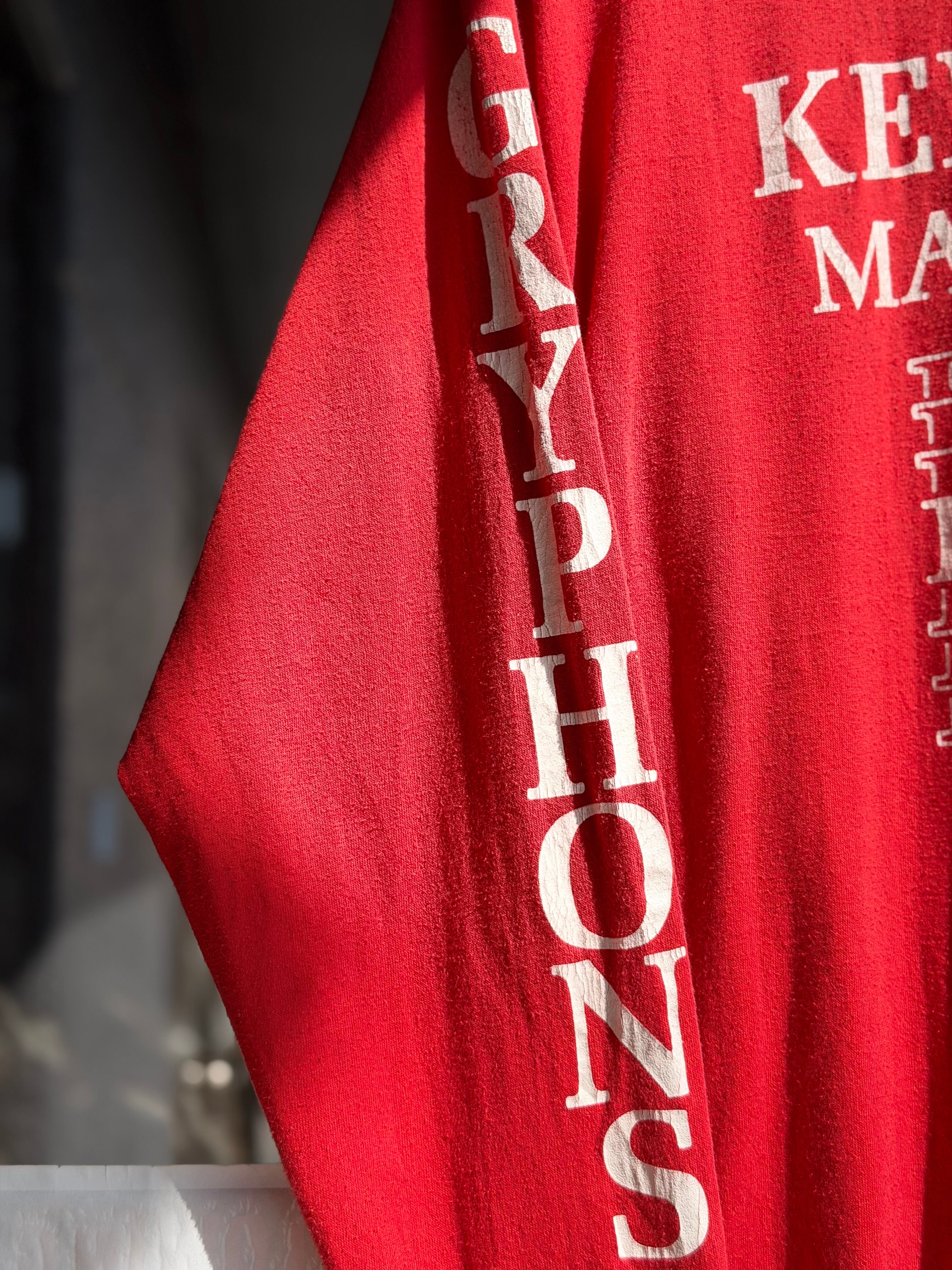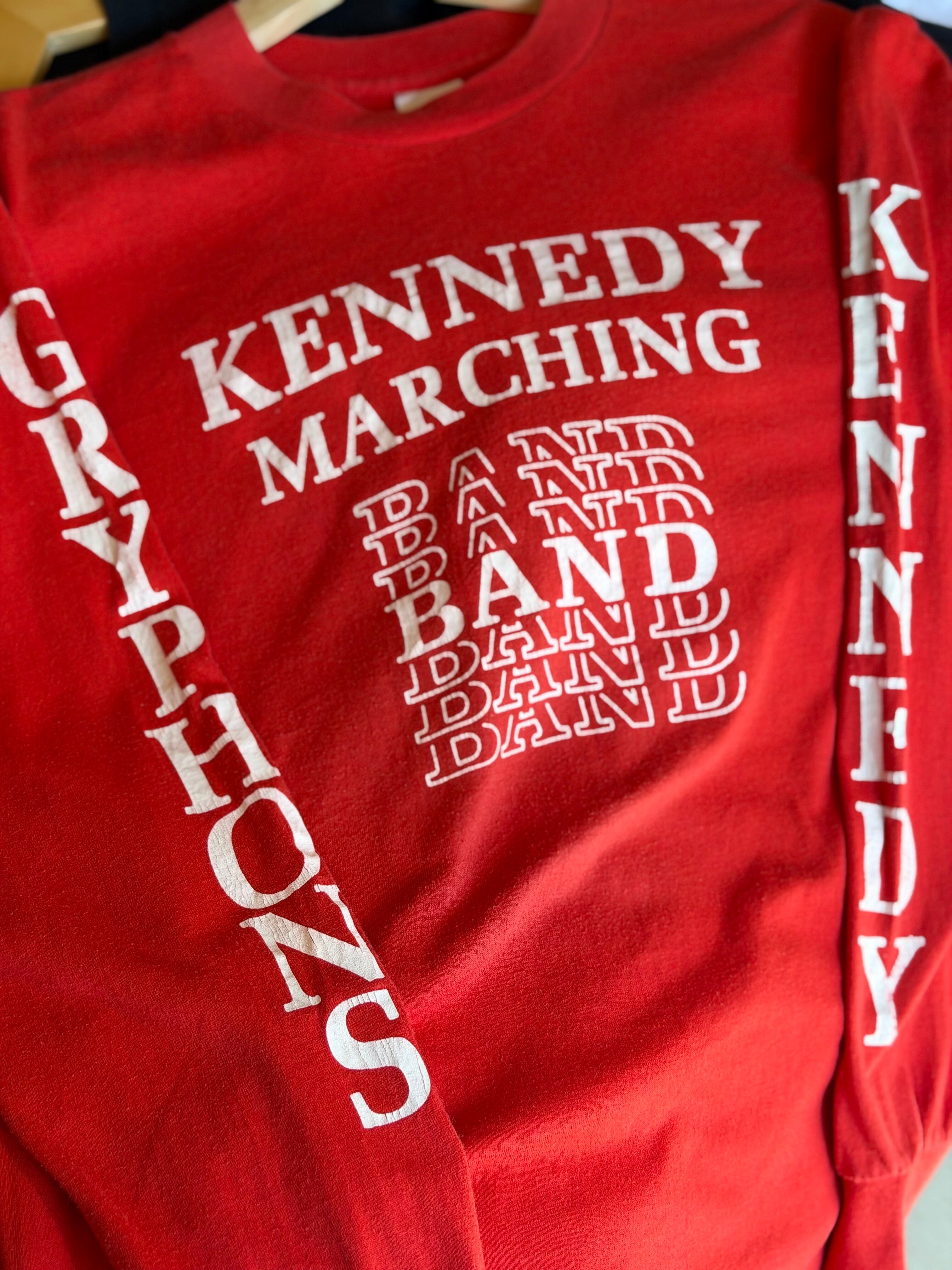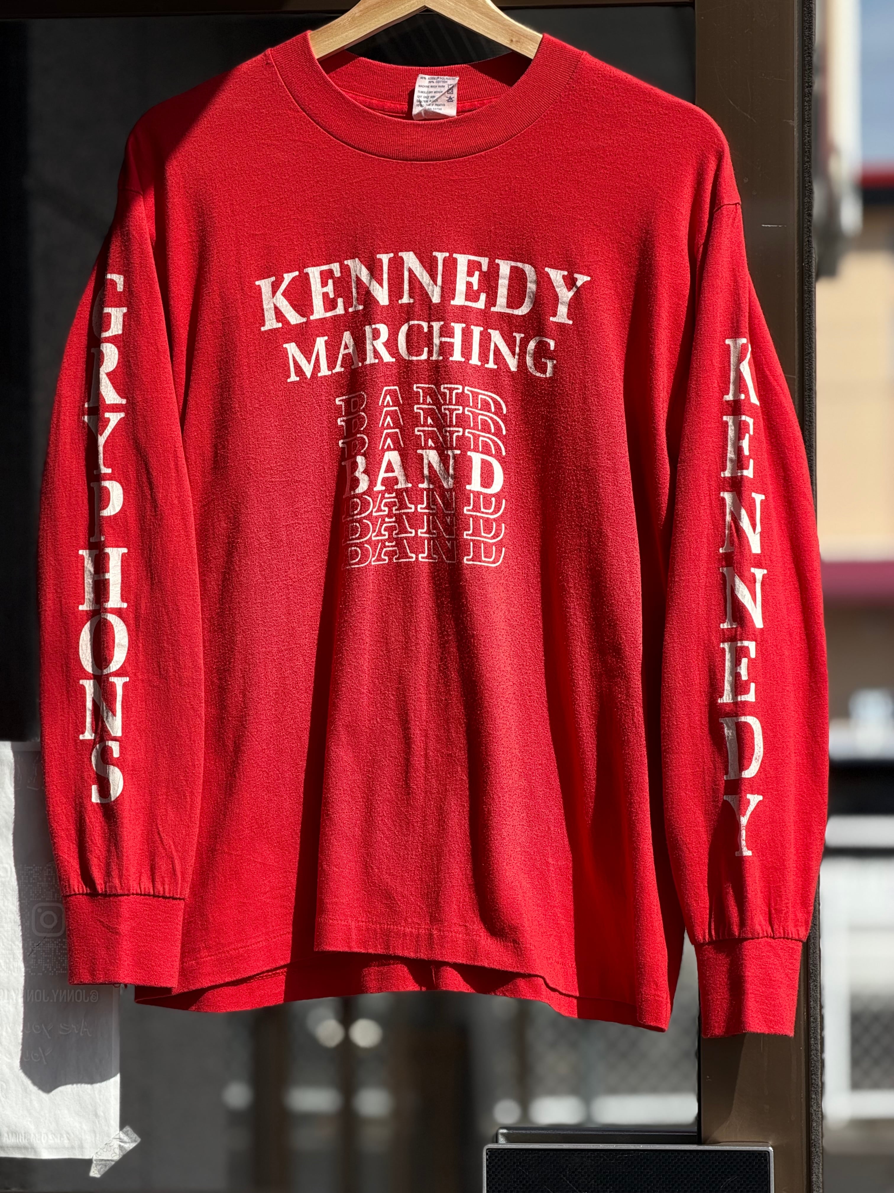 80's KENNEDY GRYPHONS MARCHING BAND 長袖Tシャツ MADE IN U.S.A. Lサイズ 赤 レッド サンフェード 褪色 アメリカ製 80年代 カレッジロゴ ケネディグリフォンズ マーチングバンド 袖プリ