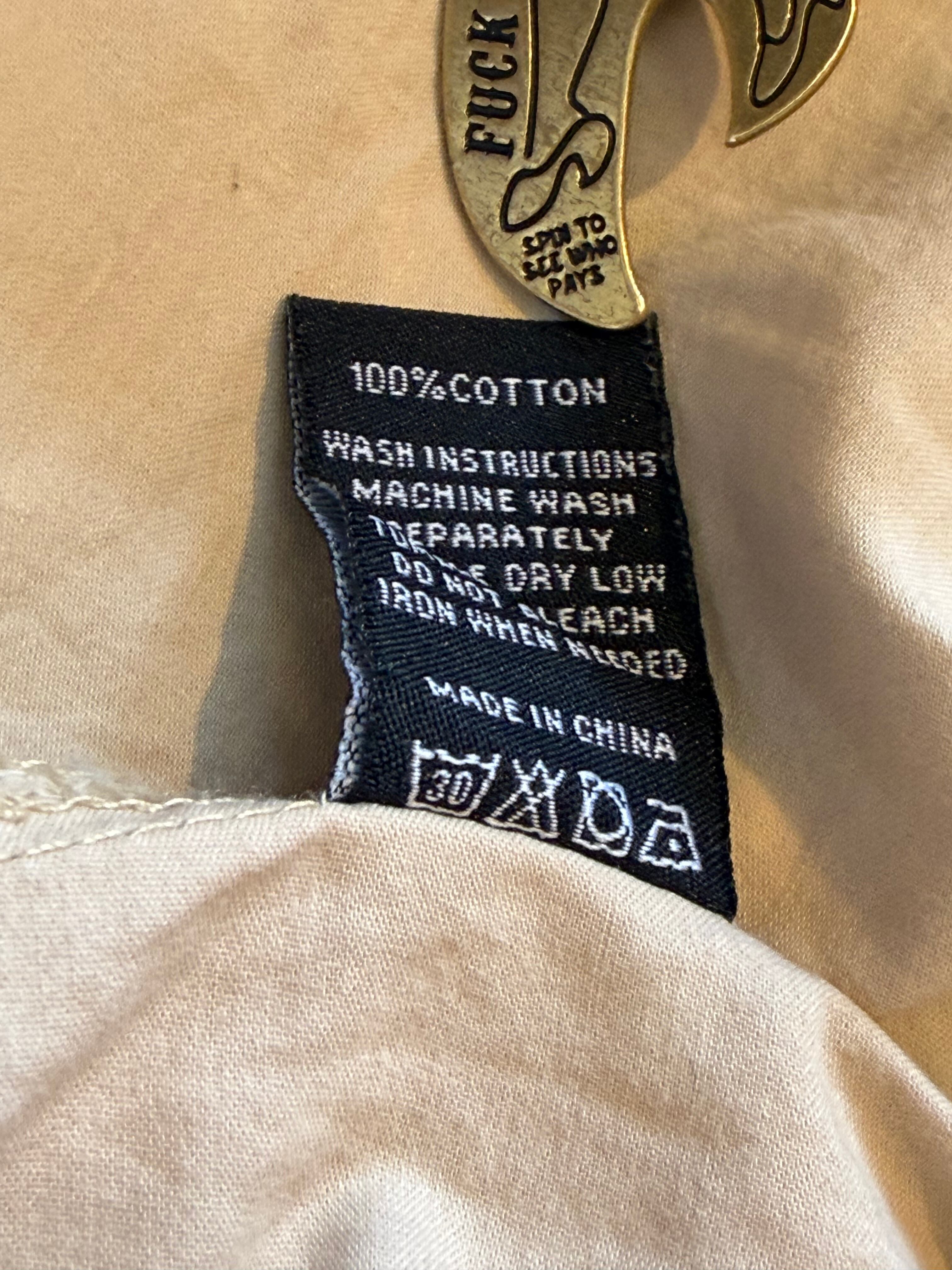 ワークシャツ然としたカーキ/ベージュカラーのコットン100%パリッとボディにブラウンのパイピングと刺繍!