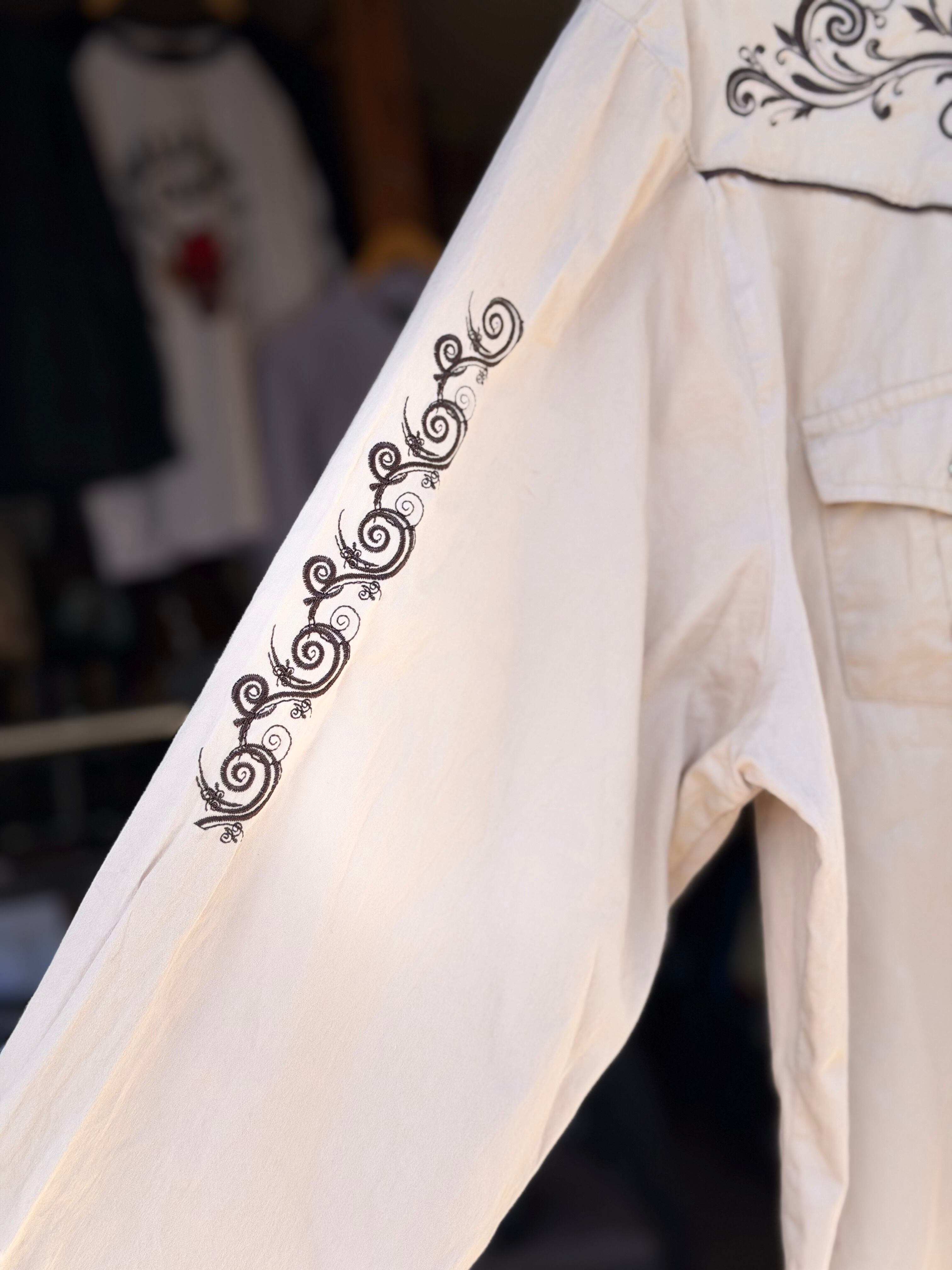 フロントは肩から裾までフロントボタンに沿って、バックは肩周りのヨーク部分にしっかり、そしてなんと両袖にまで入る豪華4面刺繍!