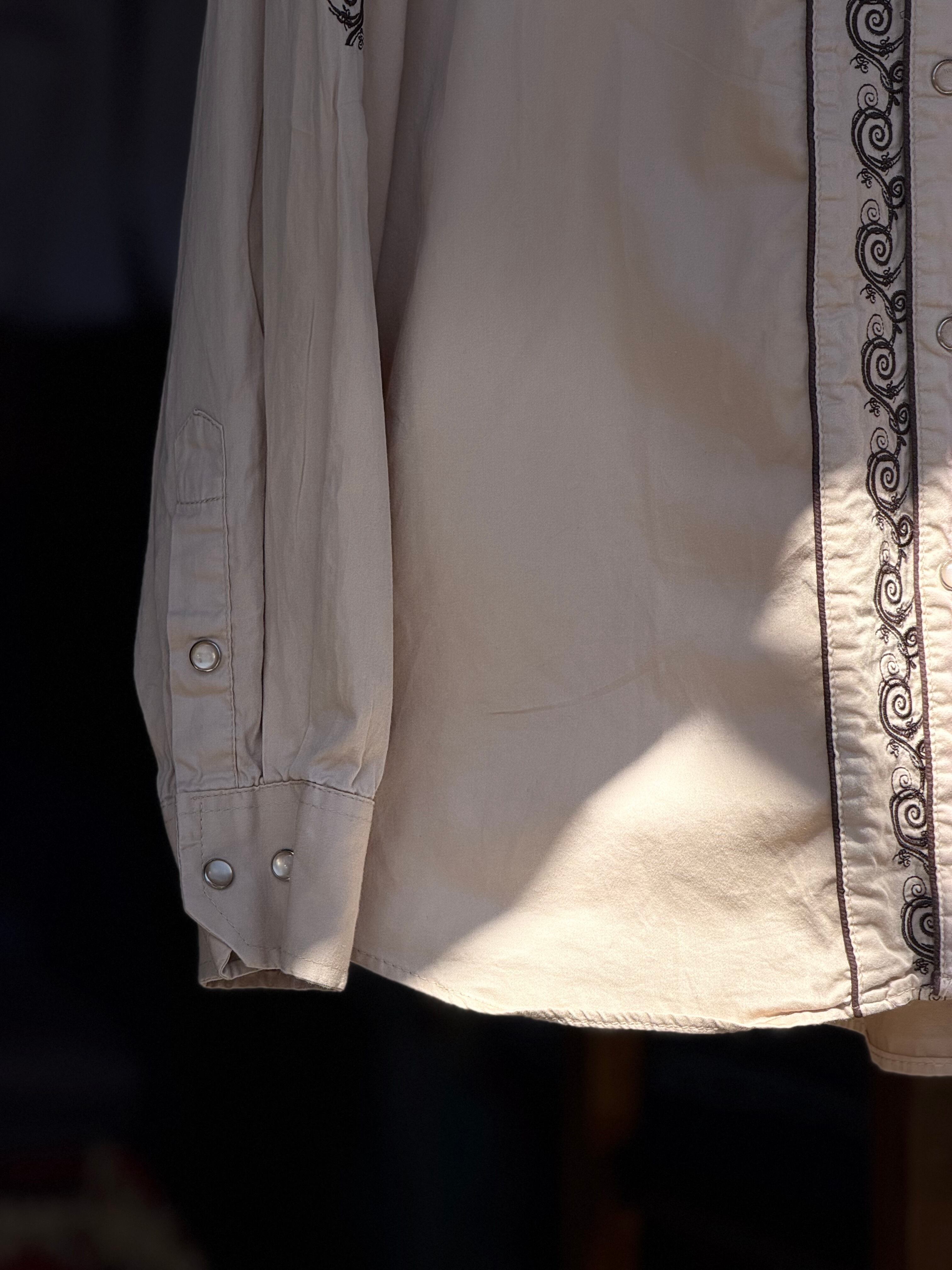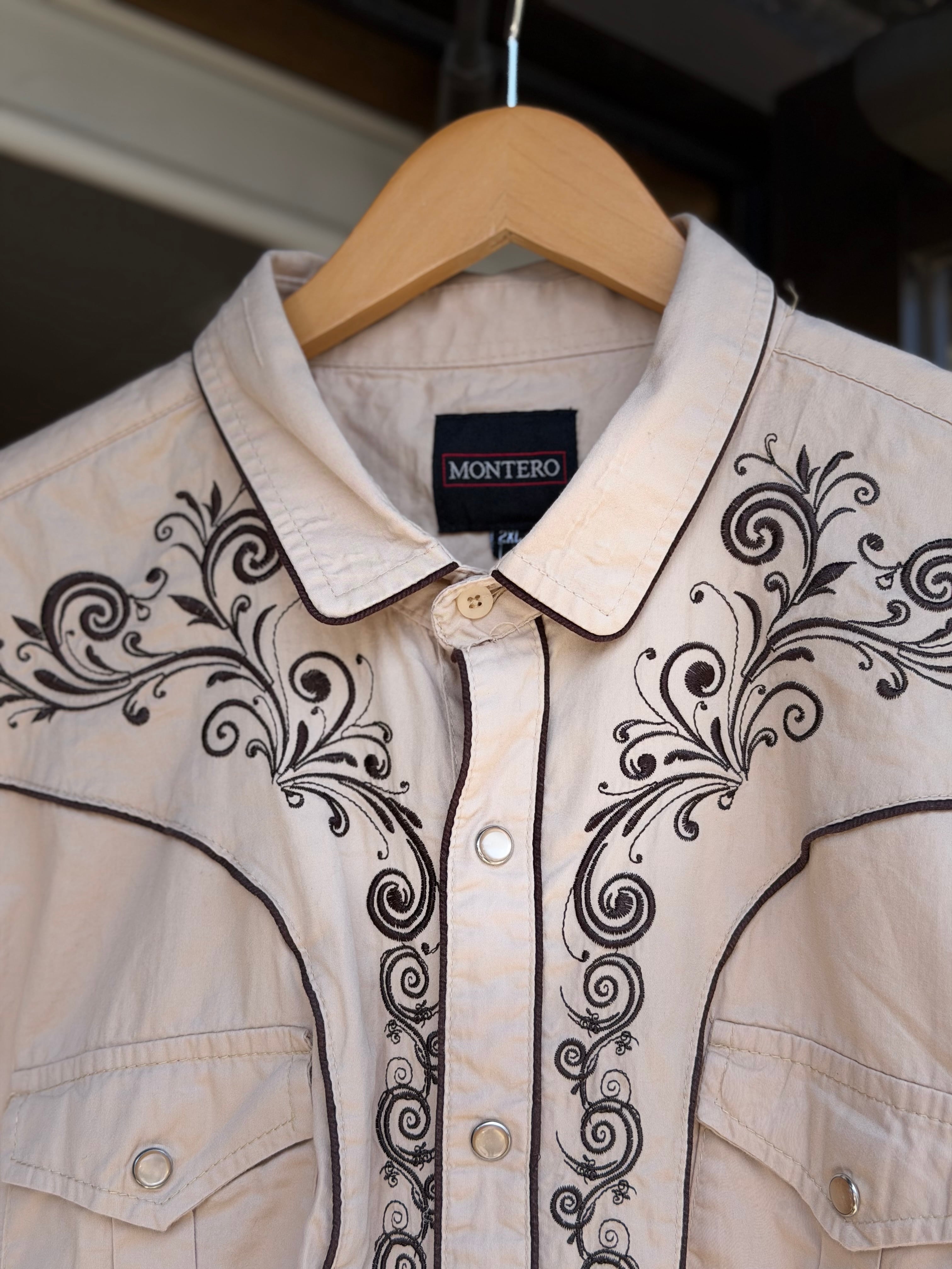 MONTERO JEANS 刺繍入りウエスタンシャツ 2XL ベージュ コットン 長袖シャツ ランチウェア カウボーイ アメカジ 古着 カーキ ブラウン アースカラー スナップボタン